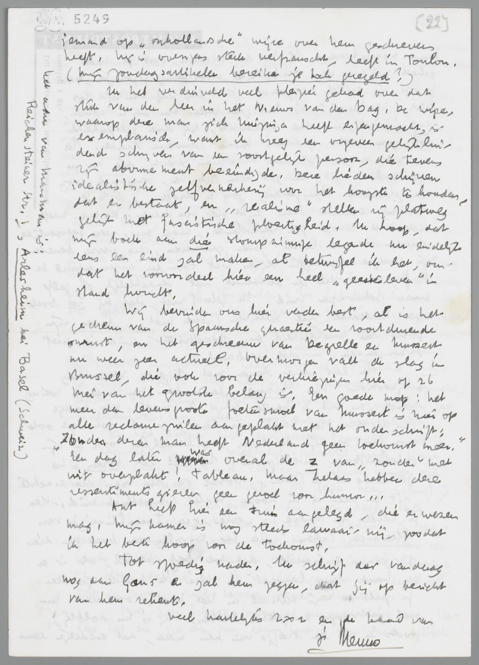Ik heb verduiveld veel pleizier gehad over dat stuk van den heer in het Nieuws van den Dag. De wijze, waarop deze man zich Huizinga heeft eigengemaakt, is exemplarisch, want ik kreeg een ongeveer gelijkluidend schrijven van een soortgelijk persoon, die tevens zijn abonnement beeindigde. Deze lieden schijnen idealistische zelfverneukerij voor het hoogste te houden, dat er bestaat, en ‘realisme’ stellen zij platweg gelijk met fascistische ploertigheid. Ik hoop, dat mijn boek aan die stompzinnige legende nu eindelijk eens een eind zal maken, al betwijfel ik het, omdat het vooroordeel hier een heel ‘geestesleven’ in stand houdt.