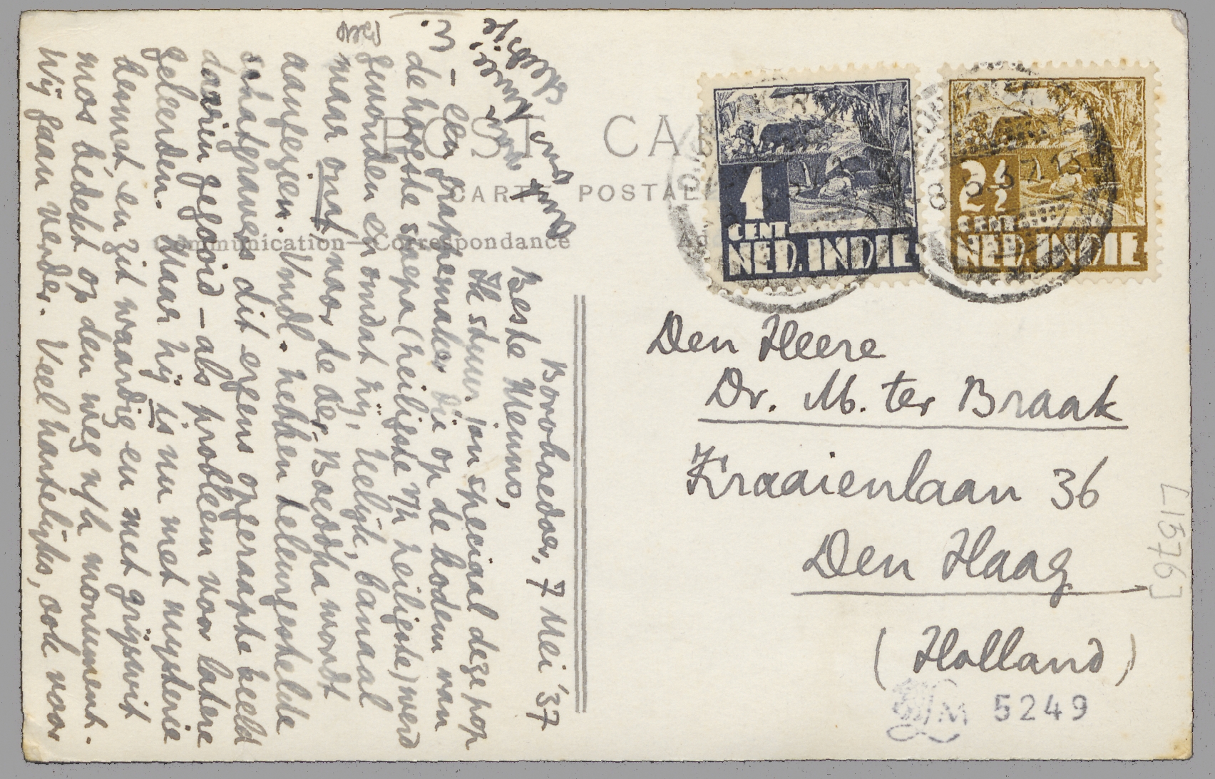 Ik stuur jou speciaal deze pop - een grappemaker die op de bodem van de hoogste stoepa (heiligste v/h heiligste) werd gevonden en omdat hij, leelijk, banaal maar onaf, voor de Oer-Boeddha wordt aangezien. Vmdl. hebben teleurgestelde schatgravers dit ergens opgeraapte beeld daarin gegooid - als probleem voor latere geleerden. Maar hij is nu met mysterie besmet, en zit waardig en met grijswit mos bedekt op den weg v/h monument. Wij gaan verder. Veel hartelijks, ook voor Ant van ons twee, steeds je