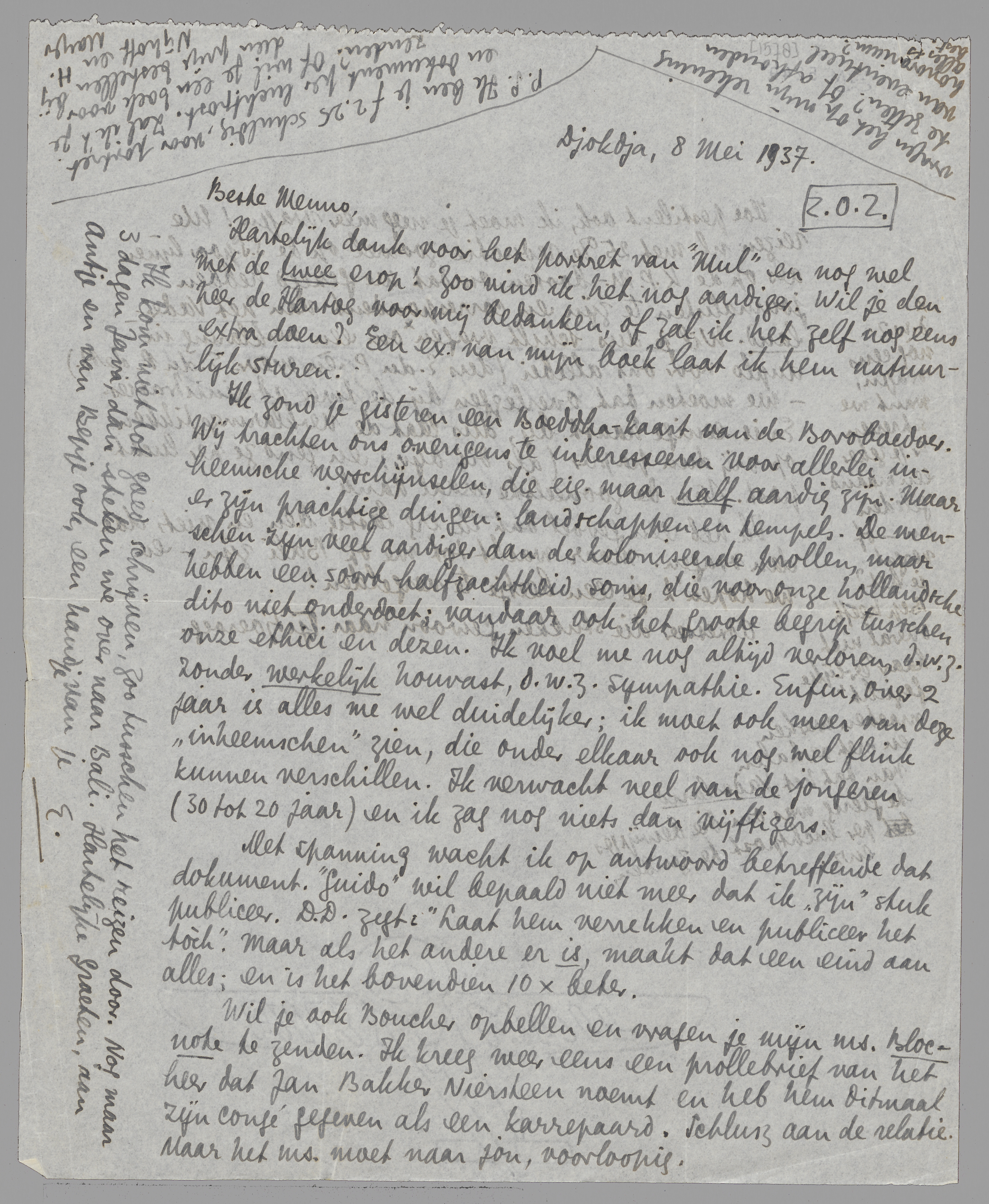 P.S. Ik ben je ƒ 2.25 schuldig, voor portret en dokument per luchtpost. Zal ik 't je zenden? Of wil je een boek voor dien prijs bestellen bij Nijhoff en H. Mayer, vragen het op mijn rekening te zetten? Of afhouden van eventueel honorarium? Alles is best.
