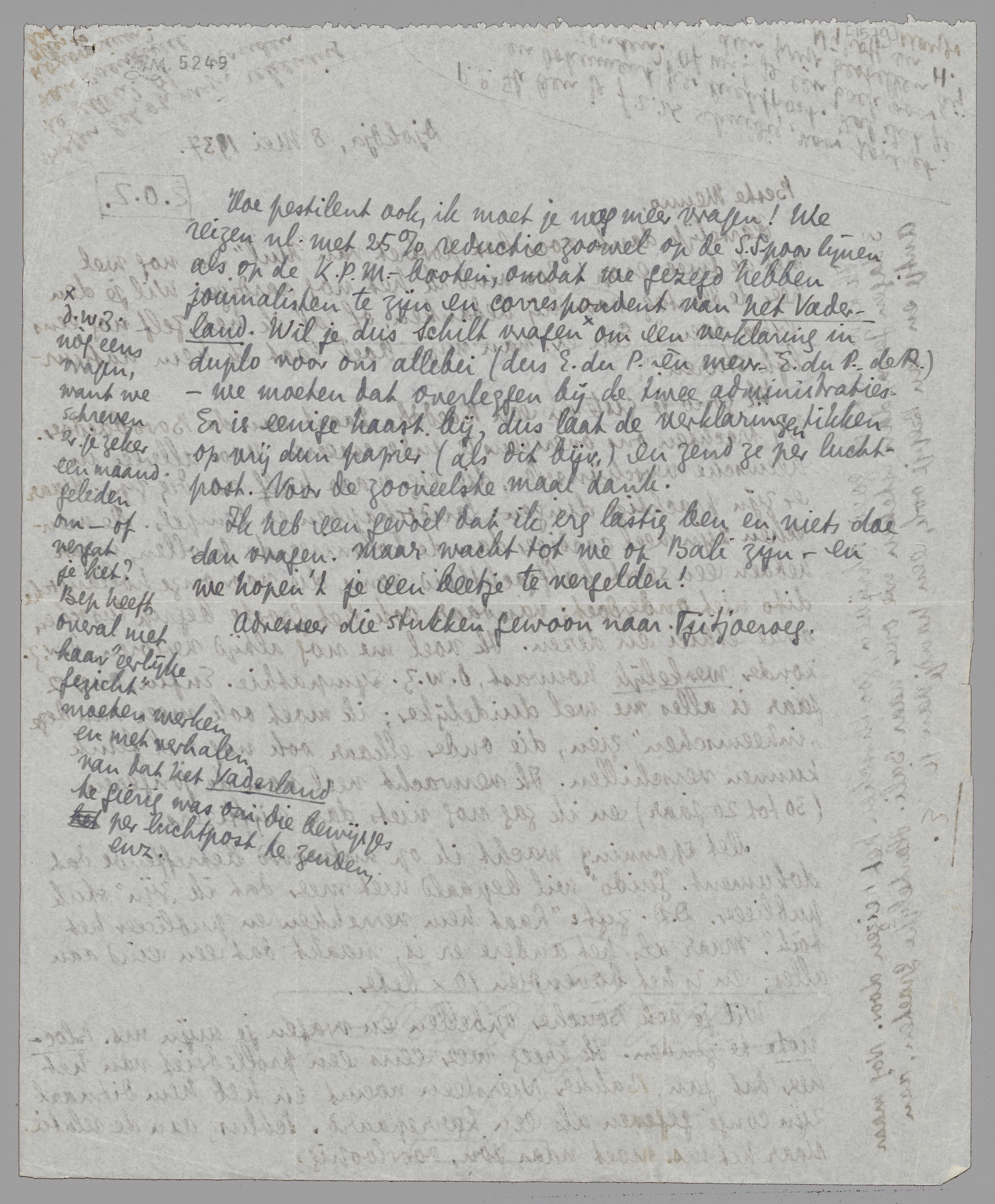 Hoe pestilent ook, ik moet je nog meer vragen! We reizen nl. met 25% reductie zoowel op de Spoorlijnen als op de K.P.M.-booten, omdat we gezegd hebben journalisten te zijn en correspondent van Het Vaderland. Wil je dus Schilt vragen [d.w.z. nòg eens vragen, want we schreven er je zeker al een maand geleden om - of vergat je het? Bep heeft overal met haar ‘eerlijke gezicht’ moeten werken en met verhalen van dat het Vaderland te gierig was om die bewijsjes per luchtpost te zenden, enz.] om een verklaring in duplo voor ons allebei (dus E. du P. èn mevr. E. du P.-de R.) - we moeten dat overleggen bij de twee administraties. Er is eenige haast bij, dus laat de verklaringen tikken op vrij dun papier (als dit bijv.) en zend ze per luchtpost. Voor de zooveelste maal dank.