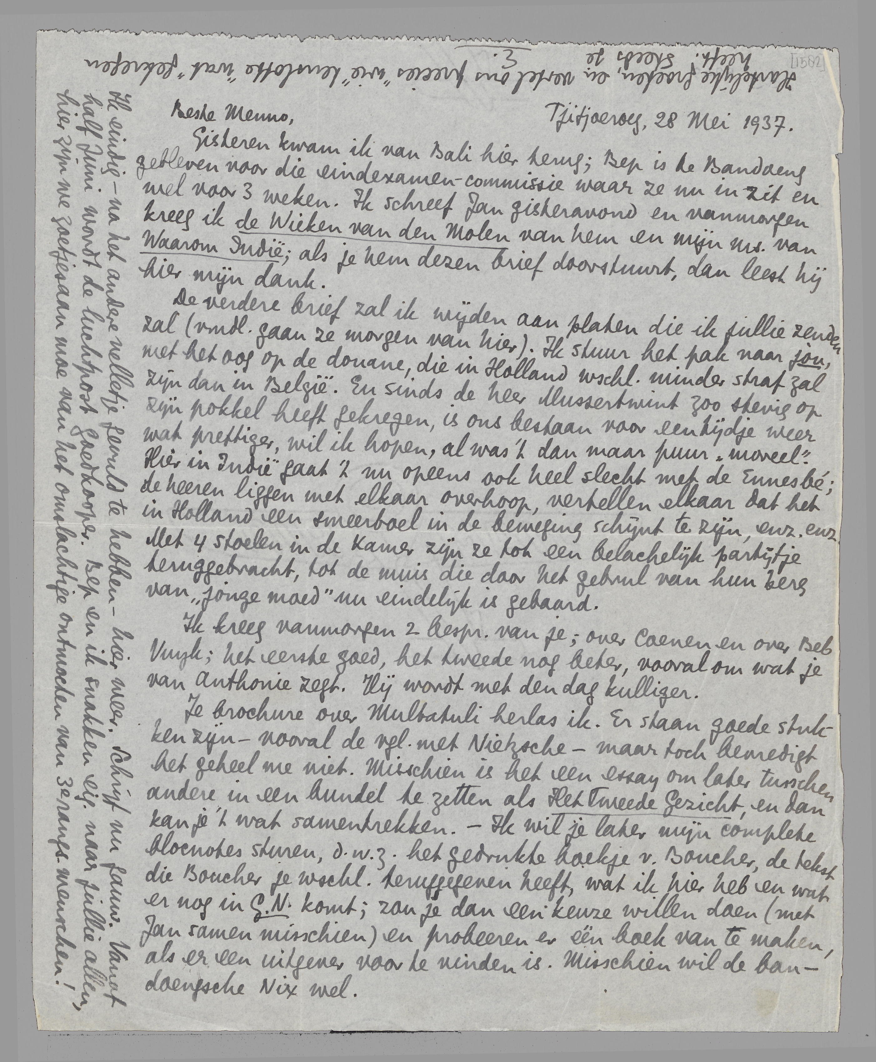 Gisteren kwam ik van Bali hier terug; Bep is te Bandoeng gebleven voor die eindexamen-commissie waar ze nu in zit en wel voor 3 weken. Ik schreef Jan gisteravond en vanmorgen kreeg ik de Wieken van den Molen van hem en mijn ms. van Waarom Indië; als je hem dezen brief doorstuurt, dan leest hij hier mijn dank.