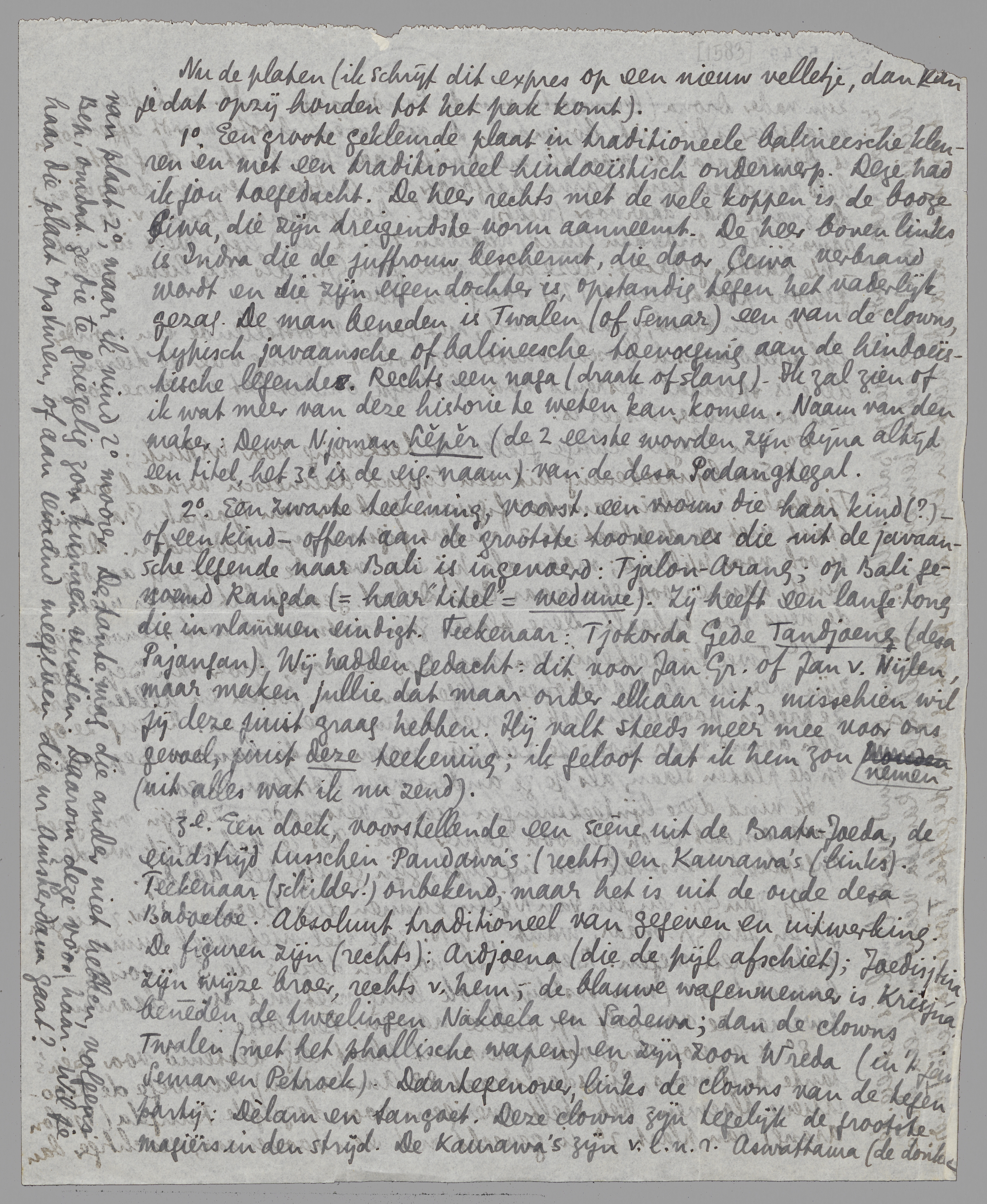 2o. Een zwarte teekening, voorst. een vrouw die haar kind (?) - of een kind - offert aan de grootste toovenares die uit de javaansche legende naar Bali is ingevoerd: Tjalon-Arang; op Bali genoemd Rangda (= haar ‘titel’ = weduwe). Zij heeft een lange tong die in vlammen eindigt. Teekenaar: Tjokorda Gede Tandjoeng (desa Pajangan). Wij hadden gedacht: dit voor Jan Gr. of Jan v. Nijlen, maar maken jullie dat maar onder elkaar uit, misschien wil jij deze juist graag hebben. Hij valt steeds meer mee voor ons gevoel, juist deze teekening; ik geloof dat ik hem zou nemen (uit alles wat ik nu zend).