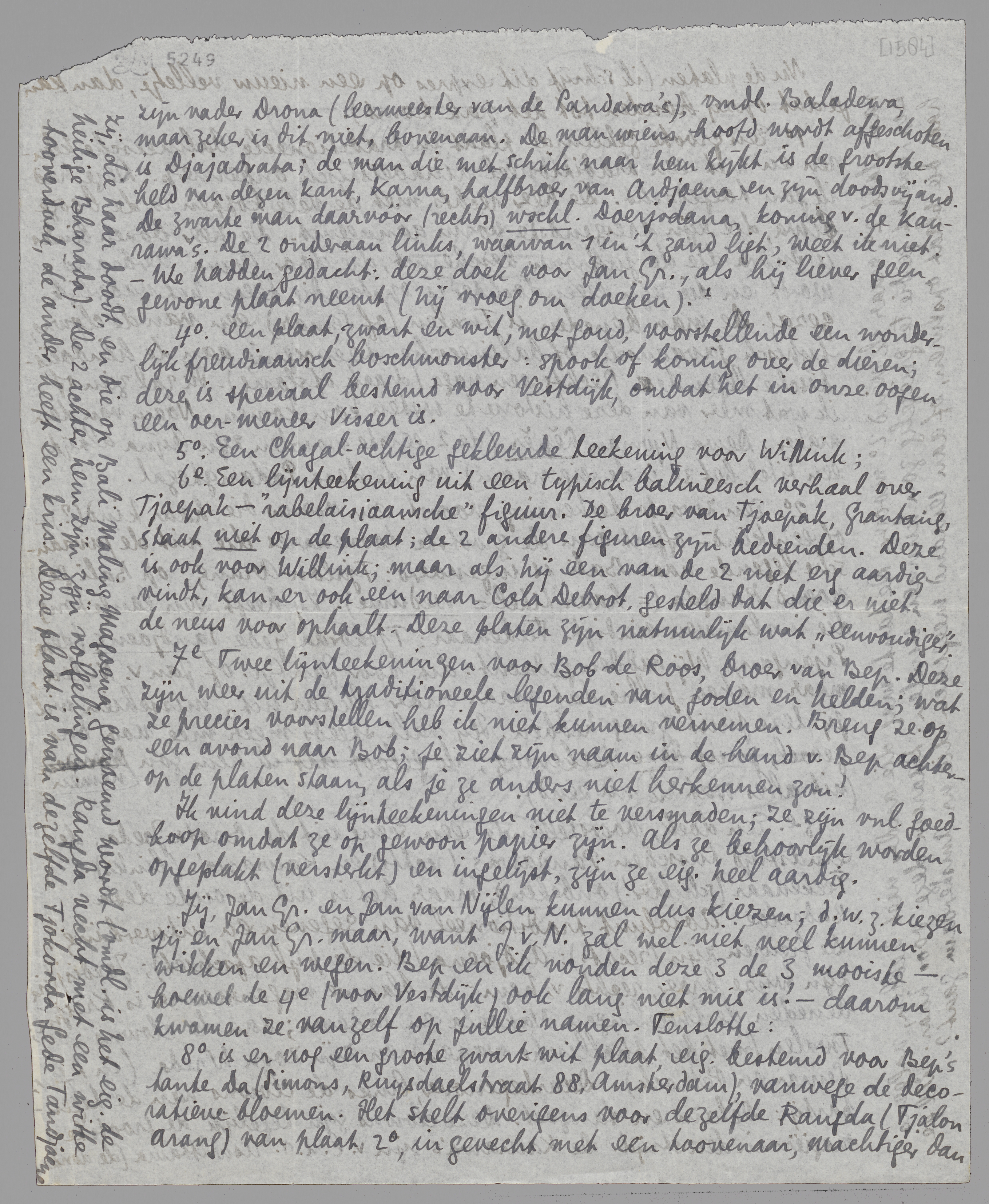 6o. Een lijnteekening uit een typisch balineesch verhaal over Tjoepak -' rabelaisiaansche' figuur. De broer van Tjoepak, Grantaing, staat niet op de plaat; de 2 andere figuren zijn bedienden. Deze is ook voor Willink; maar als hij een van de 2 niet erg aardig vindt, kan er ook een naar Cola Debrot, gesteld dat die er niet de neus voor ophaalt. Deze platen zijn natuurlijk wat ‘eenvoudiger’.
