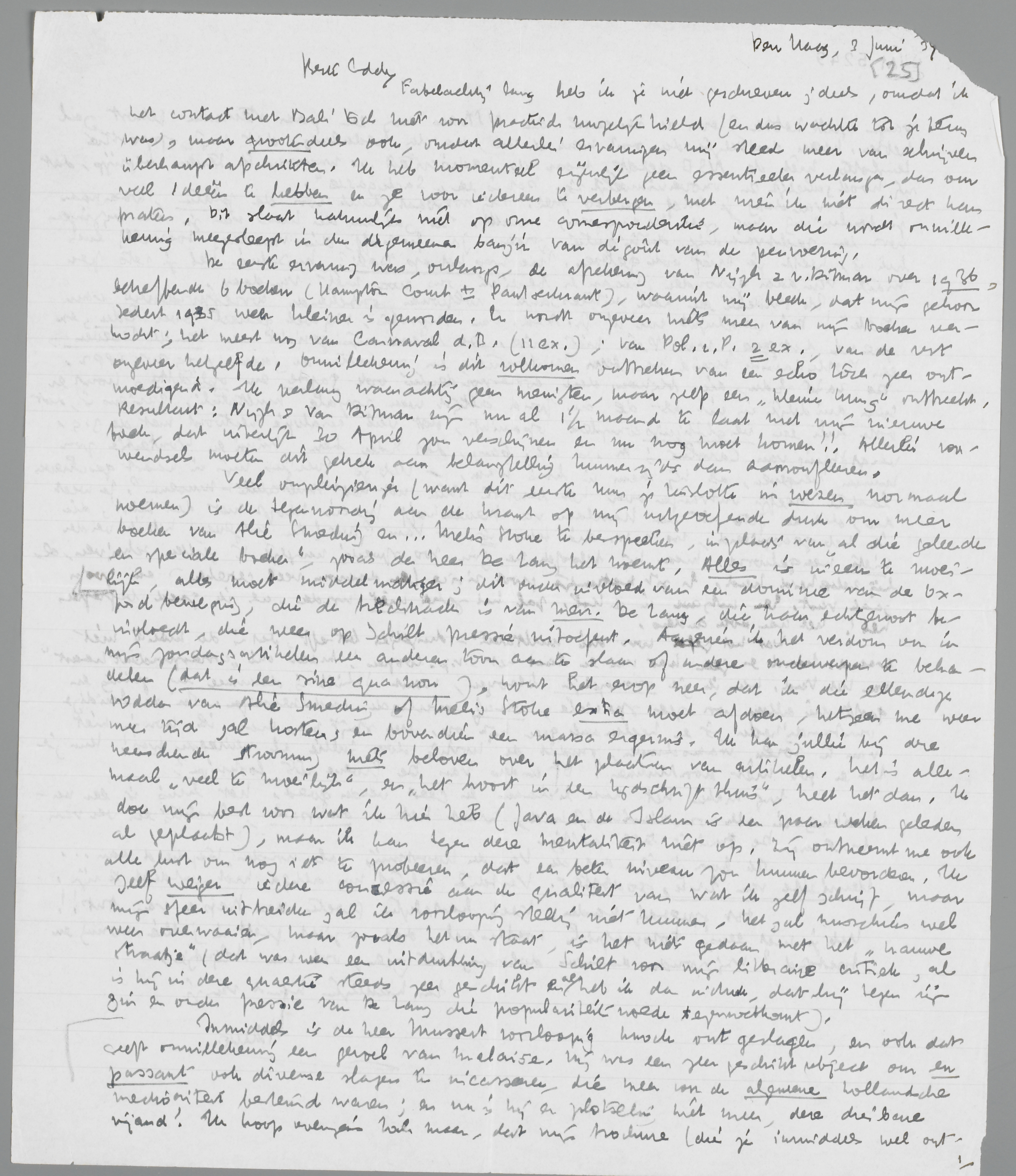 Vandaag je brief van 28 Mei. Bij voorbaat dank voor de platen, waarnaar je beschrijving mij zeer nieuwsgierig maakt. Ik zal aan de hand van je aanwijzingen voor een rechtvaardige distributie zorgen. Jan Greshoff, die vandaag toevallig even hier is, heeft je brief ook gelezen. Hoe was het op Bali? Misschien heb je iets per mail vandaar gezonden, maar er bereikte ons nog niets vandaar.