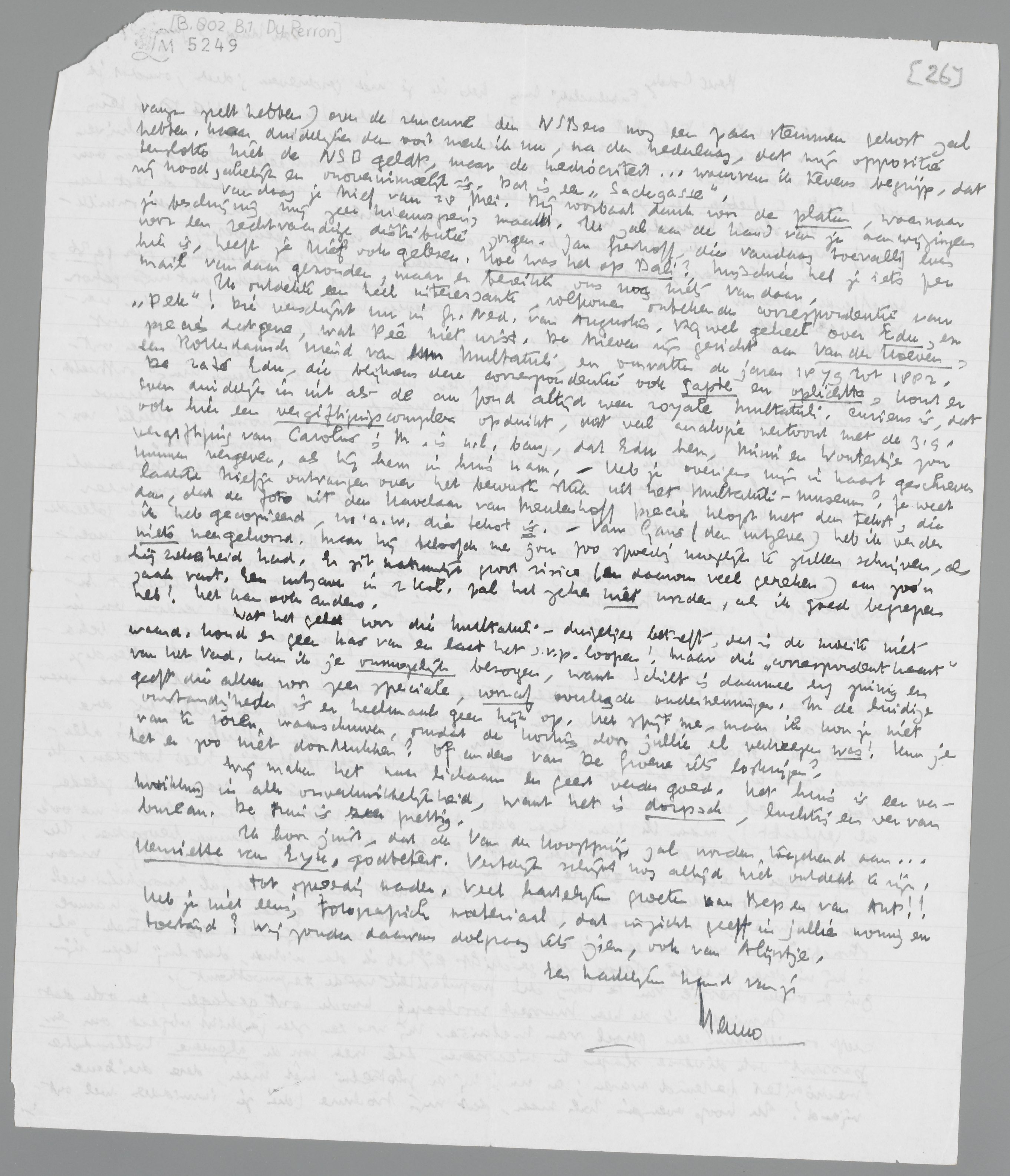 Ik ontdekte een heel interessante, volkomen onbekende correspondentie van ‘Dek’! Die verschijnt nu in Gr. Ned. van Augustus. Vrijwel geheel over Edu, en precies datgene, wat Pée niet wist. De brieven zijn gericht aan Van der Hoeven, een Rotterdamsch vriend van Multatuli, en omvatten de jaren 1879 tot 1882. De raté Edu, die blijkens deze correspondentie ook gapte en oplichtte, komt er even duidelijk in uit als de au fond altijd weer royale Multatuli. Curieus is, dat ook hier een vergiftigings-complex opduikt, dat veel analogie vertoont met de z.g. vergiftiging van Carolus; M. is n.l. bang, dat Edu hem, Mimi en Woutertje zou kunnen vergeven, als hij hem in huis nam. - Heb je overigens mijn in haast geschreven laatste briefje ontvangen over het bewuste stuk uit het Multatuli-museum? Je weet dan, dat de foto uit den Havelaar van Meulenhoff precies klopt met den tekst, die ik heb gecopieerd, m.a.w. die tekst is. - Van Gans (den uitgever) heb ik verder niets meer gehoord. Maar hij beloofde me jou zoo spoedig mogelijk te zullen schrijven, als hij zekerheid had. Er zit natuurlijk groot risico (en daarom veel gereken) aan zoo'n zaak vast. Een uitgave in 2 kol. zal het zeker niet worden, als ik goed begrepen heb! Het kan ook anders.