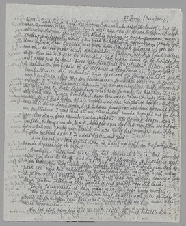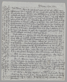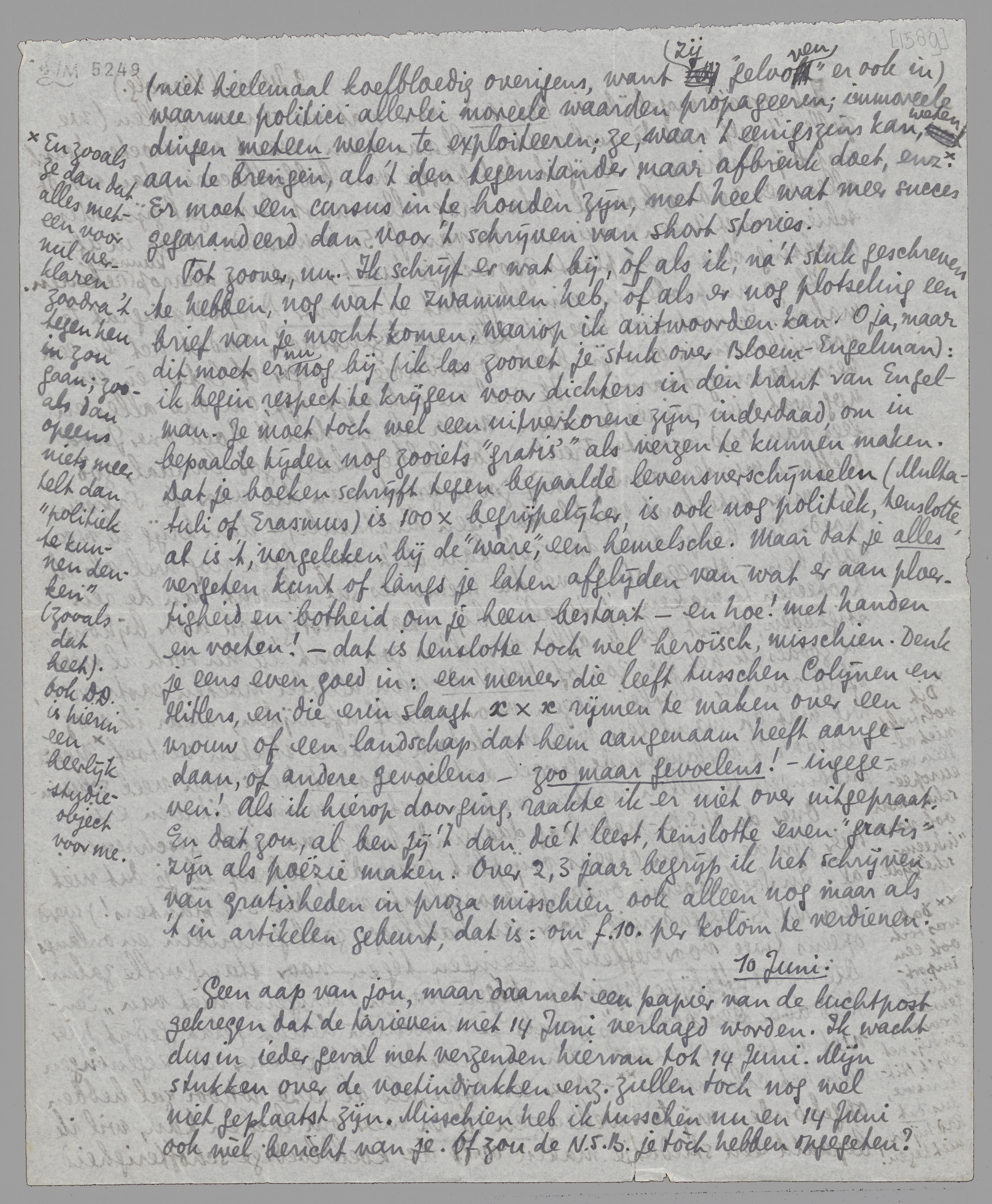 Geen aap van jou, maar daarnet een papier van de luchtpost gekregen dat de tarieven met 14 Juni verlaagd worden. Ik wacht dus in ieder geval met verzenden hiervan tot 14 Juni. Mijn stukken over de voetindrukken enz. zullen toch nog wel niet geplaatst zijn. Misschien heb ik tusschen nu en 14 Juni ook wèl bericht van je. Of zou de N.S.B. je tòch hebben opgegeten?