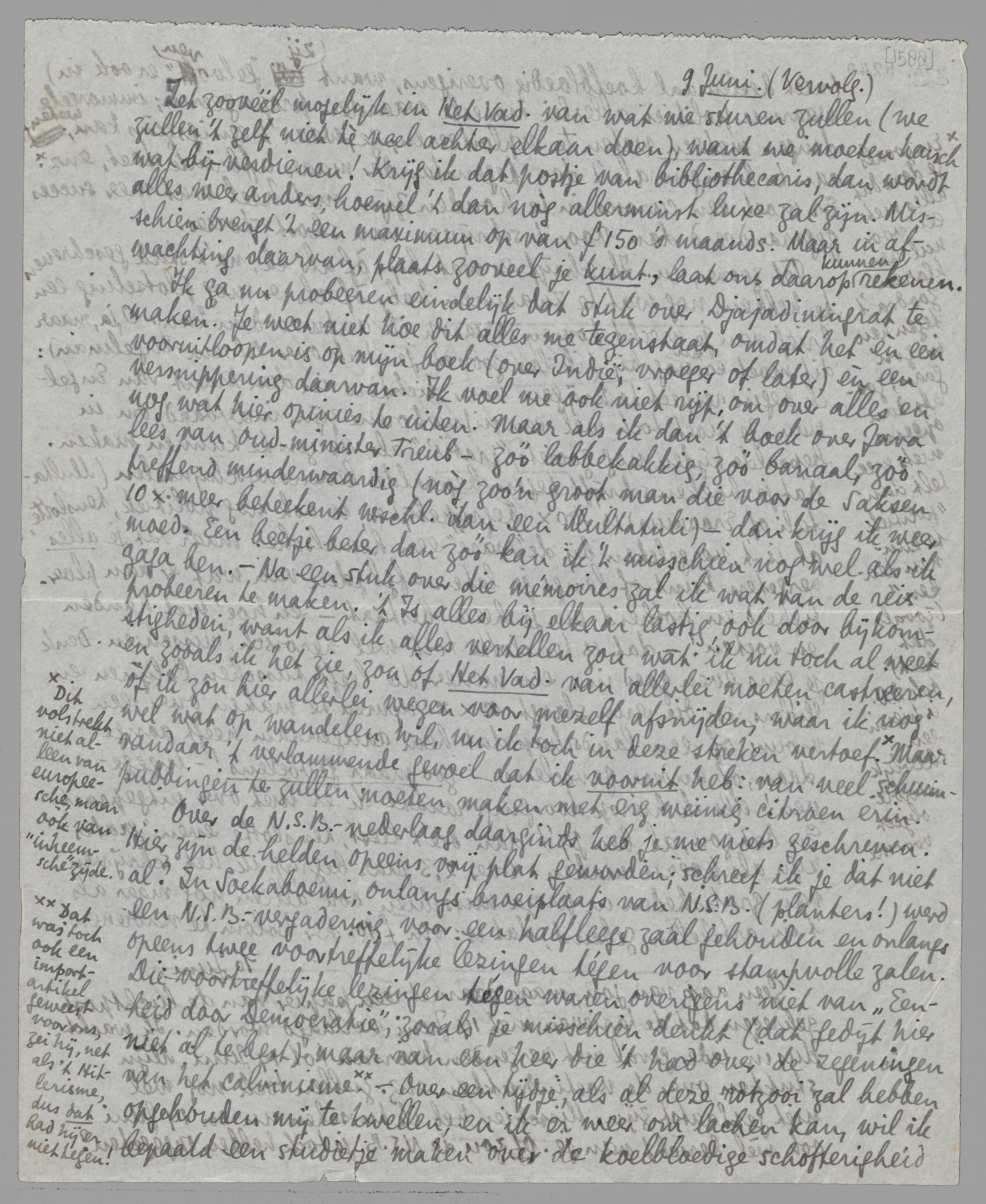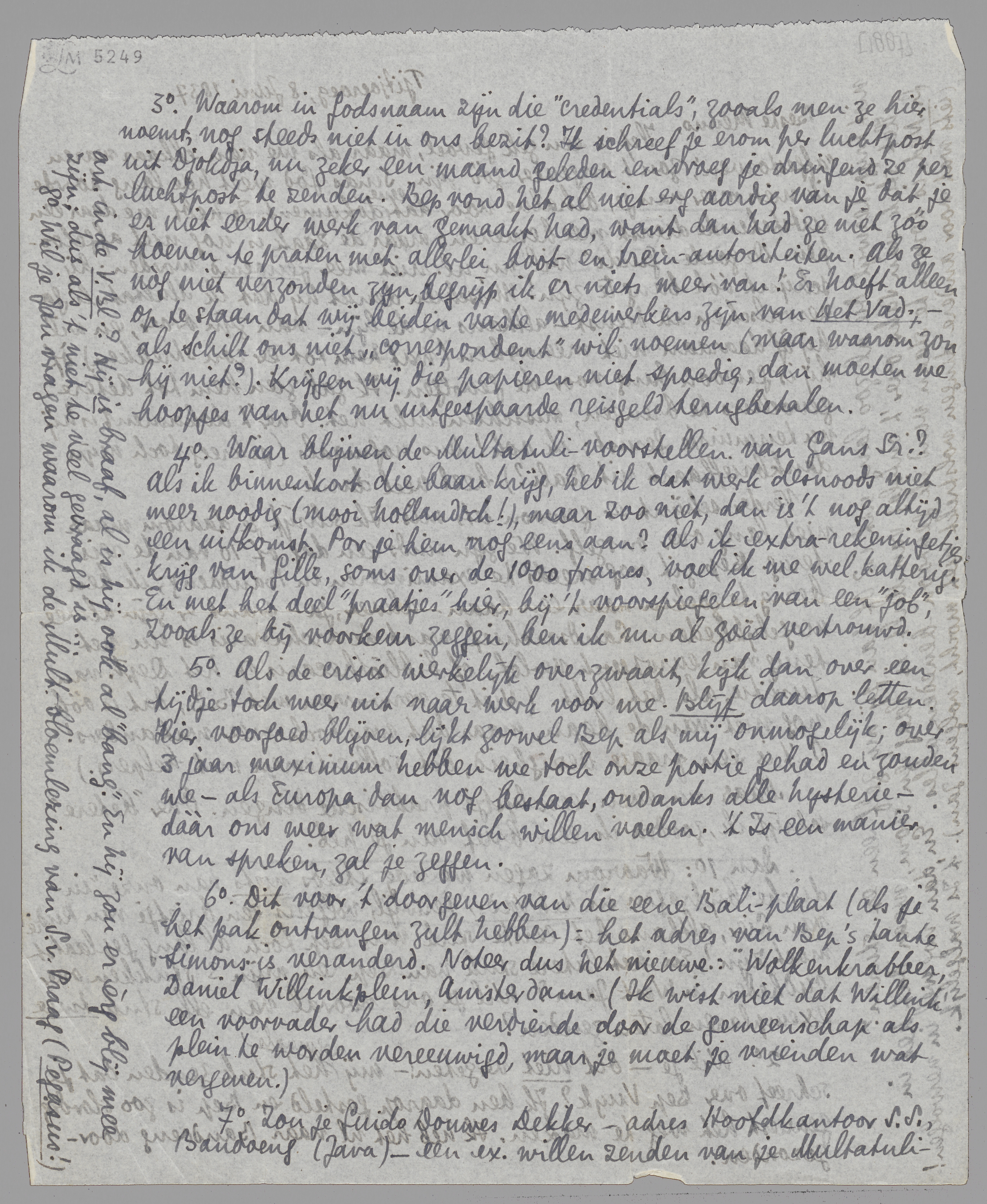 3o. Waarom in Godsnaam zijn die ‘credentials’, zooals men ze hier noemt, nog steeds niet in ons bezit? Ik schreef je erom per luchtpost uit Djokdja, nu zeker een maand geleden en vroeg je dringend ze per luchtpost te zenden. Bep vond het al niet erg aardig van je dat je er niet eerder werk van gemaakt had, want dan had ze niet zóó hoeven te praten met allerlei boot- en treinautoriteiten. Als ze nòg niet verzonden zijn, begrijp ik er niets meer van! Er hoeft alleen op te staan dat wij beiden vaste medewerkers zijn van Het Vad. - als Schilt ons niet ‘correspondent’ wil noemen (maar waarom zou hij niet?). Krijgen wij die papieren niet spoedig, dan moeten we hoopjes van het nu uitgespaarde reisgeld terugbetalen.