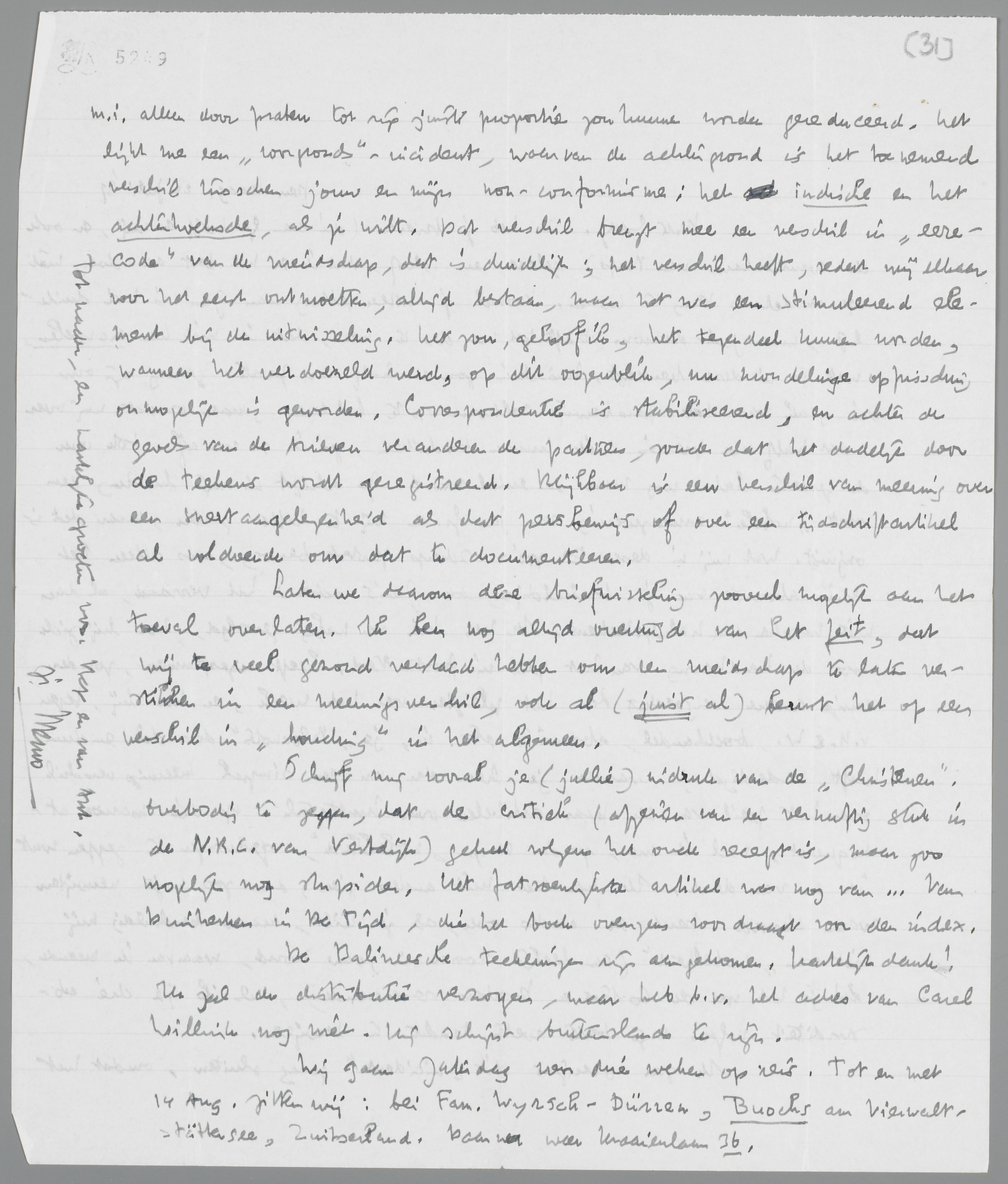 Ik zou overigens dit ‘incident’ graag sluiten, omdat het m.i. alleen door praten tot zijn juiste proportie zou kunnen worden gereduceerd. Het lijkt me een ‘voorgronds’-incident, waarvan de achtergrond is het toenemend verschil tusschen jouw en mijn nonconformisme; het indische en het achterhoeksche, als je wilt. Dat verschil brengt mee een verschil in ‘eerecode’ van de vriendschap, dat is duidelijk; het verschil heeft, sedert wij elkaar voor het eerst ontmoetten, altijd bestaan, maar het was een stimuleerend element bij de uitwisseling. Het zou, geloof ik, het tegendeel kunnen worden, wanneer het verdoezeld werd, op dit oogenblik, nu mondelinge opfrissching onmogelijk is geworden. Correspondentie is stabiliseerend, en achter de gevels van de brieven veranderen de partners, zonder dat het dadelijk door de teekens wordt geregistreerd. Blijkbaar is een verschil van meening over een snertaangelegenheid als dat persbewijs of over een tijdschriftartikel al voldoende om dat te documenteeren.