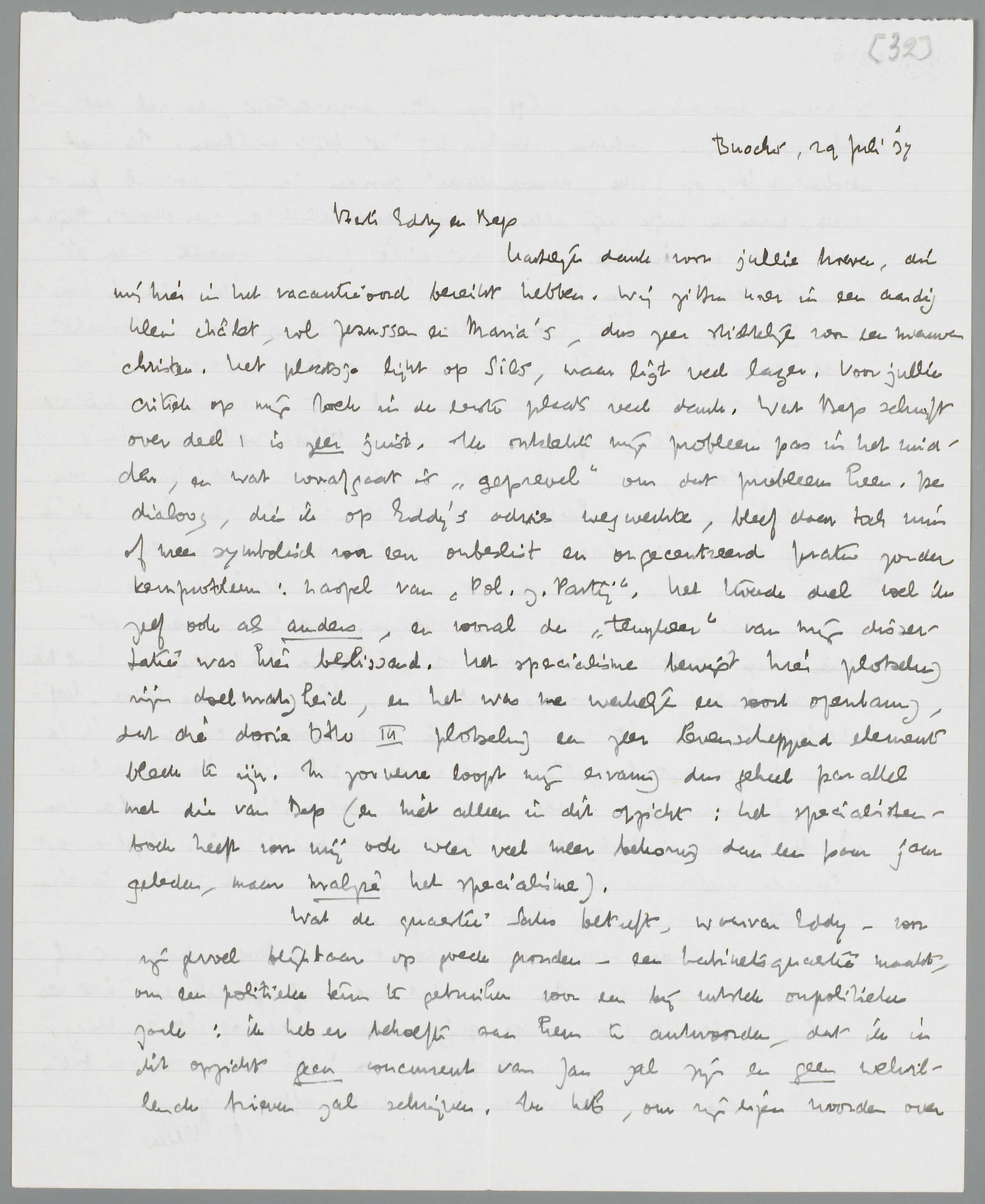Hartelijk dank voor jullie brieven, die mij hier in het vacantieoord bereikt hebben. Wij zitten hier in een aardig klein châlet, vol Jezussen en Maria's, dus zeer stichtelijk voor een nieuwen christen. Het plaatsje lijkt op Sils, maar ligt veel lager. Voor jullie critiek op mijn boek in de eerste plaats veel dank. Wat Bep schrijft over deel 1 is zeer juist. Ik ontdekte mijn probleem pas in het midden, en wat voorafgaat is ‘geprevel’ om dat probleem heen. De dialoog, die ik op Eddy's advies wegwerkte, bleef daar toch min of meer symbolisch voor een onbeslist en ongecentreerd praten zonder kernprobleem: naspel van Pol. z. Partij. Het tweede deel voel ik zelf ook als anders, en vooral de ‘terugkeer’ van mijn dissertatie was hier beslissend. Het specialisme bewijst hier plotseling zijn doelmatigheid, en het was me werkelijk een soort openbaring, dat die dooie Otto III plotseling een zeer levenscheppend element bleek te zijn. In zooverre loopt mijn ervaring dus geheel parallel met die van Bep (en niet alleen in dit opzicht: het specialistenboek heeft voor mij ook weer veel meer bekoring dan een paar jaar geleden, maar malgré het specialisme).