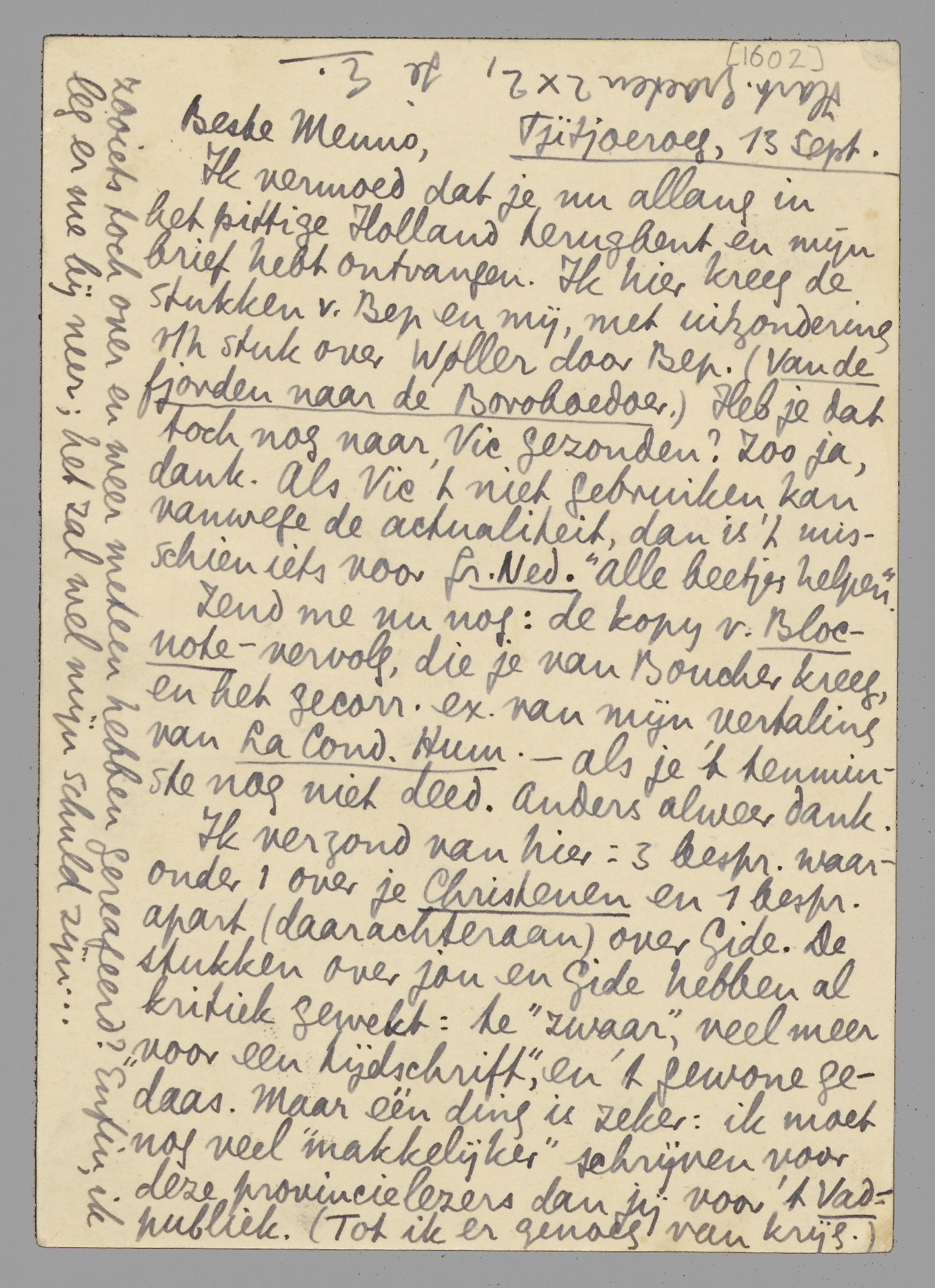 Ik verzond van hier: 3 bespr. waaronder 1 over je Christenen en 1 bespr. apart (daarachteraan) over Gide. De stukken over jou en Gide hebben al kritiek gewekt: te ‘zwaar’, veel meer ‘voor een tijdschrift’, en 't gewone gedaas. Maar één ding is zeker: ik moet nog veel ‘makkelijker’ schrijven voor deze provincielezers dan jij voor 't Vad. publiek. (Tot ik er genoeg van krijg.) Tot dusver is Ritman erg geschikt en heeft nog over geen enkele wijziging zelfs maar gerept. Dus zien hoelang 't duren kan. - Binnerts schreef over je Mult. en D.D. met heel veel waardeering, hoewel kort. Ik zal 't je laten zenden. Maar waarom zond je niet een ex. van dat boekje aan G.M.G. Douwes Dekker te Bdg., die er zoo gelukkig mee zou zijn geweest? - De afstand en verkoeling tusschen ons uit zich ook in zulke dingen; vroeger zouden we op zooiets toch over en weer meteen hebben gereageerd? Enfin, ik leg er me bij neer; het zal wel mijn schuld zijn...