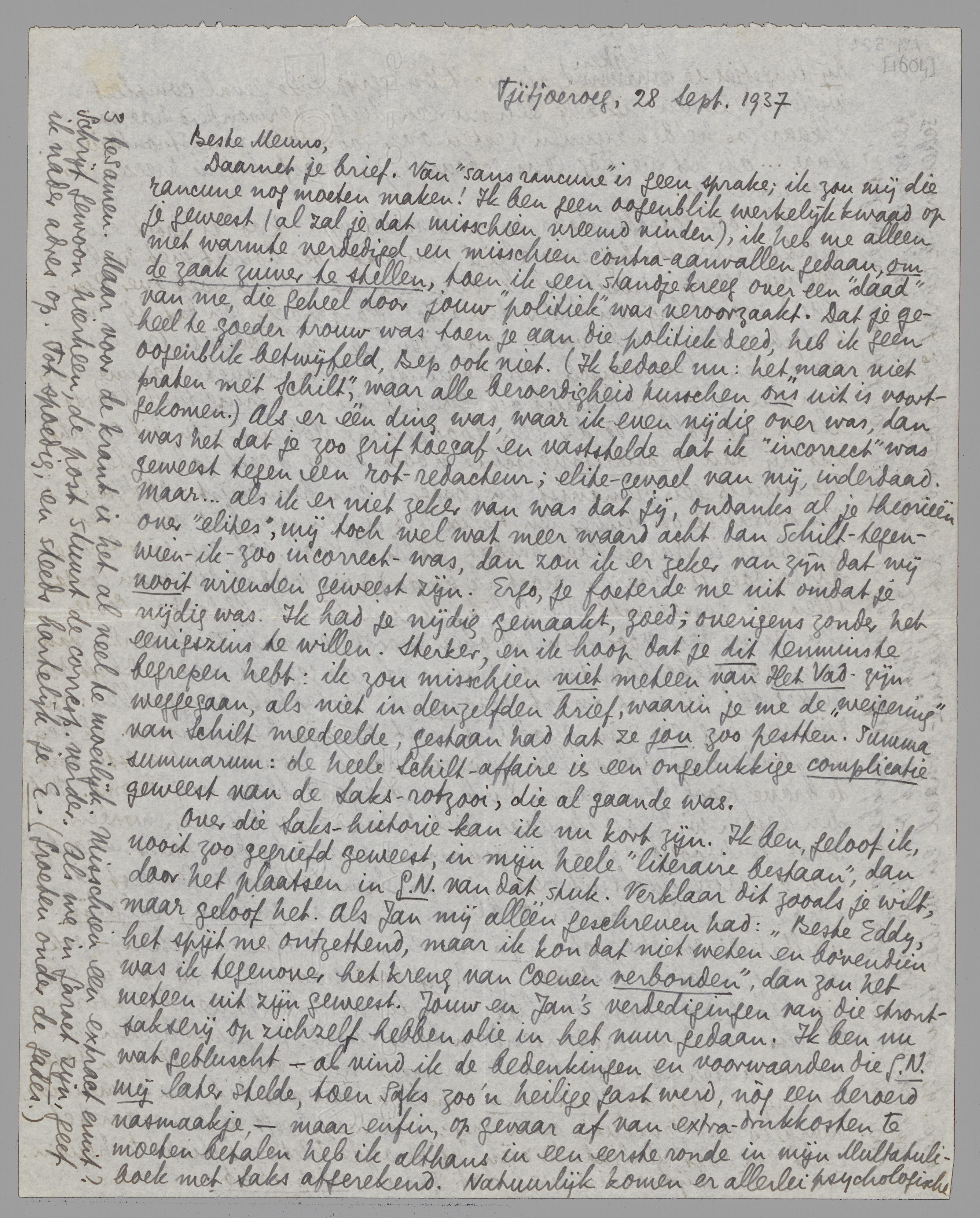Daarnet je brief. Van ‘sans rancune’ is geen sprake; ik zou mij die rancune nog moeten maken! Ik ben geen oogenblik werkelijk kwaad op je geweest (al zal je dat misschien vreemd vinden), ik heb me alleen met warmte verdedigd en misschien contra-aanvallen gedaan, om de zaak zuiver te stellen, toen ik een standje kreeg over een ‘daad’ van me, die geheel door jouw ‘politiek’ was veroorzaakt. Dat je geheel ter goeder trouw was toen je aan die politiek deed, heb ik geen oogenblik betwijfeld, Bep ook niet. (Ik bedoel nu: het ‘maar niet praten met Schilt’, waar alle beroerdigheid tusschen ons uit is voortgekomen.) Als er één ding was, waar ik even nijdig over was, dan was het dat je zoo grif toegaf en vaststelde dat ik ‘incorrect’ was geweest tegen een rot-redacteur; elite-gevoel van mij, inderdaad. Maar... als ik er nu niet zeker van was dat jij, ondanks al je theorieën over ‘elites’, mij toch wel wat meer waard acht dan Schilt-tegen-wien-ik-zoo incorrect -was, dan zou ik er zeker van zijn dat wij nooit vrienden geweest zijn. Ergo, je foeterde me uit omdat je nijdig was. Ik had je nijdig gemaakt, goed; overigens zonder het eenigszins te willen. Sterker, en ik hoop dat je dit tenminste begrepen hebt: ik zou misschien niet meteen van Het Vad. zijn weggegaan, als niet in denzelfden brief, waarin je me de ‘weigering’ van Schilt meedeelde, gestaan had dat ze jou zoo pestten. Summa summarum: de heele Schilt-affaire is een ongelukkige complicatie geweest van de Saks-rotzooi, die al gaande was.