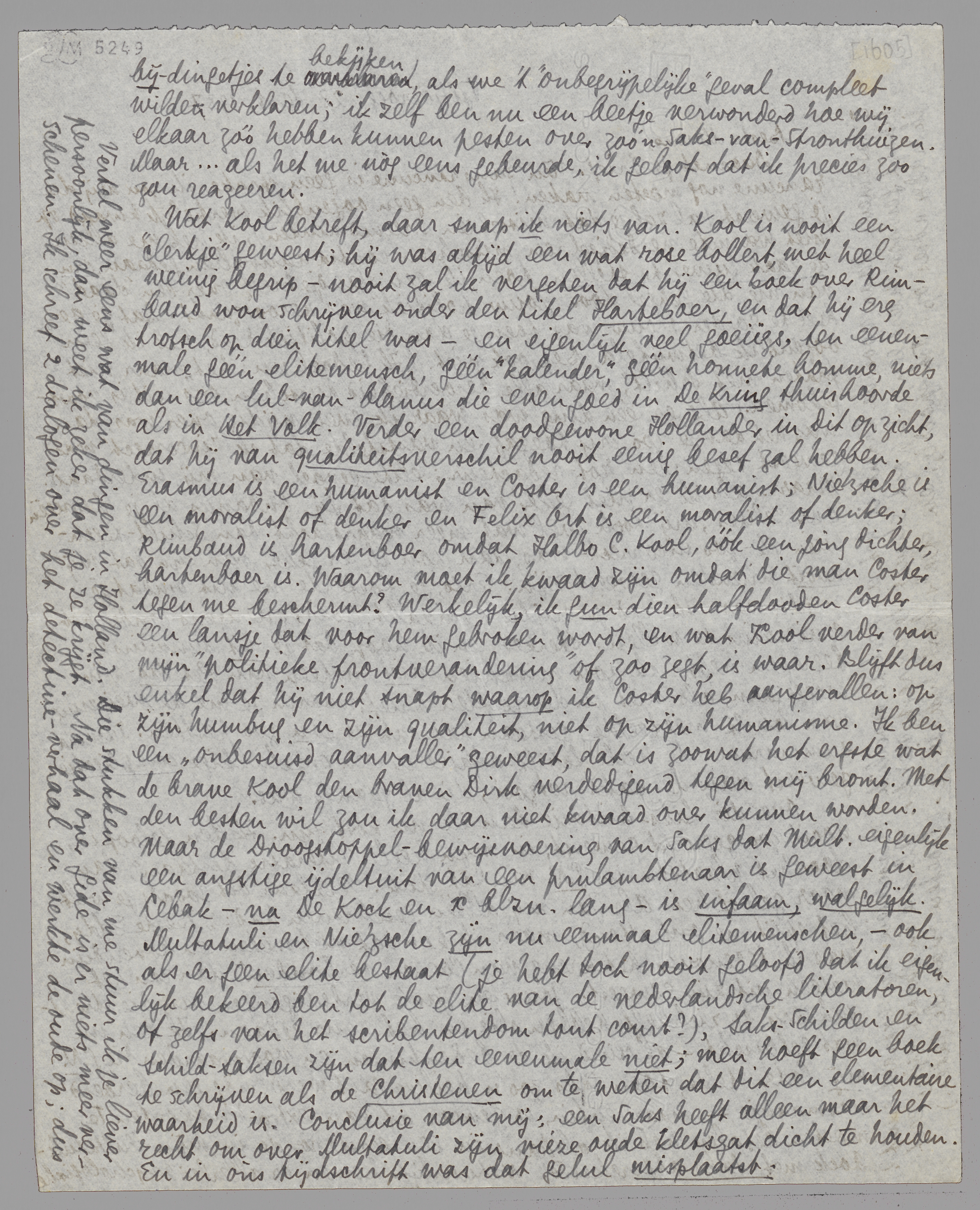 Wat Kool betreft, daar snap ik niets van. Kool is nooit een ‘clerkje’ geweest; hij was altijd een wat rose bollert, met heel weinig begrip - nooit zal ik vergeten dat hij een boek over Rimbaud wou schrijven onder den titel Harteboer, en dat hij erg trotsch op dien titel was - en eigenlijk veel goeiïgs, ten eenenmale géén elitemensch, géén ‘kalender’, géén honnete homme, niets dan een lul-van-blanus die even goed in De Kring thuishoorde als in Het Volk. Verder een doodgewone Hollander in dit opzicht, dat hij van qualiteitsverschil nooit eenig besef zal hebben. Erasmus is een humanist en Coster is een humanist; Nietzsche is een moralist of denker en Felix Ort is een moralist of denker; Rimbaud is hartenboer omdat Halbo C. Kool, óók een jong dichter, hartenboer is. Waarom moet ik kwaad zijn omdat die man Coster tegen me beschermt? Werkelijk, ik gun dien halfdooden Coster een lansje dat voor hem gebroken wordt, en wat Kool verder van mijn ‘politieke frontverandering’ of zoo zegt, is waar. Blijft dus enkel dat hij niet snapt waarop ik Coster heb aangevallen: op zijn humbug en zijn qualiteit, niet op zijn humanisme. Ik ben een ‘onbesuisd aanvaller’ geweest, dat is zoowat het ergste wat de brave Kool den braven Dirk verdedigend tegen mij bromt. Met den besten wil zou ik daar niet kwaad over kunnen worden. Maar de Droogstoppel-bewijsvoering van Saks dat Mult. eigenlijk een angstige ijdeltuit van een prulambtenaar is geweest in Lebak - na De Kock en x blzn. lang - is infaam, walgelijk.