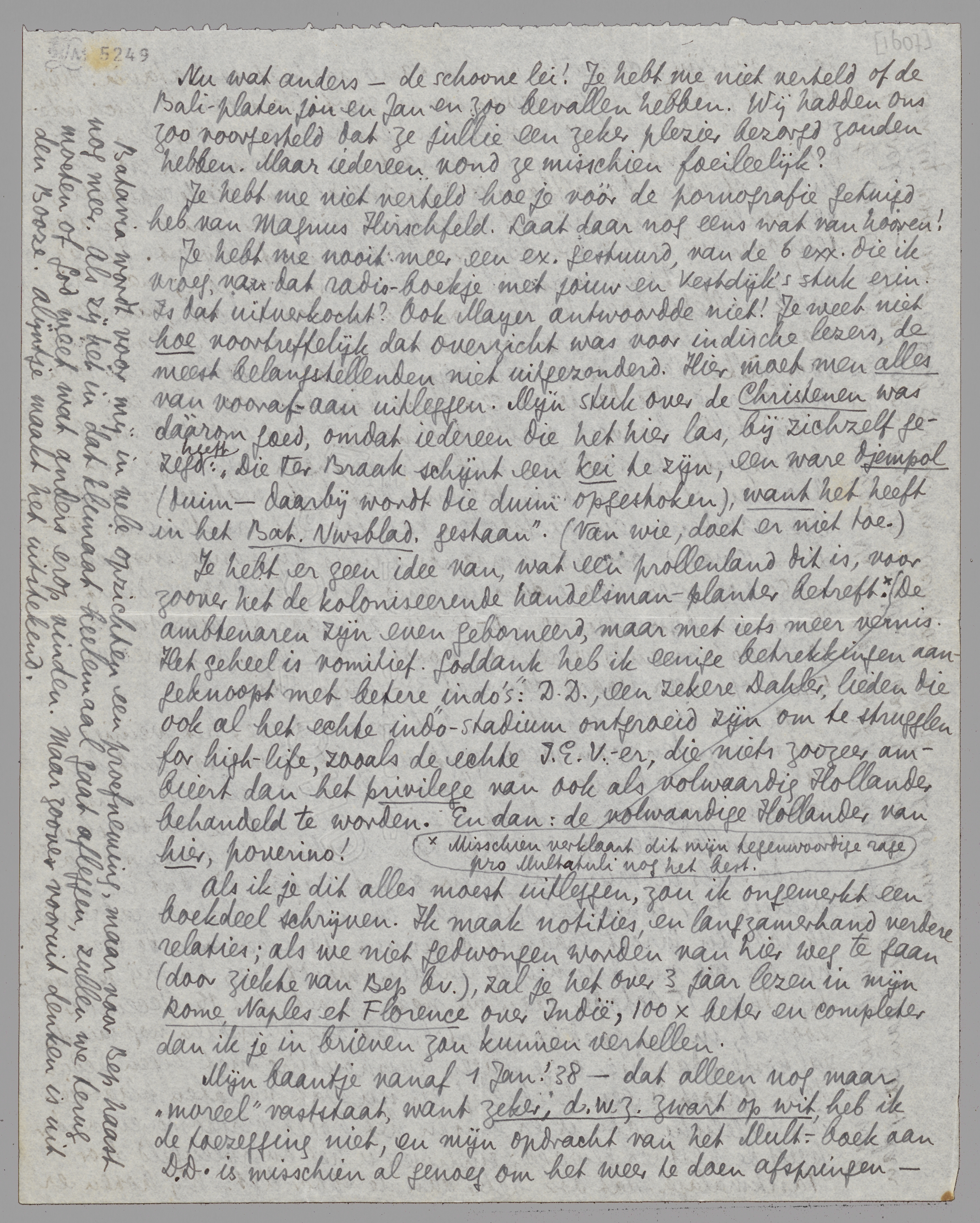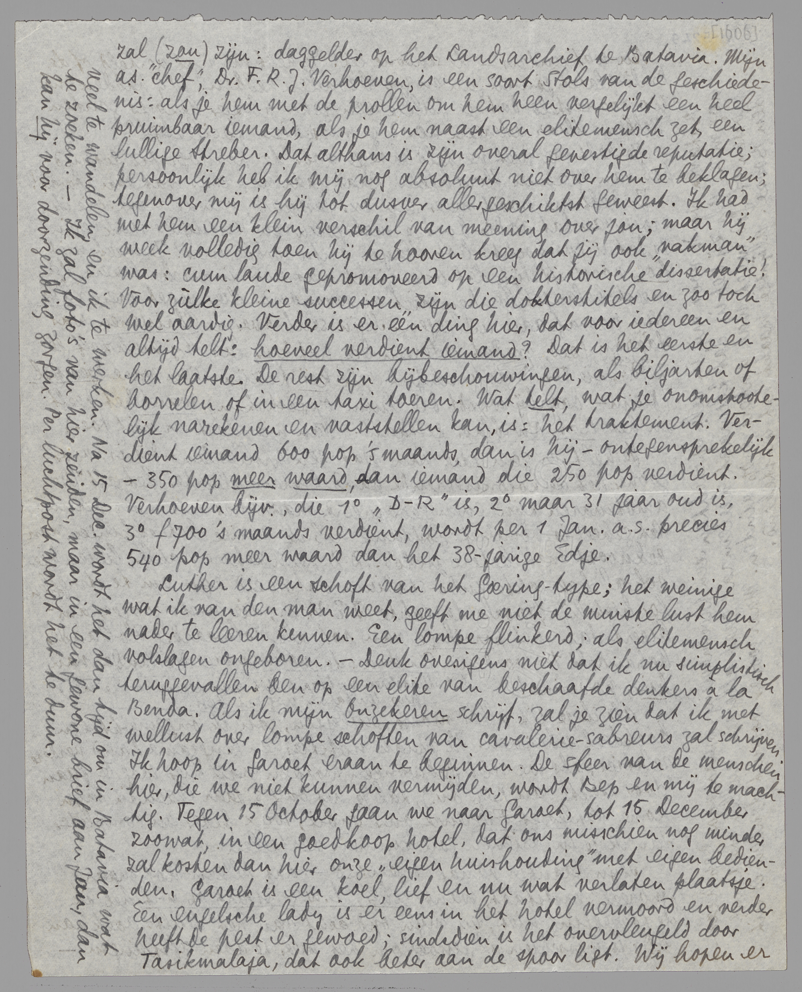 Mijn baantje vanaf 1 Jan. '38 - dat alleen nog maar ‘moreel’ vaststaat, want zeker, d.w.z. zwart op wit, heb ik de toezegging niet, en mijn opdracht van het Mult.-boek aan D.D. is misschien al genoeg om het weer te doen afspringen - zal (zou) zijn; daggelder op het Landsarchief te Batavia. Mijn a.s. ‘chef’, Dr. F.R.J. Verhoeven, is een soort Stols van de geschiedenis: als je hem met de prollen om hem heen vergelijkt een heel pruimbaar iemand, als je hem naast een elitemensch zet, een lullige streber. Dat althans is zijn overal gevestigde reputatie; persoonlijk heb ik mij nog absoluut niet over hem te beklagen; tegenover mij is hij tot dusver allergeschiktst geweest. Ik had met hem een klein verschil van meening over jou; maar hij week volledig toen hij te hooren kreeg dat jij ook ‘vakman’ was: cum laude gepromoveerd op een historische dissertatie! Voor zùlke kleine successen zijn die dokterstitels en zoo toch wel aardig. Verder is er één ding hier, dat voor iedereen en altijd telt: hoeveel verdient iemand? Dat is het eerste en het laatste. De rest zijn bijbeschouwingen, als biljarten of borrelen of in een taxi toeren. Wat telt, wat je onomstootelijk narekenen en vaststellen kan, is: het traktement. Verdient iemand 600 pop 's maands, dan is hij - ontegensprekelijk - 350 pop meer waard, dan iemand die 250 pop verdient. Verhoeven bijv. die 1o ‘D-R’ is, 2o maar 31 jaar oud is, 3o ƒ 700 's maands verdient, wordt per 1 Jan. a.s. precies 540 pop meer waard dan het 38-jarige Edje.