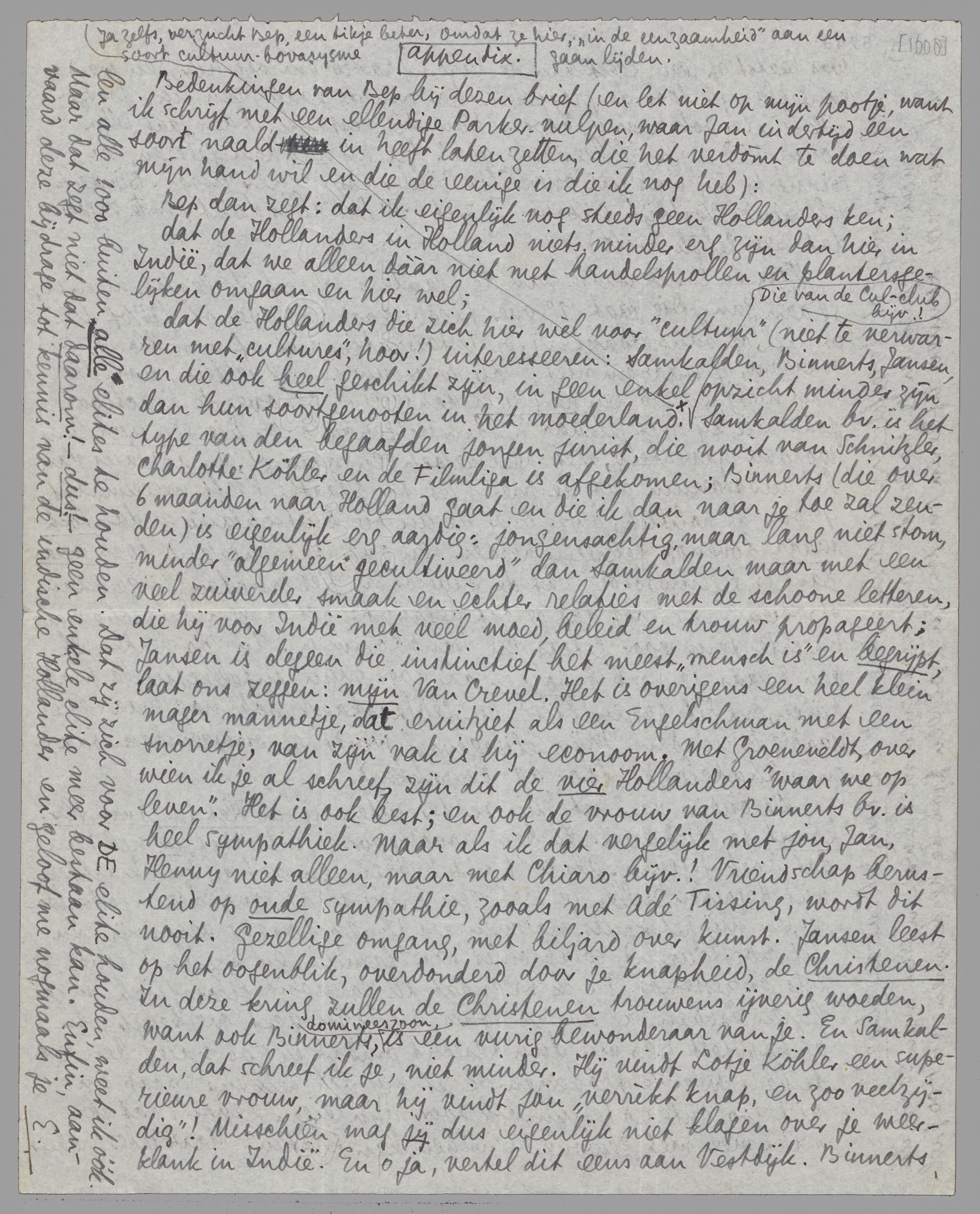 dat de Hollanders die zich hier wèl voor ‘cultuur’ (niet te verwarren met ‘cultures’, hoor!) interesseeren: Samkalden, Binnerts, Jansen, en die ook heel geschikt zijn, in geen enkel opzicht minder zijn dan hun soortgenooten in het moederland. [Ja zelfs, verzucht Bep, een tikje beter, omdat ze hier, ‘in de eenzaamheid’ aan een soort cultuur-bovarysme gaan lijden.] Die van de Cul-club bijv.! Samkalden bv. is het type van den begaafden jongen jurist, die nooit van Schnitzler, Charlotte Köhler en de Filmliga is afgekomen; Binnerts (die over 6 maanden naar Holland gaat en die ik dan naar je toe zal zenden) is eigenlijk erg aardig: jongensachtig, maar lang niet stom, minder ‘algemeen gecultiveerd’ dan Samkalden maar met een veel zuiverder smaak en èchter relaties met de schoone letteren, die hij voor Indië met veel moed, beleid en trouw propageert; Jansen is degeen die instinctief het meest ‘mensch is’ en begrijpt, laat ons zeggen: mijn Van Crevel. Het is overigens een heel klein mager mannetje, dat eruitziet als een Engelschman met een snorretje, van zijn vak is hij econoom. Met Groeneveldt, over wien ik je al schreef, zijn dit de vier Hollanders ‘waar we op leven’. Het is ook best; en ook de vrouw van Binnerts bv. is heel sympathiek. Maar als ik dat vergelijk met jou, Jan, Henny niet alleen, maar met Chiaro bijv.! Vriendschap berustend op oude sympathie, zooals met Adé Tissing, wordt dit nooit. Gezellige omgang, met biljard over kunst. Jansen leest op het oogenblik, overdonderd door je knapheid, de Christenen. In deze kring zullen de Christenen trouwens ijverig woeden, want ook Binnerts, domineeszoon, is een vurig bewonderaar van je. En Samkalden, dat schreef ik je, niet minder. Hij vindt Lotje Köhler een superieure vrouw, maar hij vindt jou ‘verrèkt knap, en zoo veelzijdig’! Misschien mag jij dus eigenlijk niet klagen over je weerklank in Indië. En o ja, vertel dit eens aan Vestdijk. Binnerts was laatst op een feest van de Nirom (radio-omroep hier) en werd aangeklampt door de grappenmaker van de zaak, een slim Joodje. ‘Ik luister ook naar u, hoor... Nou, die Vestdijk! Daar gaat géén boven, hè?... Ja, ik lees hem ook’. En hij had hem gelezen, zei Binnerts, hij was uit over Else Böhler en meneer Visser. Binnerts zelf vindt Vestdijk enorm. Je ziet... (Dit alles dient om te zeggen dat Bep gelijk heeft.)