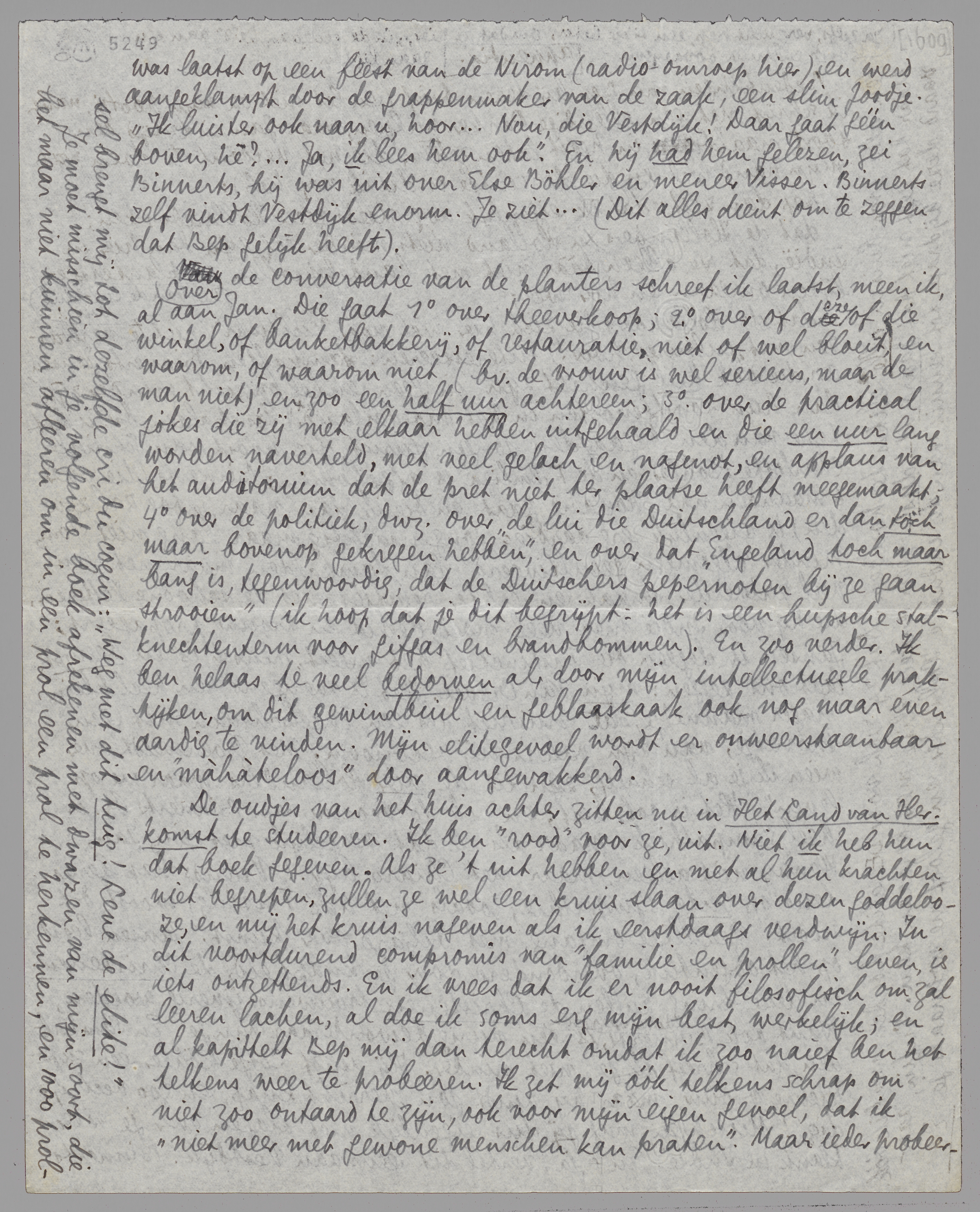 Over de conversatie van de planters schreef ik laatst, meen ik, al aan Jan. Die gaat 1o over theeverkoop; 2o of deze of die winkel, of banketbakkerij, of restauratie, niet of wel bloeit, en waarom, of waarom niet (bv. de vrouw is wel serieus, maar de man niet), en zoo een half uur achtereen; 3o over de practical jokes die zij met elkaar hebben uitgehaald en die een uur lang worden naverteld, met veel gelach en nagenot, en applaus van het auditorium dat de pret niet ter plaatse heeft meegemaakt; 4o over de politiek, dwz. over ‘de lui die Duitschland er dan toch maar bovenop gekregen hebben’, en over dat ‘Engeland toch maar bang is, tegenwoordig, dat de Duitschers pepernoten bij ze gaan strooien’ (ik hoop dat je dit begrijpt: het is een hupsche stalknechtenterm voor gifgas en brandbommen). En zoo verder. Ik ben helaas te veel bedorven al door mijn intellectueele praktijken, om dit gewindbuil en geblaaskaak ook nog maar even aardig te vinden. Mijn elitegevoel wordt er onweerstaanbaar en ‘màhàteloos’ door aangewakkerd.