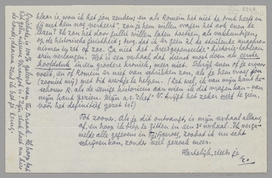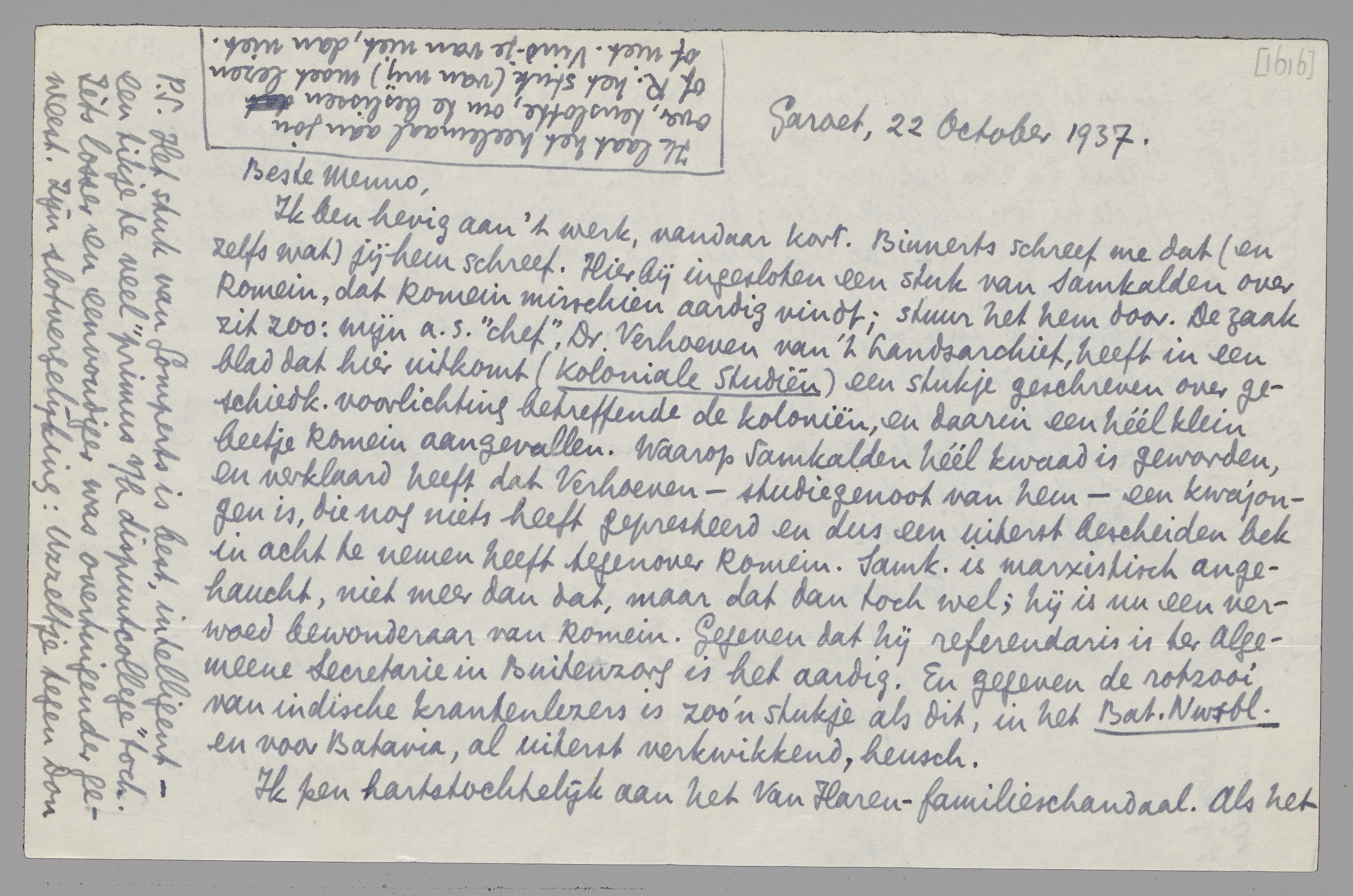 Ik ben hevig aan 't werk, vandaar kort. Binnerts schreef me dat (en zelfs wat) jij hem schreef. Hierbij ingesloten een stuk van Samkalden over Romein, dat Romein misschien aardig vindt; stuur het hem door. De zaak zit zoo: mijn a.s. ‘chef’, Dr. Verhoeven van 't Landsarchief, heeft in een blad dat hier uitkomt (Koloniale Studiën) een stukje geschreven over geschiedk. voorlichting betreffende de koloniën, en daarin een héél klein beetje Romein aangevallen. Waarop Samkalden héél kwaad is geworden, en verklaard heeft dat Verhoeven - studiegenoot van hem - een kwajongen is, die nog niets heeft gepresteerd en dus een uiterst bescheiden bek in acht te nemen heeft tegenover Romein. Samk. is marxistisch angehaucht, niet meer dan dat, maar dat dan toch wel; hij is nu een verwoed bewonderaar van Romein. Gegeven dat hij referendaris is ter Algemeene Secretarie in Buitenzorg is het aardig. En gegeven de rotzooi van indische krantenlezers is zoo'n stukje als dit, in het Bat. Nwsbl. en voor Batavia, al uiterst verkwikkend, heusch.