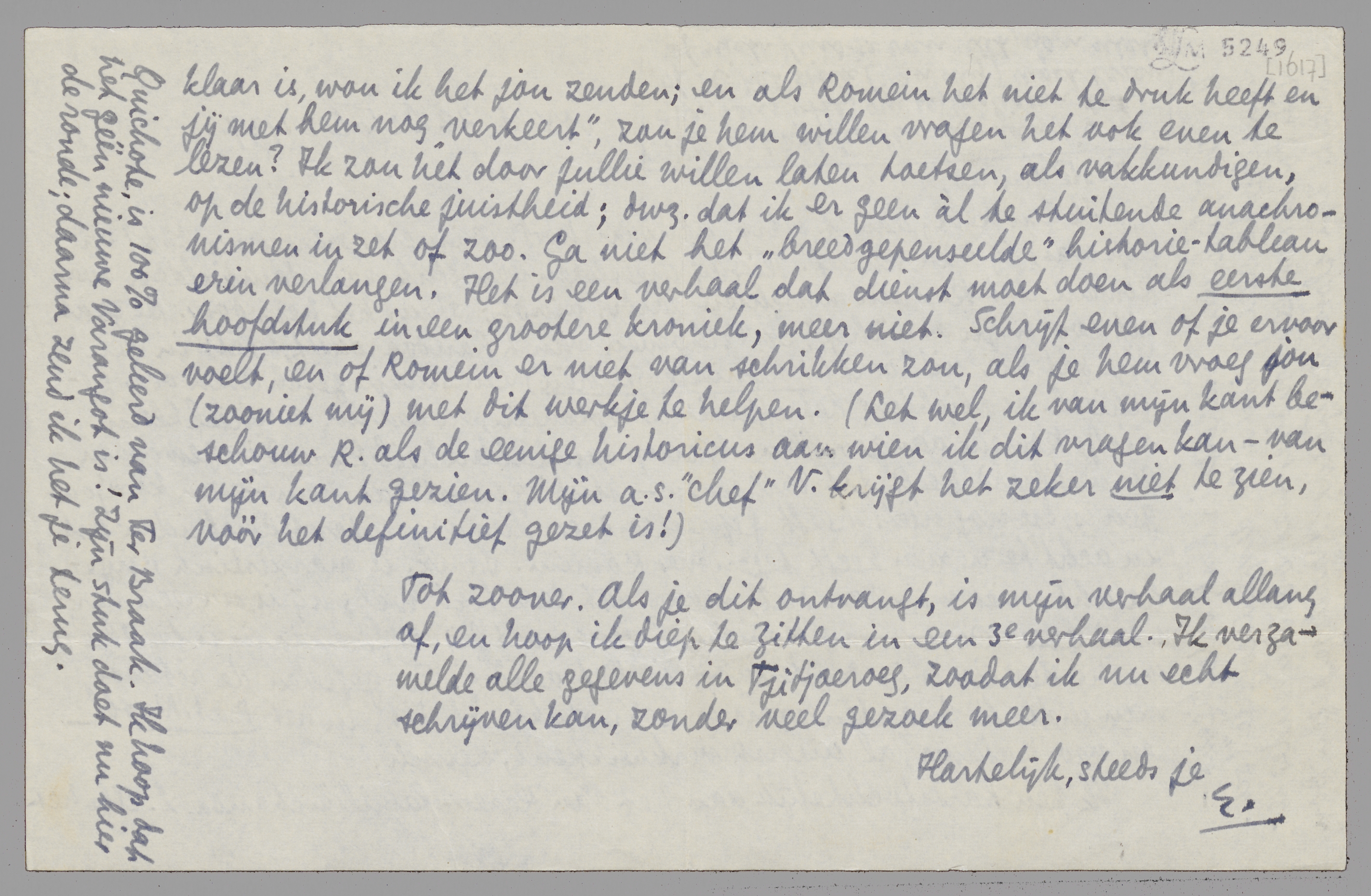 Ik pen hartstochtelijk aan het Van Haren-familie-schandaal. Als het klaar is, wou ik het jou zenden; en als Romein het niet te druk heeft en jij met hem nog ‘verkeert’, zou je hem willen vragen het ook even te lezen? Ik zou het door jullie willen laten toetsen, als vakkundigen, op de historische juistheid; dwz. dat ik er geen àl te stuitende anachronismen in zet of zoo. Ga niet het ‘breedgepenseelde’ historie-tableau erin verlangen. Het is een verhaal dat dienst moet doen als eerste hoofdstuk in een grootere kroniek, meer niet. Schrijf even of je ervoor voelt, en of Romein er niet van schrikken zou, als je hem vroeg jou (zoo niet mij) met dit werkje te helpen. (Let wel, ik van mijn kant beschouw R. als de eenige historicus aan wien ik dit vragen kan - van mijn kant gezien. Mijn a.s. ‘chef’ V. krijgt het zeker niet te zien, vòòr het definitief gezet is!)