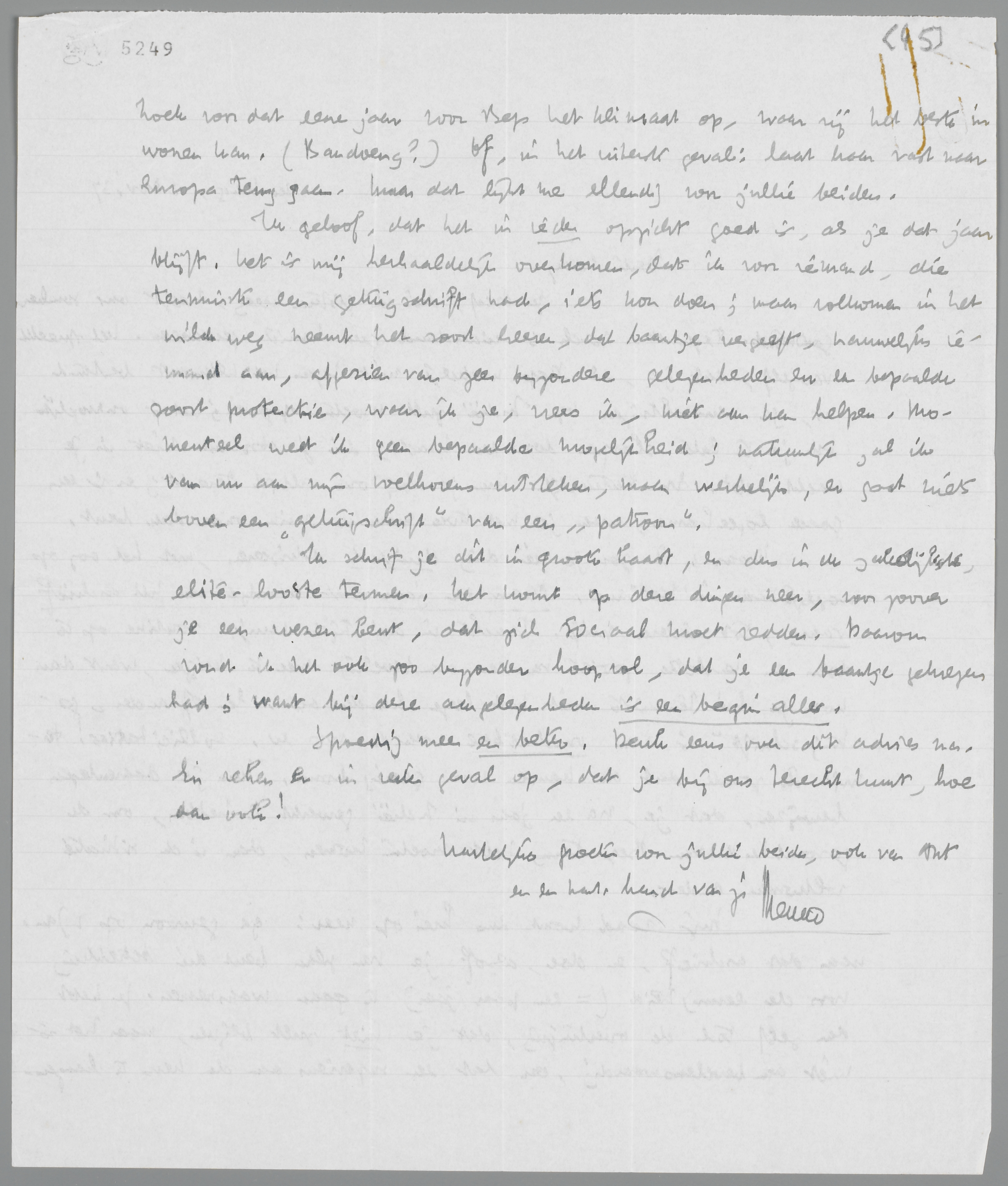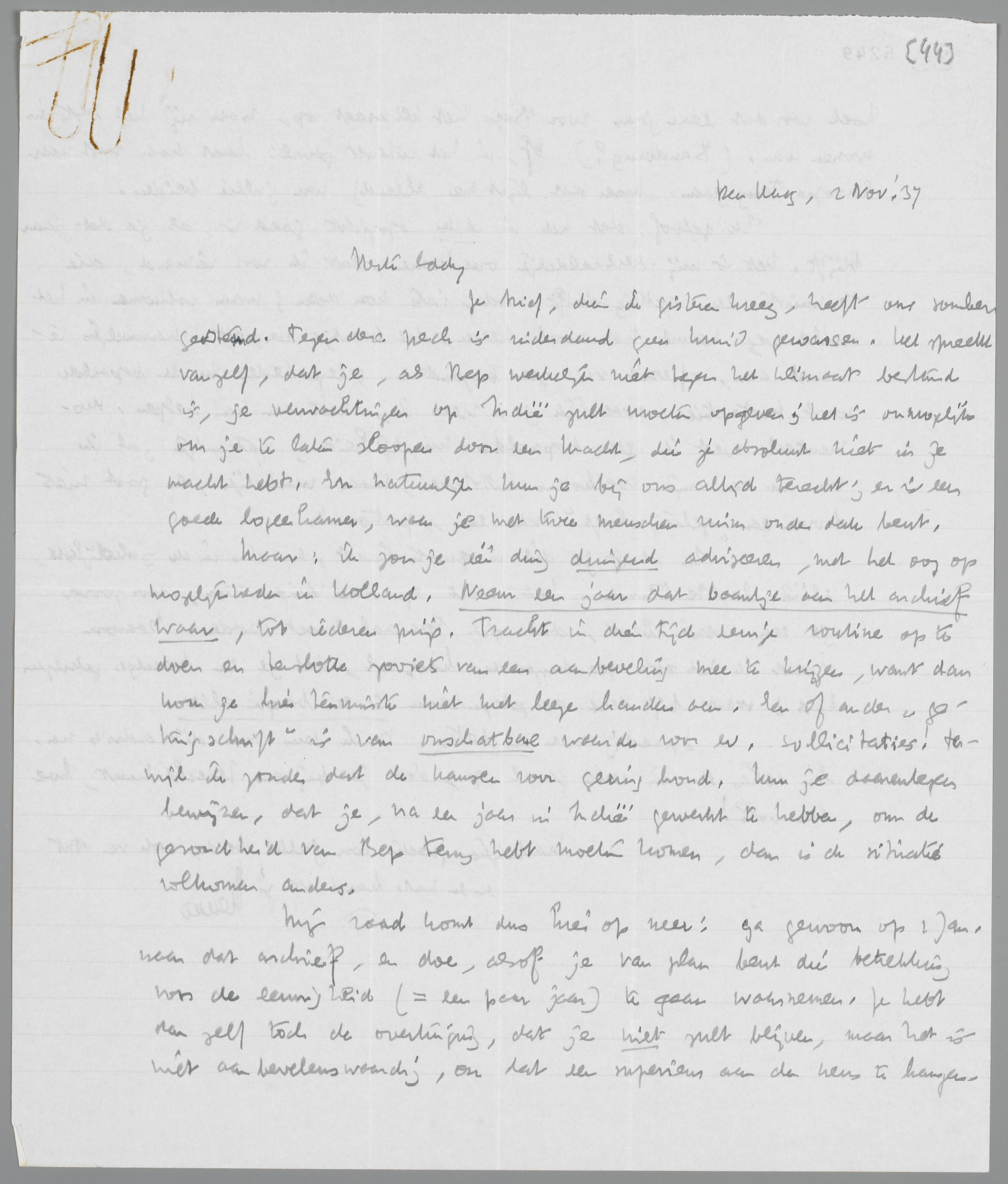 Mijn raad komt dus hier op neer: ga gewoon op 1 Jan. naar dat archief, en doe, alsof je van plan bent die betrekking voor de eeuwigheid ( = een paar jaar) te gaan waarnemen. Je hebt dan zelf toch de overtuiging, dat je niet zult blijven, maar het is niet aanbevelenswaardig, om dat een superieur aan den neus te hangen. Zoek voor dat eene jaar voor Bep het klimaat op, waar zij het beste in wonen kan. (Bandoeng?) Of, in het uiterste geval: laat haar vast naar Europa terug gaan. Maar dat lijkt me ellendig voor jullie beiden.