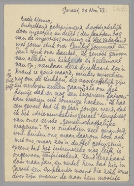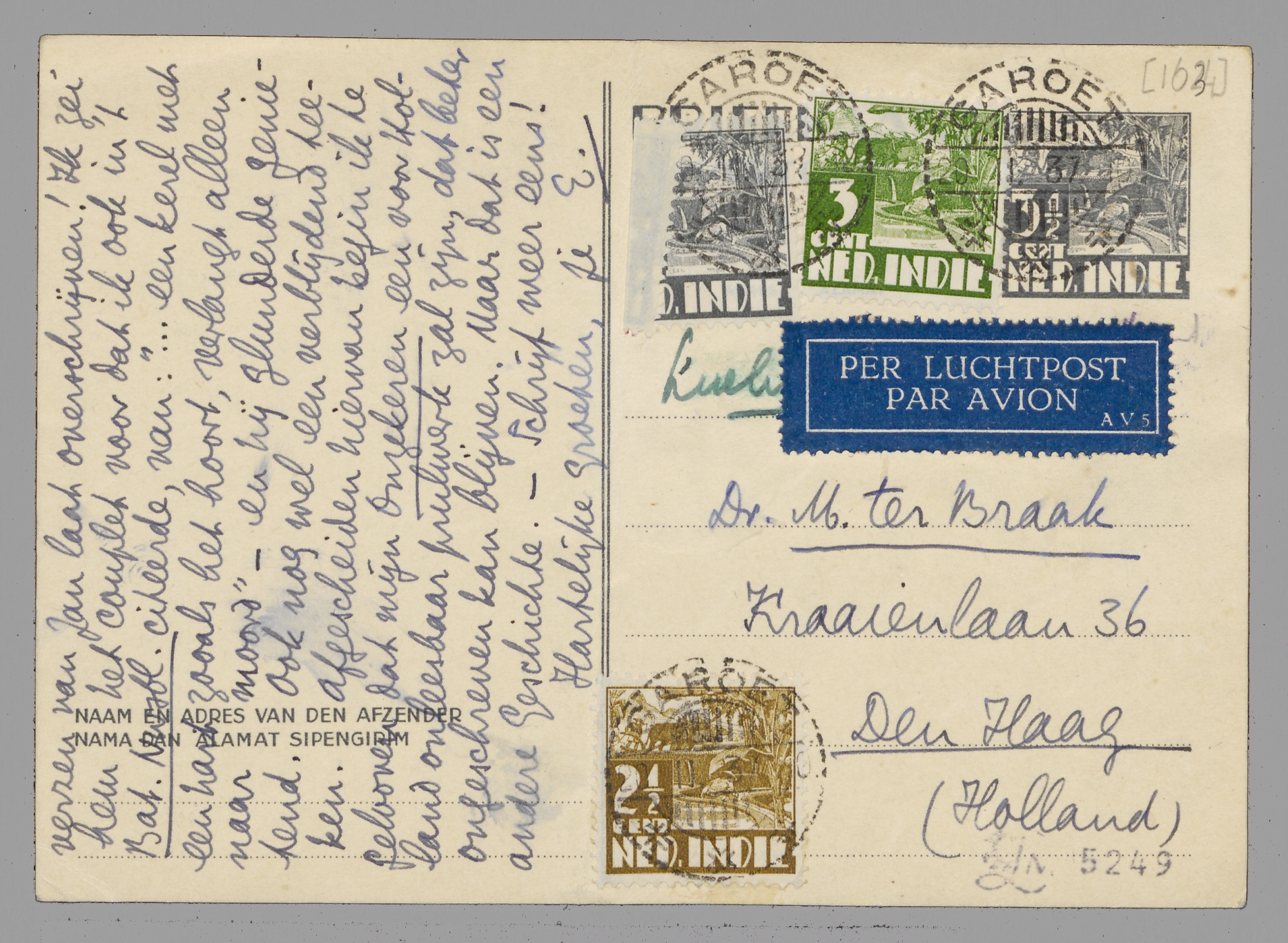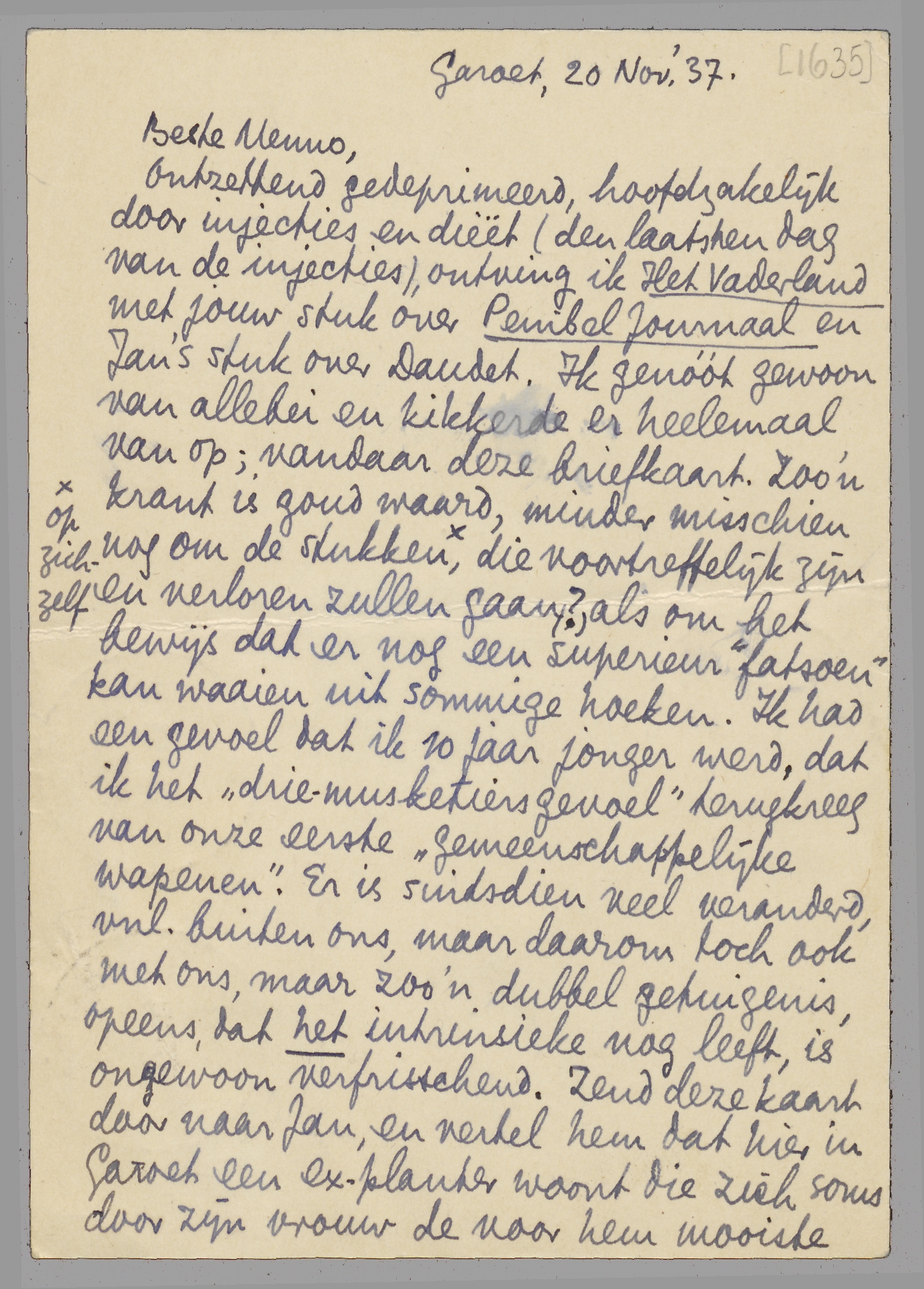 Ontzettend gedeprimeerd, hoofdzakelijk door injecties en diëet (den laatsten dag van de injecties), ontving ik Het Vaderland met jouw stuk over Penibel Journaal en Jan's stuk over Daudet. Ik genóót gewoon van allebei en kikkerde er heelemaal van op; vandaar deze briefkaart. Zoo'n krant is goud waard, minder misschien nog om de stukken [op zichzelf], die voortreffelijk zijn en verloren zullen gaan (?) als om het bewijs dat er nog een superieur ‘fatsoen’ kan waaien uit sommige hoeken. Ik had een gevoel dat ik 10 jaar jonger werd, dat ik het ‘drie-musketiersgevoel’ terugkreeg van onze eerste ‘gemeenschappelijke wapenen’. Er is sindsdien veel veranderd, vnl. buiten ons, maar daarom toch ook met ons, maar zoo'n dubbel getuigenis, opeens, dat het intrinsieke nog leeft, is ongewoon verfrisschend. Zend deze kaart door naar Jan, en vertel hem dat hier in Garoet een ex-planter woont die zich soms door zijn vrouw de voor hem mooiste verzen van Jan laat overschrijven! Ik zei hem het couplet voor dat ik ook in 't Bat. Nwsbl. citeerde, van... ‘een kerel met een hart zooals het hoort, verlangt alleen naar moord’ - en hij glunderde genietend. Ook nog wel een verblijdend teeken. Afgescheiden hiervan begin ik te gelooven dat mijn Onzekeren een voor Holland onleesbaar prulwerk zal zijn, dat beter ongeschreven kan blijven. Maar dat is een andere Geschichte. - Schrijf weer eens!