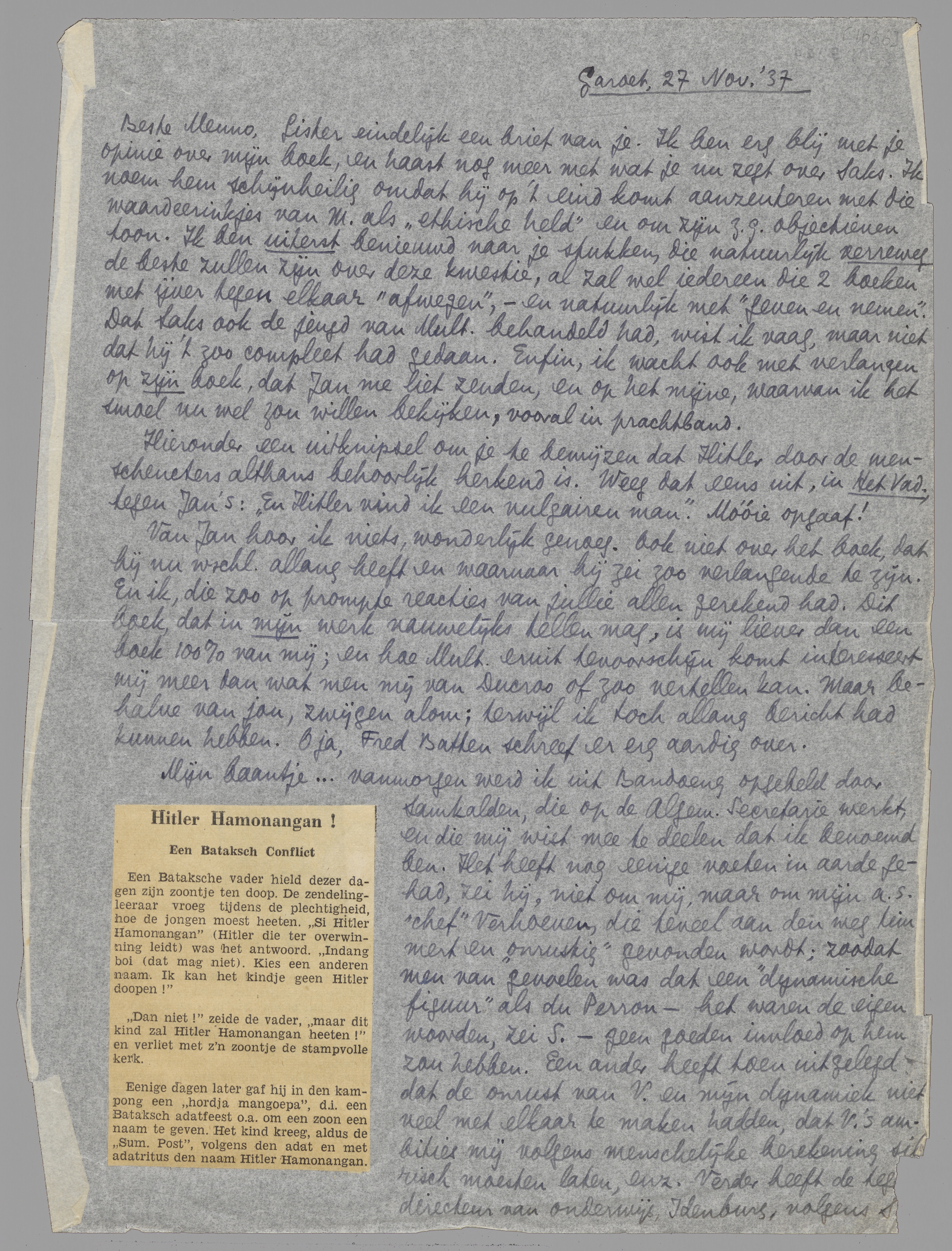 Je boek in Ursa Minor lijkt me zeer aantrekkelijk en ik zal 't in 't Bat. N. bespreken. Ook daar, hoorde ik van S., ‘trekken mijn artikelen steeds meer de aandacht’. - En D.D., van zijn kant, wil een blad oprichten, socio-politisch, niet onder zijn naam, maar met hem en mij in de leiding. Dit zou vierkant tegen alle andere belangen in gaan, en met alle sympathie die ik heb voor de inheemsche jongeren (beweging van Bangoen, touchant als ‘verovering van de cultuur’) wil ik hier voorloopig liever niet aan. Zeker niet, zoolang het éénige sympathie heeft voor Dai Nippon, want wat die rotkerels in China doen is me even zuwider als Moes' zwarthemden in Abessynië. Wat ik D.D. ook geschreven heb. Maar de javaansche studenten zijn 10 × sympathieker dan bijna al het hollandsche tuig dat dit land vult.