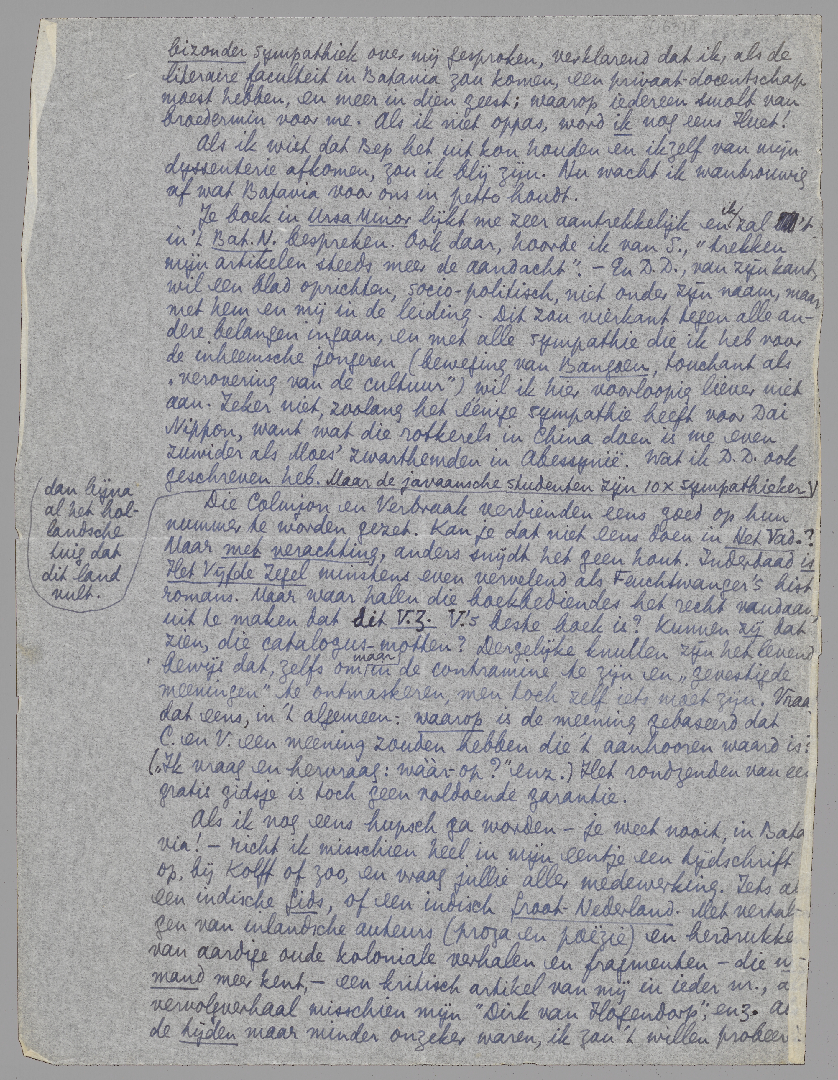 Als ik nog eens hupsch ga worden - je weet nooit, in Batavia! - richt ik misschien heel in mijn eentje een tijdschrift op, bij Kolff of zoo, en vraag jullie aller medewerking. Iets als een indische Gids, of een indisch Groot-Nederland. Met vertalingen van inlandsche auteurs (proza en poëzie) en herdrukken van aardige oude koloniale verhalen en fragmenten - die niemand meer kent, - een kritisch artikel van mij in ieder nr., als vervolgverhaal misschien mijn ‘Dirk van Hogendorp’, enz. Als de tijden maar minder onzeker waren, ik zou 't willen probeeren!