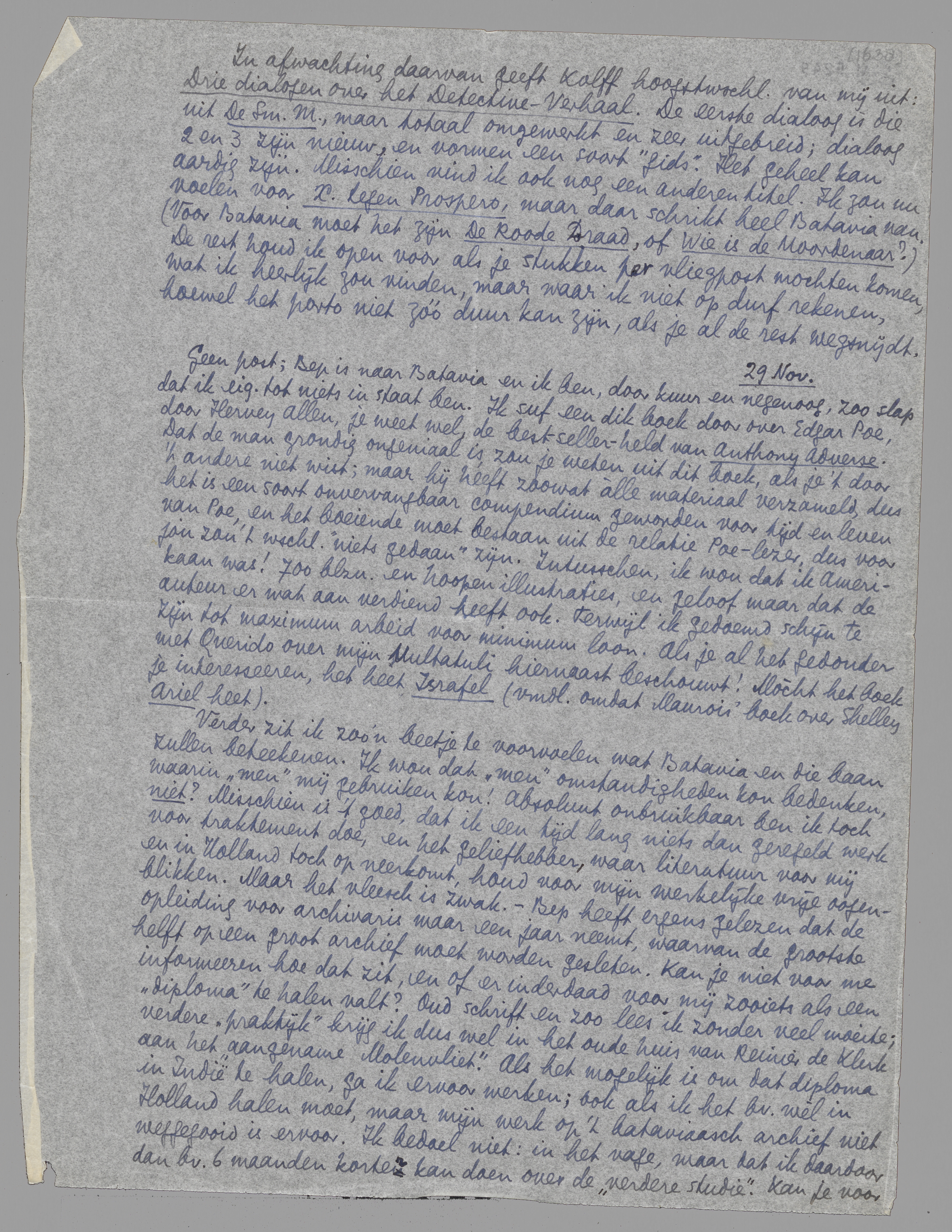 In afwachting daarvan geeft Kolff hoogstwschl. van mij uit: Drie dialogen over het Detective-Verhaal. De eerste dialoog is die uit De Sm. M., maar totaal omgewerkt en zeer uitgebreid; dialoog 2 en 3 zijn nieuw, en vormen een soort ‘gids’. Het geheel kan aardig zijn. Misschien vind ik ook nog een anderen titel. Ik zou nu voelen voor X tegen Prospero, maar daar schrikt heel Batavia van. (Voor Batavia moet het zijn De Roode Draad, of Wie is de Moordenaar?) De rest houd ik open voor als je stukken per vliegpost mochten komen, wat ik heerlijk zou vinden, maar waar ik niet op durf rekenen, hoewel het porto niet zóó duur kan zijn, als je al de rest wegsnijdt.