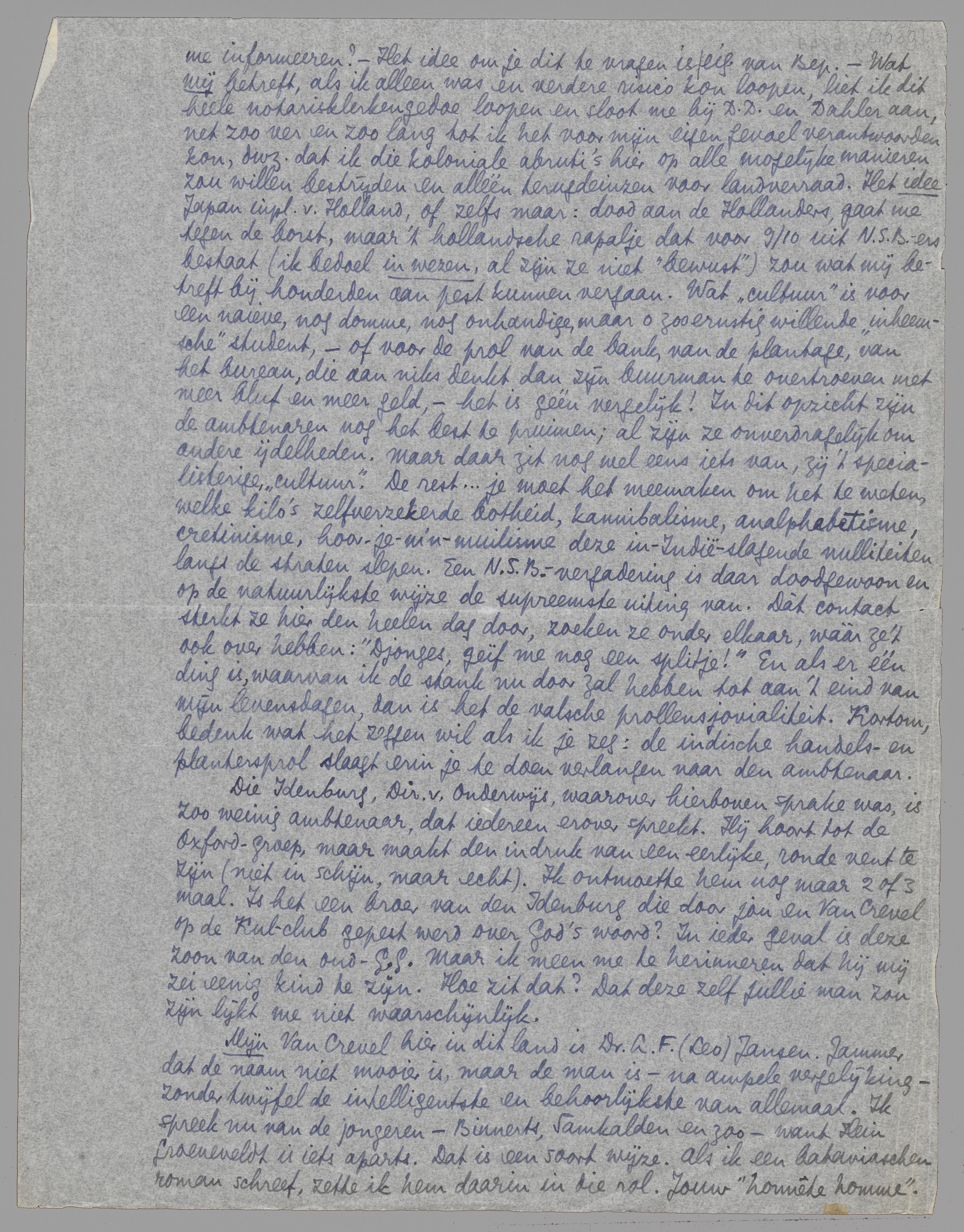 Mijn Van Crevel hier in dit land is Dr. L.F. (Leo) Jansen. Jammer dat de naam niet mooier is, maar de man is - na ampele vergelijking - zonder twijfel de intelligentste en behoorlijkste van allemaal. Ik spreek nu van de jongeren - Binnerts, Samkalden en zoo - want Hein Groeneveldt is iets aparts. Dat is een soort wijze. Als ik een bataviaschen roman schreef, zette ik hem daarin in die rol. Jouw ‘honnête homme’.