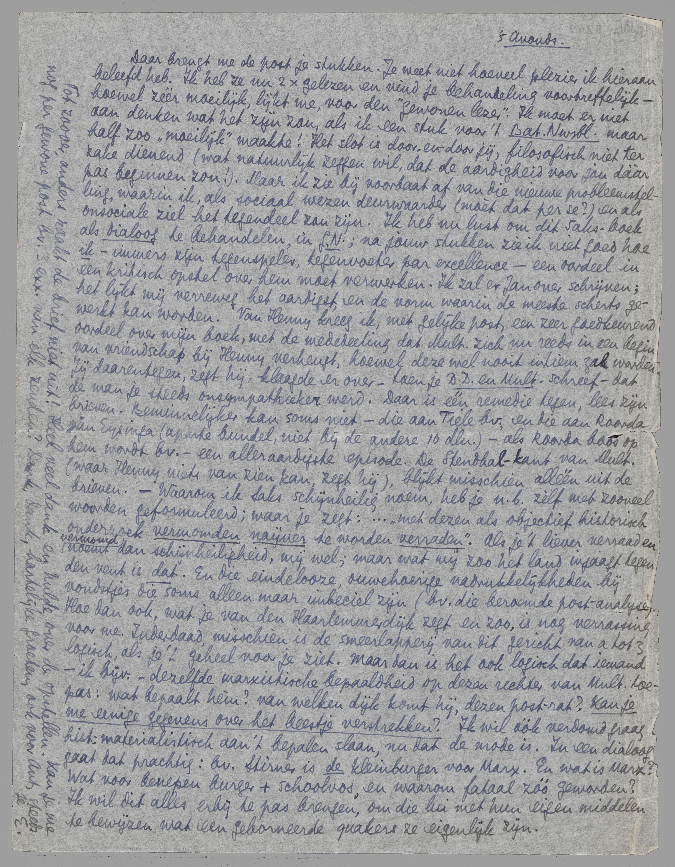 Daar brengt me de post je stukken. Je weet niet hoeveel plezier ik hieraan beleefd heb. Ik heb ze nu 2 × gelezen en vind je behandeling voortreffelijk - hoewel zéér moeilijk, lijkt me, voor den ‘gewonen lezer’. Ik moet er niet aan denken wat het zijn zou, als ik een stuk voor 't Bat. Nwsbl. maar half zoo ‘moeilijk’ maakte! Het slot is door-en-door jij, filosofisch niet ter zake dienend (wat natuurlijk zeggen wil, dat de aardigheid voor jou dààr pas beginnen zou!). Maar ik zie bij voorbaat af van die nieuwe probleemstelling, waarin ik, als sociaal wezen deurwaarder (moèt dat per se?) en als onsociale ziel het tegendeel zou zijn. Ik heb nu lust om dit Saksboek als dialoog te behandelen, in G.N.; na jouw stukken zie ik niet goed hoe ik - immers zijn tegenspeler; tegenvoeter par excellence - een oordeel in een kritisch opstel over hem moet verwerken. Ik zal er Jan over schrijven; het lijkt mij verreweg het aardigst, en de vorm waarin de meeste scherts gewerkt kan worden. Van Henny kreeg ik, met gelijke post, een zeer goedkeurend oordeel over mijn boek, met de mededeeling dat Mult. zich nu reeds in een begin van vriendschap bij Henny verheugt, hoewel deze wel nooit intiem zal worden. Jij daarentegen, zegt hij, klaagde er over - toen je D.D. en Mult. schreef - dat de man je steeds onsympathieker werd. Daar is één remedie tegen, lees zijn brieven. Beminnelijker kan soms niet - die aan Tiele bv., en die aan Roorda van Eysinga (aparte bundel, niet bij de andere 10 dln.) - als Roorda boos op hem wordt bv. - een alleraardigste episode. De Stendhal-kant van Mult. (waar Henny niets van zien kan, zegt hij), blijkt misschien alléén uit de brieven. - Waarom ik Saks schijnheilig noem, heb je n.b. zèlf met zooveel woorden geformuleerd; waar je zegt:... met dezen als objectief historisch onderzoek vermomden naijver te worden verraden. Als je 't liever verraad en vermomd noemt dan schijnheiligheid, mij wel; maar wat mij zoo het land injaagt tegen den vent is dat. En die eindelooze, ouwehoerige nadrukkelijkheden bij vondstjes die soms alleen maar imbeciel zijn (bv. die beroemde post-analyse)! Hoe dan ook, wat je van den Haarlemmerdijk zegt en zoo, is nog verrassing voor me. Inderdaad, misschien is de smeerlapperij van dit gericht van a tot z logisch, als je 't geheel voor je ziet. Maar dan is het ook logisch dat iemand - ik bijv. - dezelfde marxistische bepaaldheid op dezen rechter van Mult. toepas: wat bepaalt hèm? van welken dijk komt hij, deze post-rat? Kan je me eenige gegevens over het beestje verstrekken? Ik wil óók verdomd graag hist.-materialistisch aan 't bepalen slaan, nu dat de mode is. In een dialoog gaat dat prachtig: bv. Stirner is de kleinburger voor Marx. En wat is Marx? Wat voor benepen burger + schoolvos, en waarom fataal zóó geworden? Ik wil dit alles erbij te pas brengen, om die lui met hun eigen middelen te bewijzen wat een geborneerde quakers ze eigenlijk zijn. Tot zoover, anders raakt de brief niet uit! Heel veel dank en hulde over de opstellen. Kan je me nog per gewone post bv. 3 exx. van elk zenden? Dank, dank, hartelijke groeten, ook voor Ant, steeds je