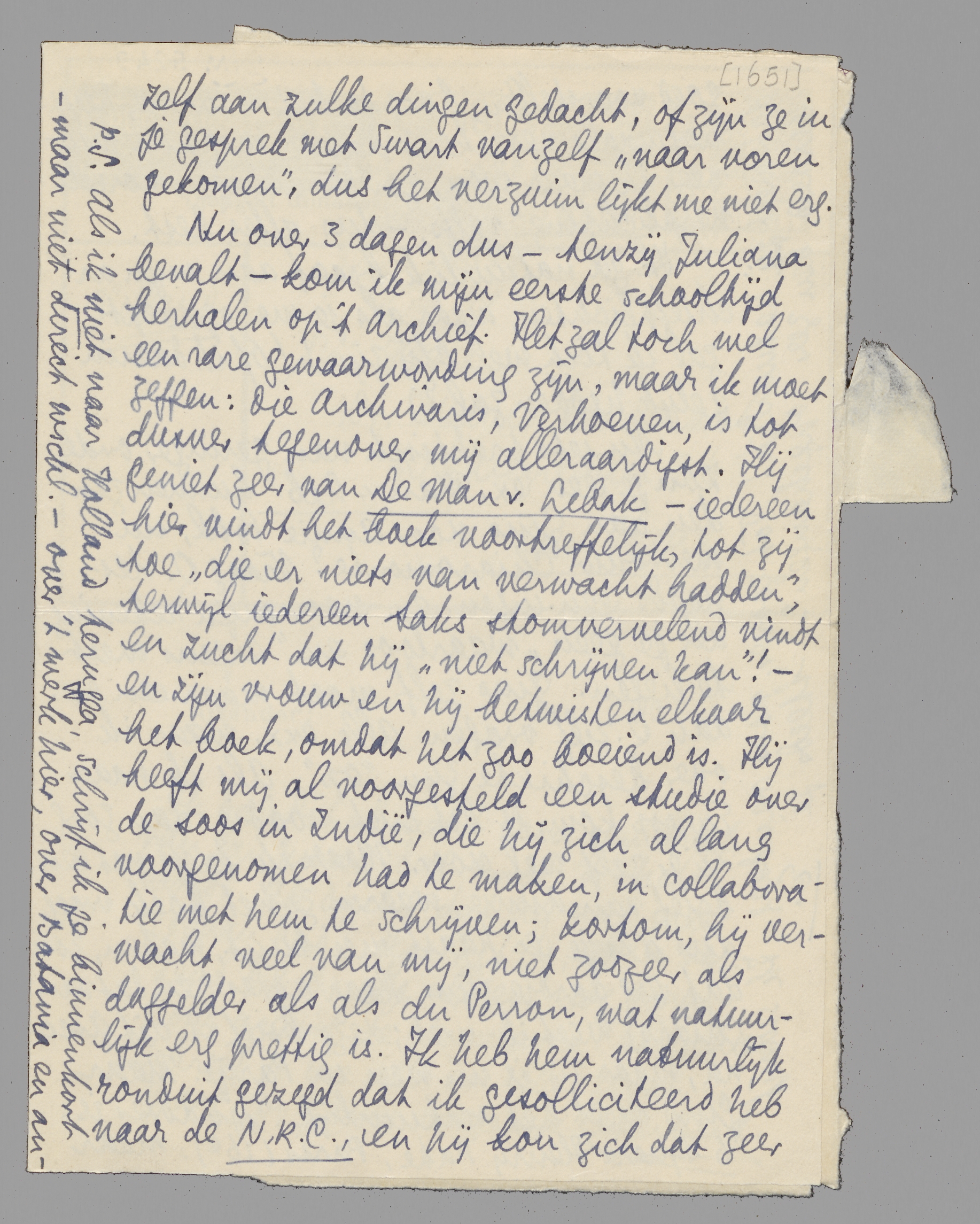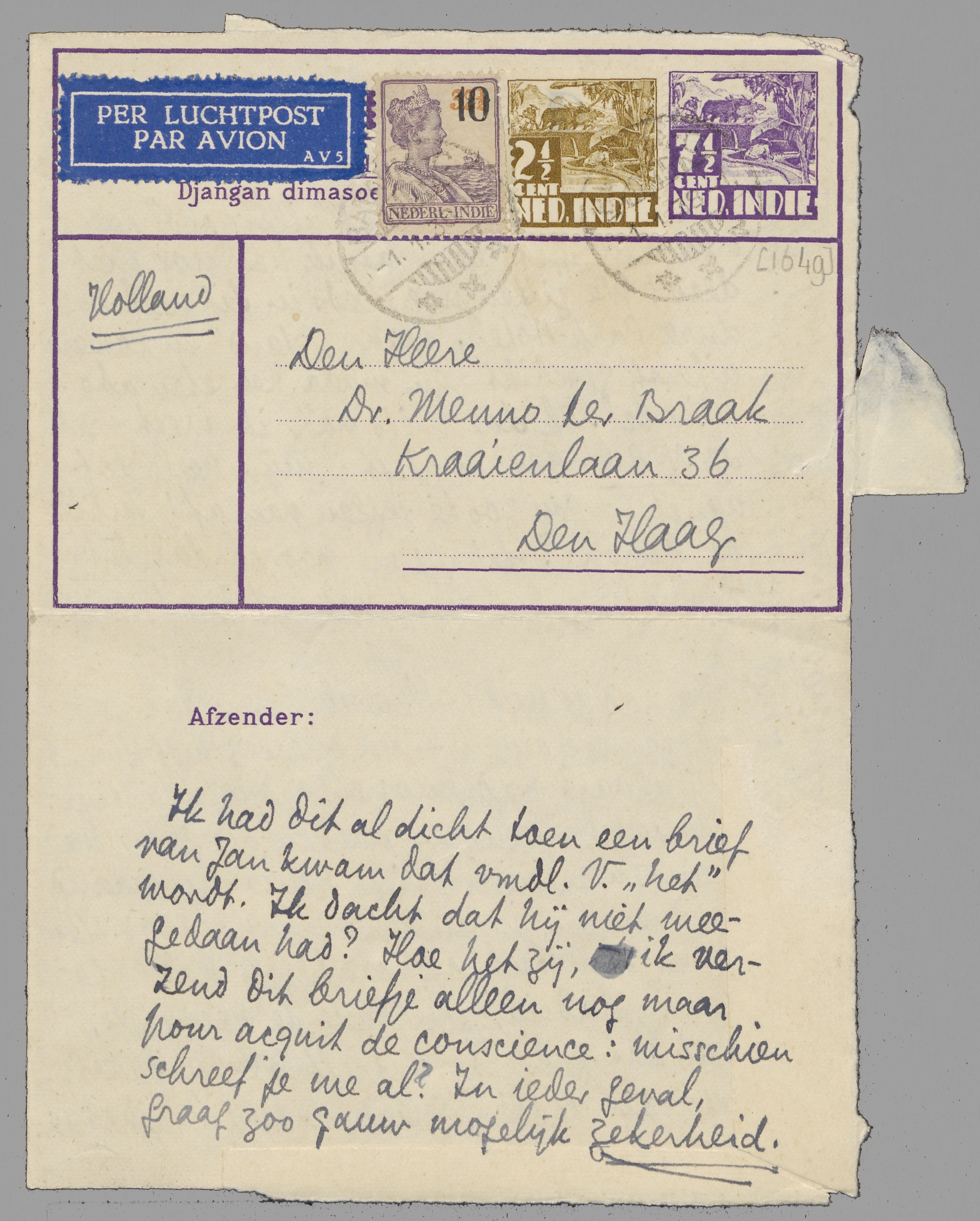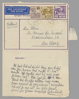 P.S. Als ik niet naar Holland terugga, schrijf ik je binnenkort- maar niet direct wschl. - over 't werk hier, over Batavia en andere zaken. Ik zend je ook een bespr. in briefvorm van de M.v.Leb. door Samkalden. Doorzenden aan Greshoff!
