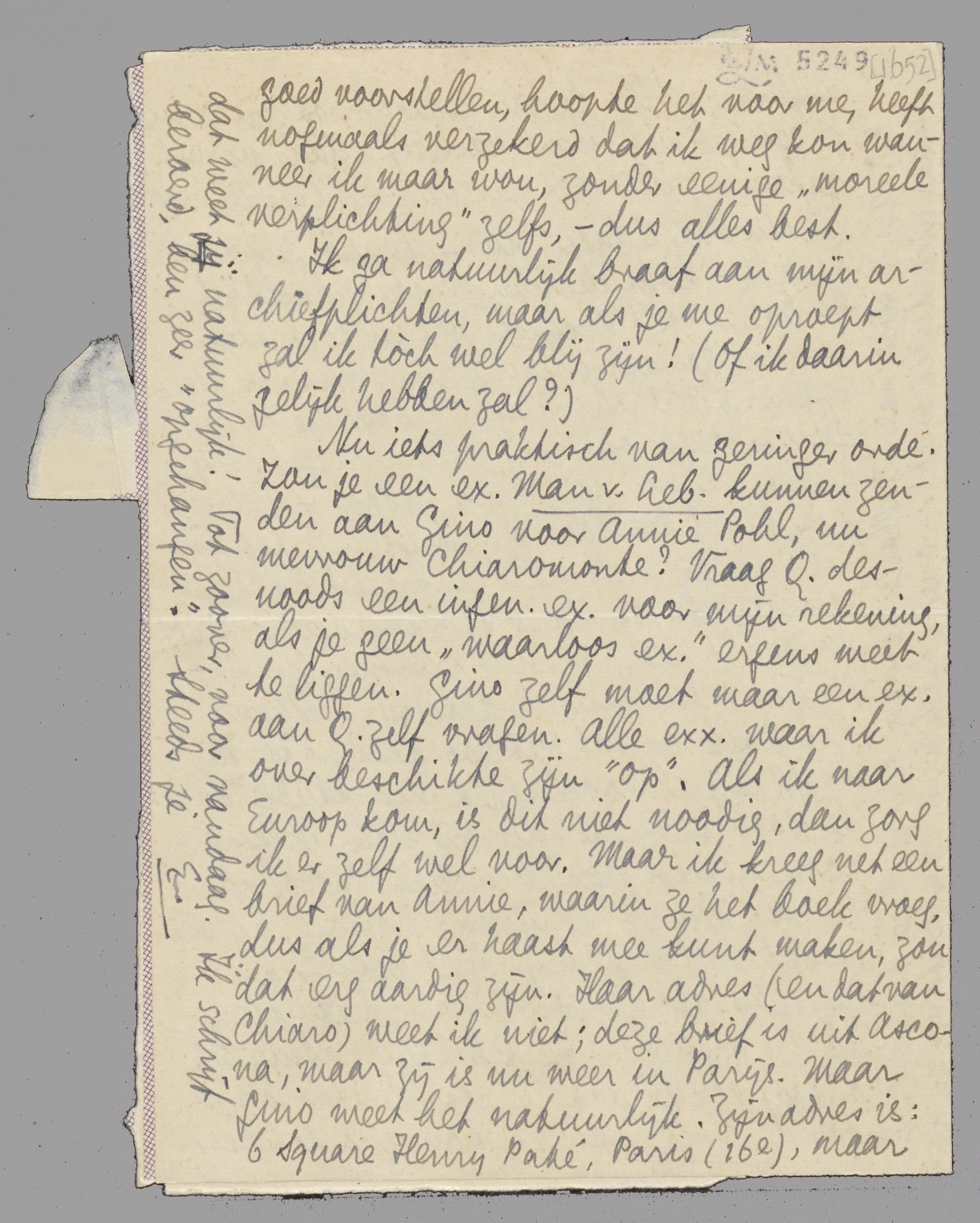 Nu iets praktisch van geringer orde. Zou je een ex. Man v. Leb. kunnen zenden aan Gino voor Annie Pohl, nu mevrouw Chiaromonte? Vraag Q. desnoods een ingen. ex. voor mijn rekening, als je geen ‘waarloos ex.’ ergens weet te liggen. Gino zelf moet maar een ex. aan Q. zelf vragen. Alle ex. waar ik over beschikte zijn ‘op’. Als ik naar Euroop kom, is dit niet noodig, dan zorg ik er zelf wel voor. Maar ik kreeg net een brief van Annie, waarin ze het boek vroeg, dus als je er haast mee kunt maken, zou dat erg aardig zijn. Haar adres (en dat van Chiaro) weet ik niet; deze brief is uit Ascona, maar zij is nu weer in Parijs. Maar Gino weet het natuurlijk. Zijn adres is: 6 Square Henry Paté, Paris (16e), maar dat weet jij natuurlijk! Tot zoover voor vandaag. Ik schrijf beroerd, ben zeer ‘opgehangen’.