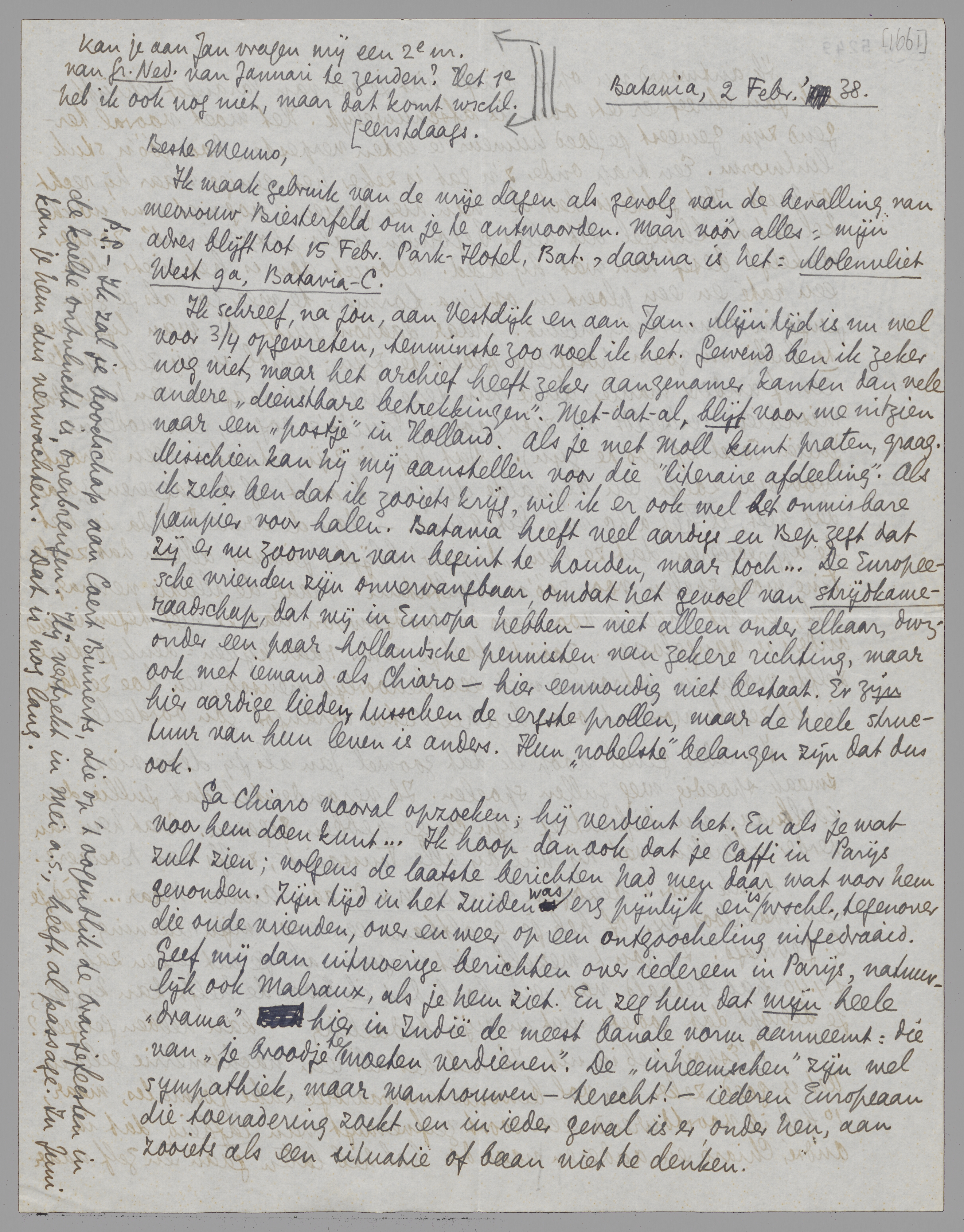 Ik schreef, na jou, aan Vestdijk en aan Jan. Mijn tijd is nu wel voor ¾ opgevreten, tenminste zoo voel ik het. Gewend ben ik zeker nog niet, maar het archief heeft zeker aangenamer kanten dan vele andere ‘dienstbare betrekkingen’. Met-dat-al, blijf voor me uitzien naar een ‘postje’ in Holland. Als je met Moll kunt praten, graag. Misschien kan hij mij aanstellen voor die ‘literaire afdeeling’. Als ik zeker ben dat ik zooiets krijg, wil ik er ook wel het onmisbare pampier voor halen. Batavia heeft veel aardigs en Bep zegt dat zij er nu zoowaar van begint te houden, maar toch... De Europeesche vrienden zijn onvervangbaar, omdat het gevoel van strijdkameraadschap, dat wij in Europa hebben niet alleen onder elkaar, dwz. onder een paar hollandsche pennisten van zekere richting, maar ook met iemand als Chiaro hier eenvoudig niet bestaat. Er zijn hier aardige lieden, tusschen de ergste prollen, maar de heele structuur van hun leven is anders. Hun ‘nobelste’ belangen zijn dat dus ook.