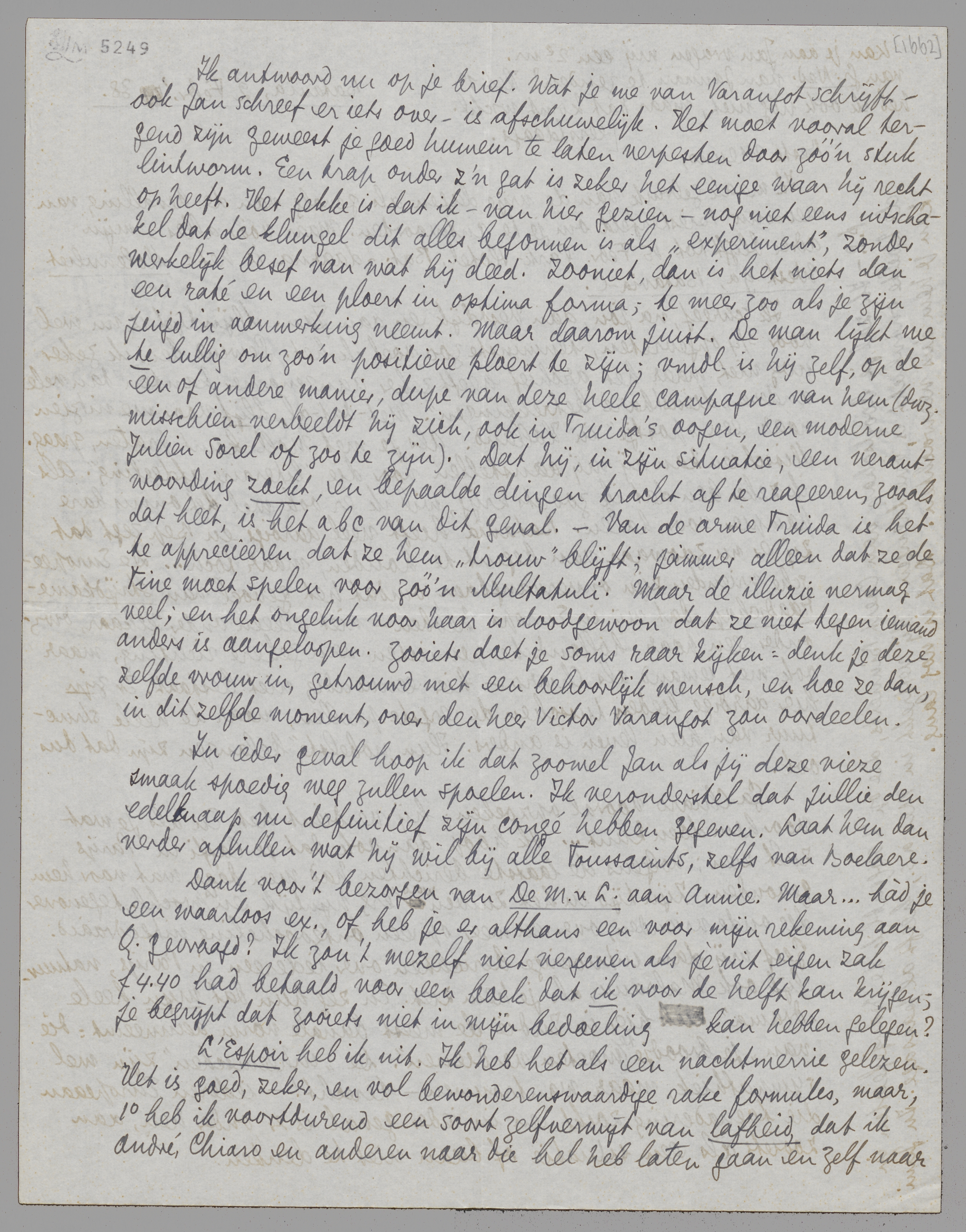 Ik antwoord nu op je brief. Wat je me van Varangot schrijft- ook Jan schreef er iets over - is afschuwelijk. Het moet vooral tergend zijn geweest je goed humeur te laten verpesten door zóó'n stuk lintworm. Een trap onder z'n gat is zeker het eenige waar hij recht op heeft. Het gekke is dat ik - van hier gezien - nog niet eens uitschakel dat de klungel dit alles begonnen is als ‘experiment’, zonder werkelijk besef van wat hij deed. Zooniet, dan is het niets dan een raté en een ploert in optima forma; te meer zoo als je zijn jeugd in aanmerking neemt. Maar daarom juist. De man lijkt me te lullig om zoo'n positieve ploert te zijn; vmdl. is hij zelf, op de een of andere manier, dupe van deze heele campagne van hem (dwz. misschien verbeeldt hij zich, ook in Truida's oogen, een moderne Julien Sorel of zoo te zijn). Dat hij, in zijn situatie, een verantwoording zoekt, en bepaalde dingen tracht af te reageeren, zooals dat heet, is het a b c van dit geval. Van de arme Truida is het te apprecieeren dat ze hem ‘trouw’ blijft; jammer alleen dat ze de Tine moet spelen voor zoo’n Multatuli. Maar de illuzie vermag veel; en het ongeluk voor haar is doodgewoon dat ze niet tegen iemand anders is aangeloopen. Zooiets doet je soms raar kijken: denk je deze zelfde vrouw in, getrouwd met een behoorlijk mensch, en hoe ze dan, in dit zelfde moment, over den heer Victor Varangot zou oordeelen.