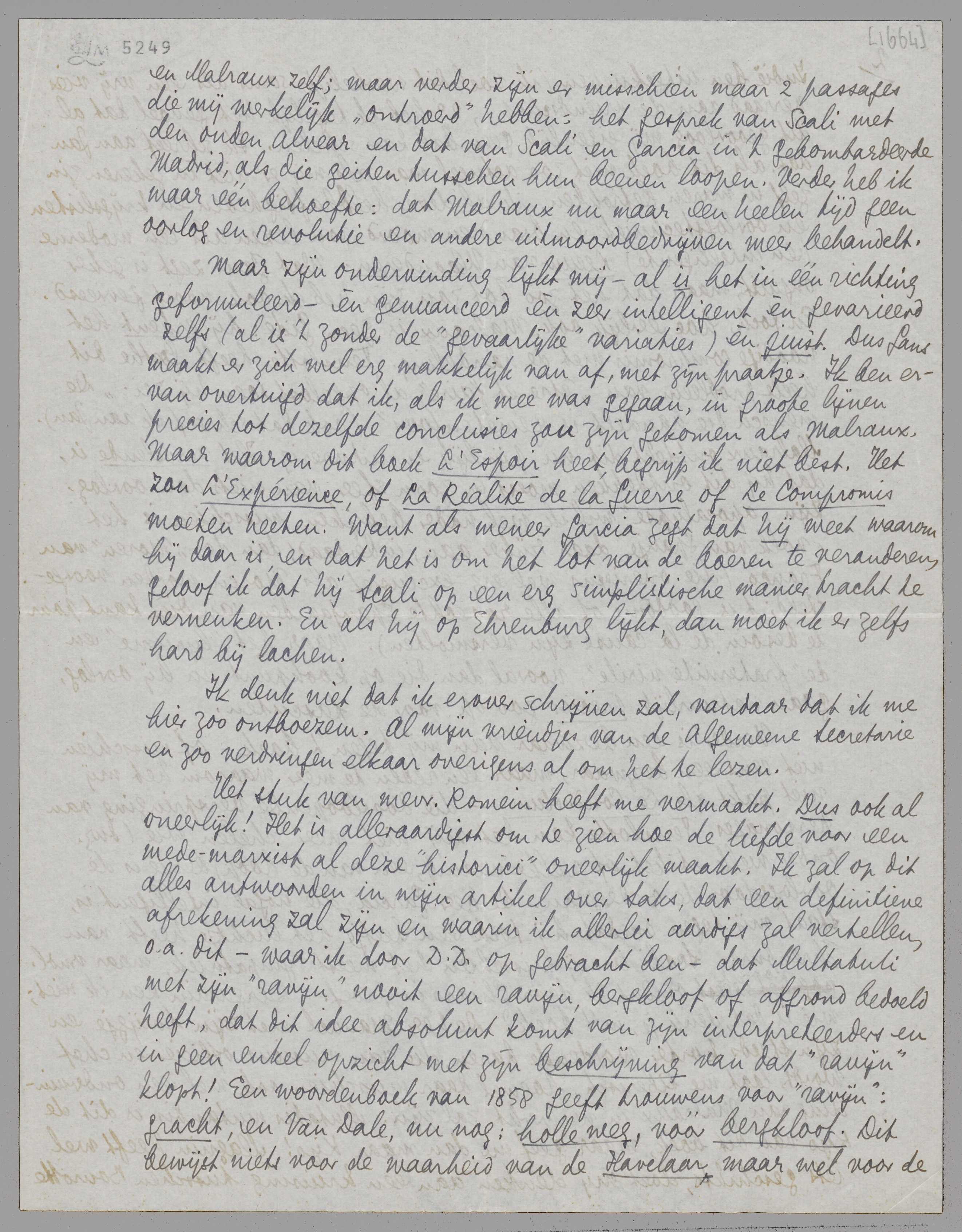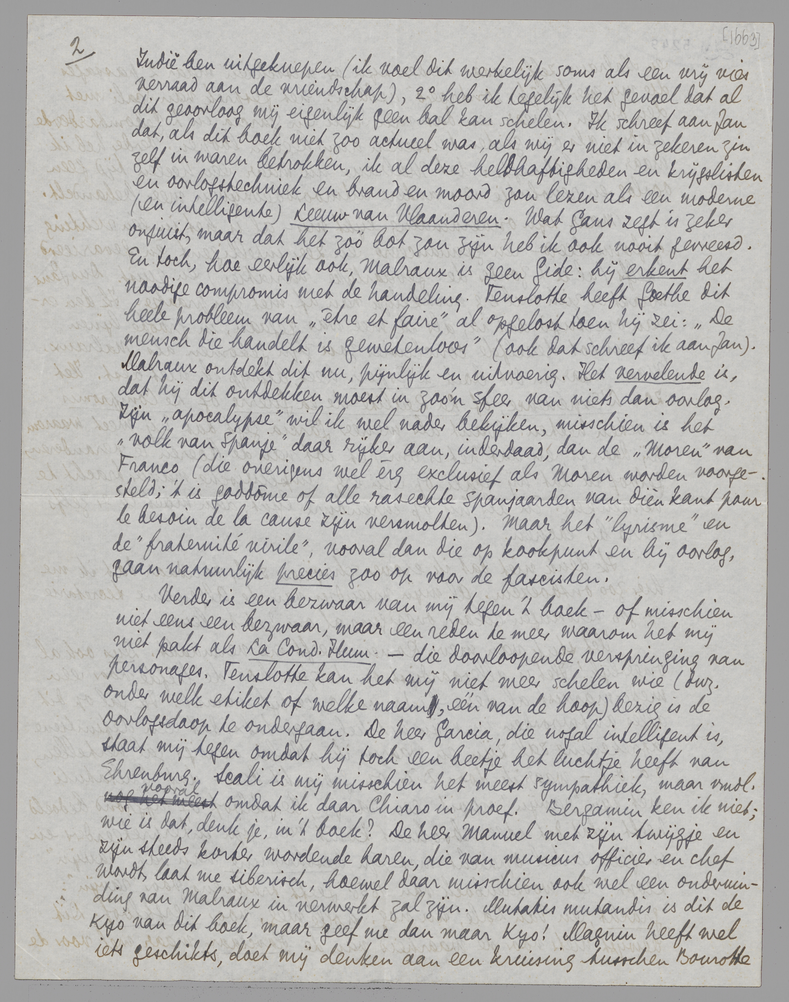 Verder is een bezwaar van mij tegen 't boek - of misschien niet eens een bezwaar, maar een reden te meer waarom het mij niet pakt als La Cond. Hum. - die doorloopende verspringing van personages. Tenslotte kan het mij niet meer schelen wie (dwz. onder welk etiket of welke naam, één van de hoop) bezig is de oorlogsdoop te ondergaan. De heer Garcia, die nogal intelligent is, staat mij tegen omdat hij toch een beetje het luchtje heeft van Ehrenburg. Scali is mij misschien het meest sympathiek, maar vmdl. vooral omdat ik daar Chiaro in proef. Bergamin ken ik niet; wie is dat, denk je, in 't boek? De heer Manuel met zijn twijgje en zijn steeds korter wordende haren, die van musicus officier en chef wordt, laat me siberisch, hoewel daar misschien ook wel een ondervinding van Malraux in verwerkt zal zijn. Mutatis mutandis is dit de Kyo van dit boek, maar geef me dan maar Kyo! Magnin heeft wel iets geschikts, doet mij denken aan een kruising tusschen Bourotte en Malraux zelf; maar verder zijn er misschien maar 2 passages die mij werkelijk ‘ontroerd’ hebben; het gesprek van Scali met den ouden Alvear en dat van Scali en Garcia in 't gebombardeerde Madrid, als die geiten tusschen hun beenen loopen. Verder heb ik nog maar één behoefte: dat Malraux nu maar een heelen tijd geen oorlog en revolutie en andere uitmoordbedrijven meer behandelt.