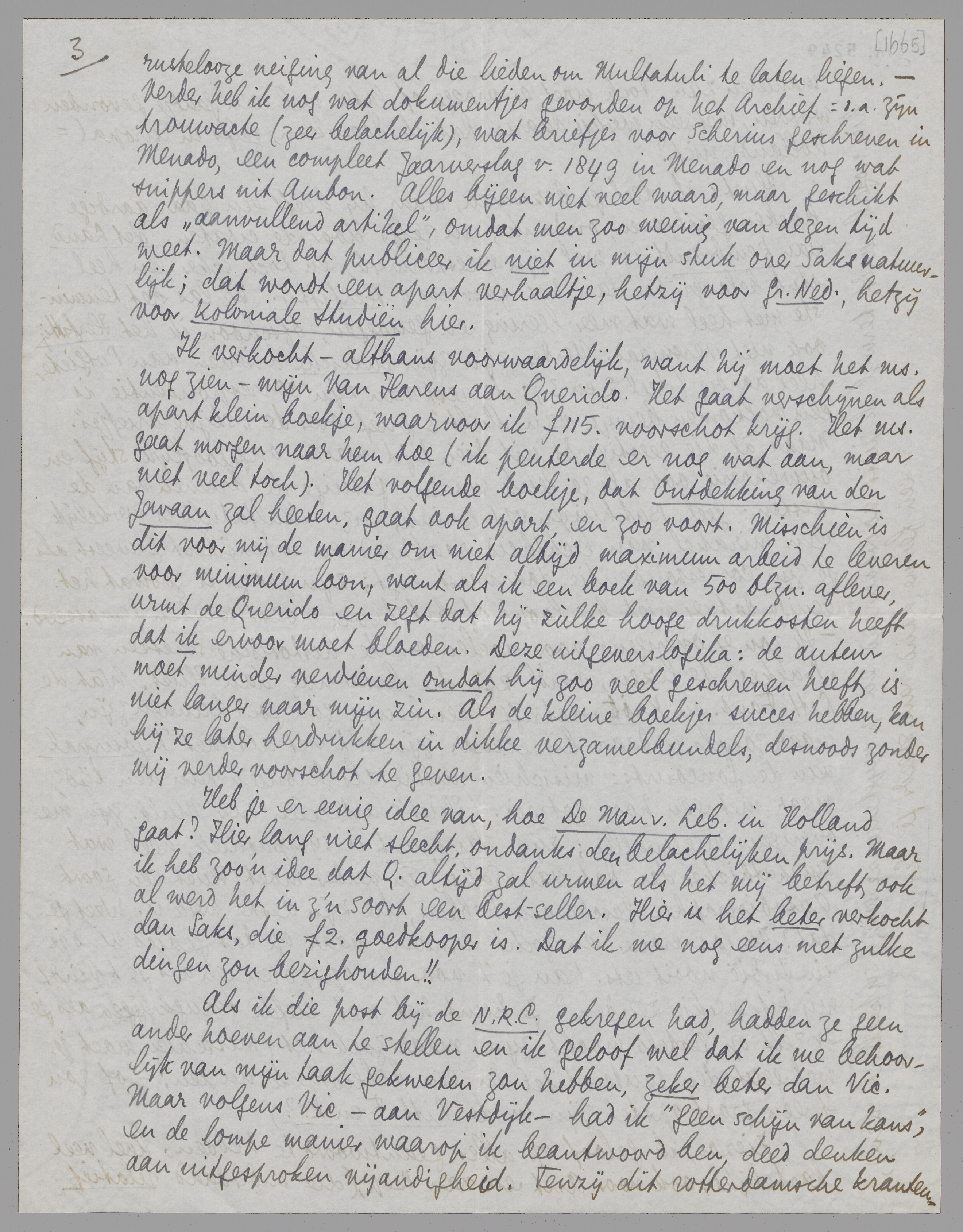 Ik verkocht - althans voorwaardelijk, want hij moet het ms. nog zien - mijn Van Harens aan Querido. Het gaat verschijnen als apart klein boekje, waarvoor ik ƒ 115. - voorschot krijg. Het ms. gaat morgen naar hem toe (ik peuterde er nog wat aan, maar niet veel toch). Het volgende boekje, dat Ontdekking van den Javaan zal heeten, gaat ook apart, en zoo voort. Misschien is dit voor mij de manier om niet altijd maximum arbeid te leveren voor minimum loon, want als ik een boek van 500 blzn. aflever, urmt de Querido en zegt dat hij zùlke hooge drukkosten heeft dat ik ervoor moet bloeden. Deze uitgeverslogika: de auteur moet minder verdienen omdat hij zoo veel geschreven heeft, is niet langer naar mijn zin. Als de kleine boekjes succes hebben, kan hij ze laten herdrukken in dikke verzamelbundels, desnoods zonder mij verder voorschot te geven.
