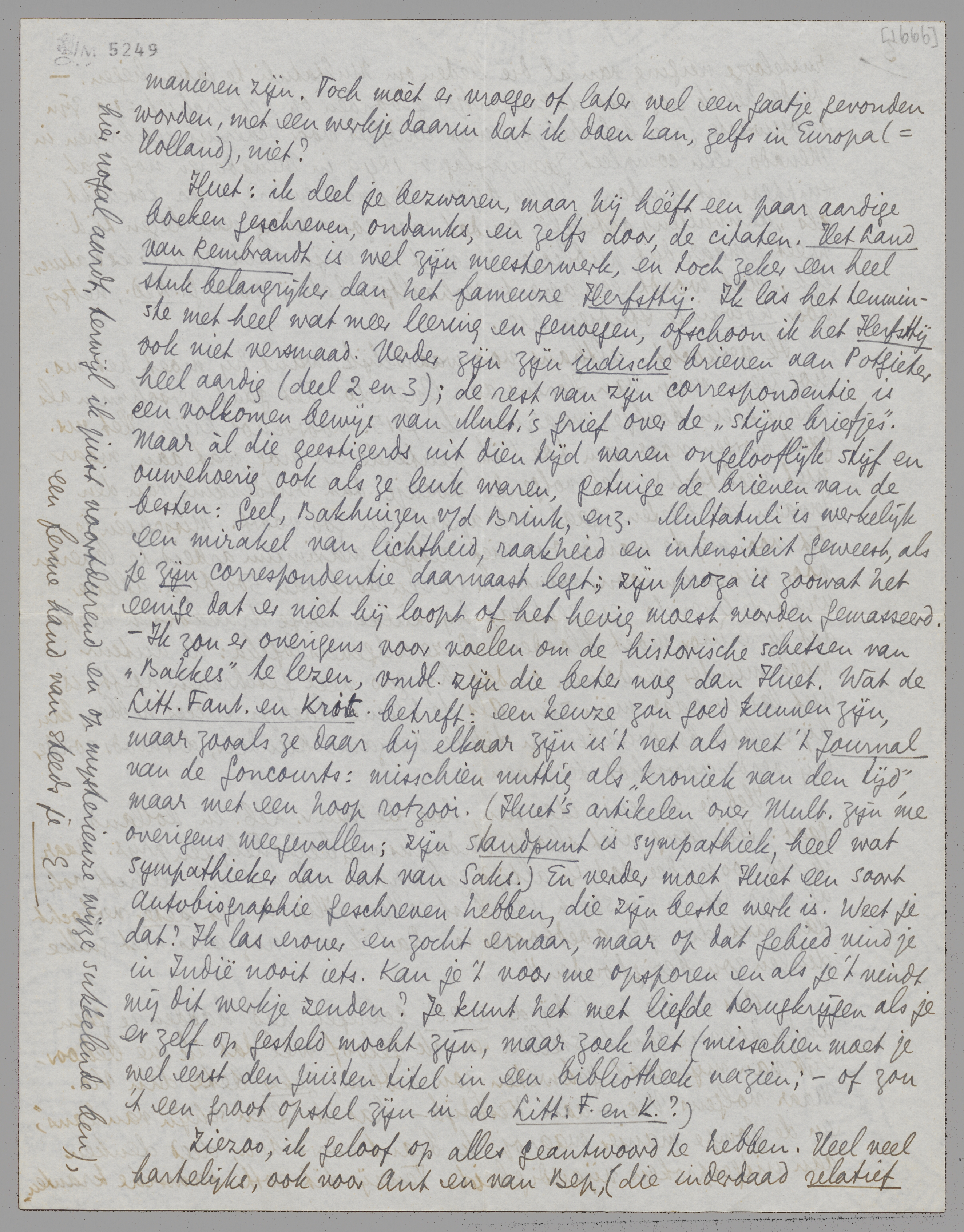 Huet: ik deel je bezwaren, maar hij hééft een paar aardige boeken geschreven, ondanks, en zelfs door, de citaten. Het Land van Rembrandt is wel zijn meesterwerk, en toch zeker een heel stuk belangrijker dan het fameuze Herfsttij. Ik las het tenminste met heel wat meer leering en genoegen, ofschoon ik het Herfsttij ook niet versmaad. Verder zijn zijn indische brieven aan Potgieter heel aardig (deel 2 en 3); de rest van zijn correspondentie is een volkomen bewijs van Mult.'s grief over de ‘stijve briefjes’. Maar àl die geestigerds uit dien tijd waren ongelooflijk stijf en ouwehoerig ook als ze leuk waren, getuige de brieven van de besten: Geel, Bakhuizen v/d Brink, enz. Multatuli is werkelijk een mirakel van lichtheid, raakheid en intensiteit geweest, als je zijn correspondentie daarnaast legt; zijn proza is zoowat het eenige dat er niet bij loopt of het hevig moest worden gemasseerd. - Ik zou er overigens voor voelen om de historische schetsen van ‘Bakkes’ te lezen, vmdl. zijn die beter nog dan Huet. Wat de Litt. Fant. en Krit. betreft: een keuze zou goed kunnen zijn, maar zooals ze daar bij elkaar zijn is 't net als met 't Journal van de Goncourts: misschien nuttig als ‘kroniek van den tijd’, maar met een hoop rotzooi. (Huet's artikelen over Mult. zijn me overigens meegevallen; zijn standpunt is sympathiek, heel wat sympathieker dan dat van Saks.) En verder moet Huet een soort autobiographie geschreven hebben, die zijn beste werk is. Weet je dat? Ik las erover en zocht ernaar, maar op dat gebied vind je in Indië nooit iets. Kan je 't voor me opsporen en als je 't vindt mij dit werkje zenden? Je kunt het met liefde terugkrijgen als je er zelf op gesteld mocht zijn, maar zoek het (misschien moet je wel eerst den juisten titel in een bibliotheek nazien; - of zou 't een groot opstel zijn in de Litt: F. en K.?)