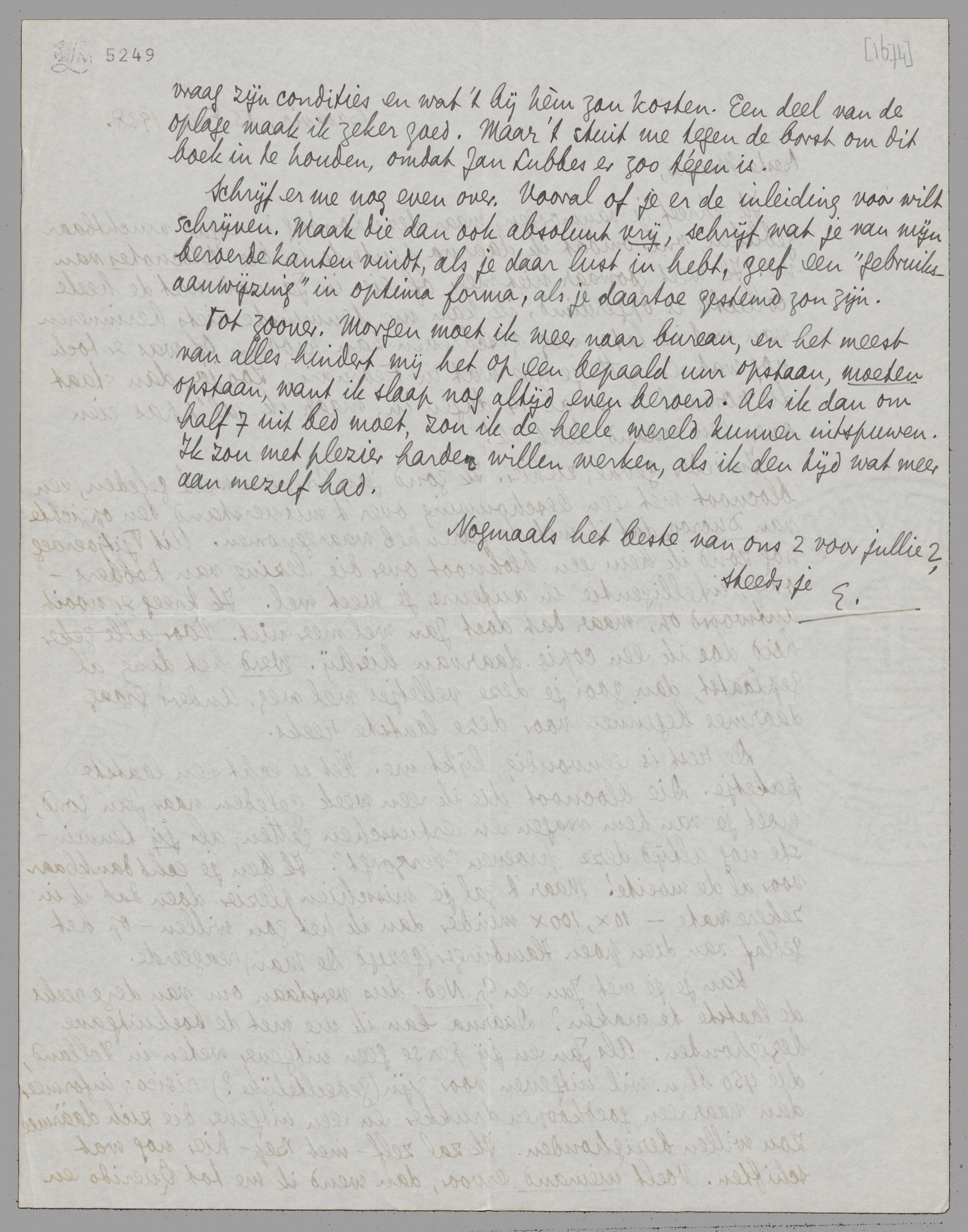 Kan je je met Jan en Gr. Ned. dus verstaan om van deze reeks de laatste te maken? Daarna kan ik me met de boekuitgave bezighouden. Als Jan en jij perse geen uitgever weten in Holland, die 450 blzn. wil uitgeven voor zijn (gedeeltelijke?) risico; informeer dan naar een goedkoopen drukker en een uitgever die zich dààrmee zou willen bezighouden. Ik zal zelf - met Bep - hier nog wat schiften. Voelt niemand ervoor, dan wend ik me tot Querido en vraag zijn condities en wat 't bij hèm zou kosten. Een deel van de oplage maak ik zeker goed. Maar 't stuit me tegen de borst om dit boek in te houden, omdat Jan Lubbes er zoo tégen is.