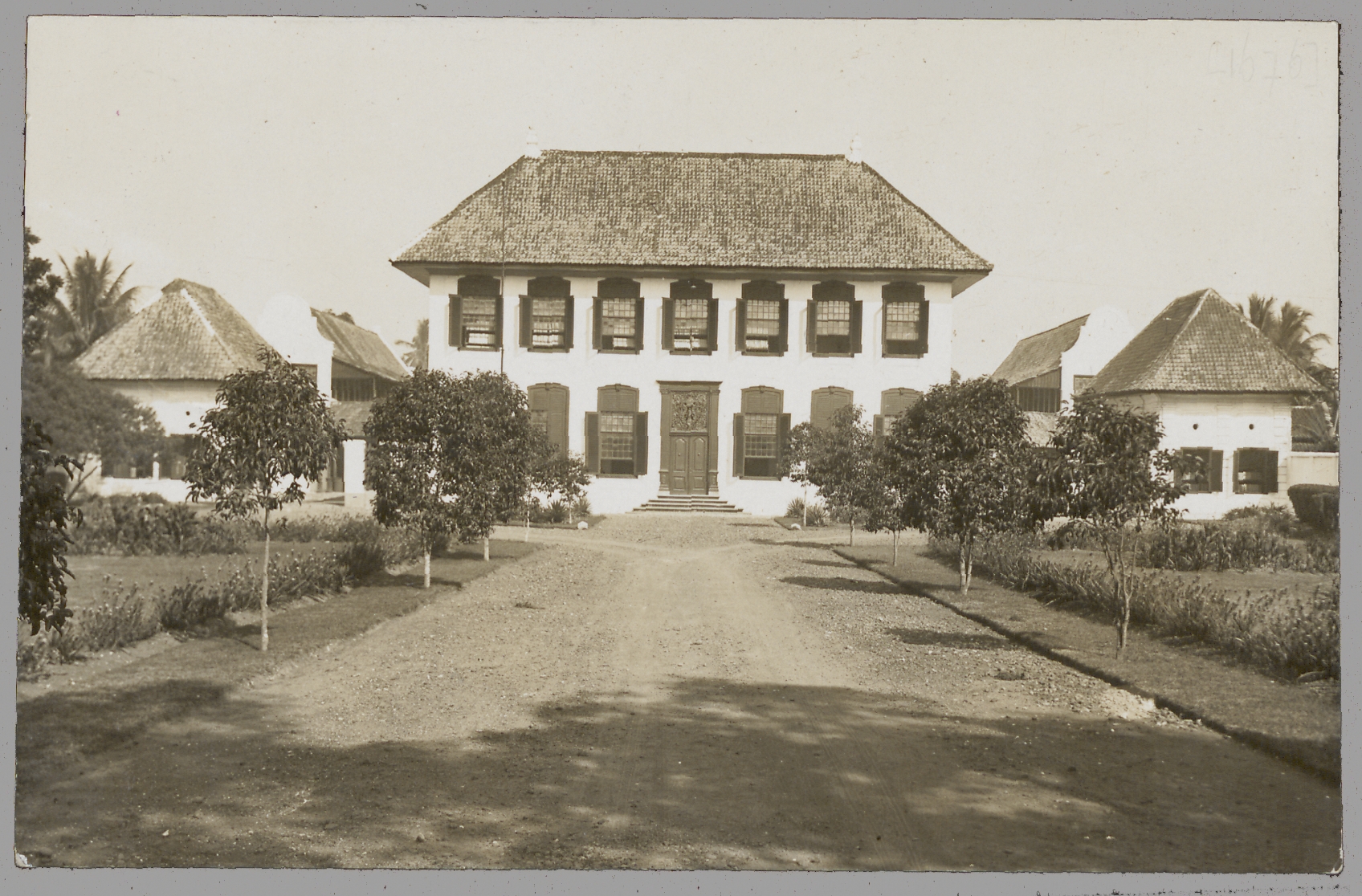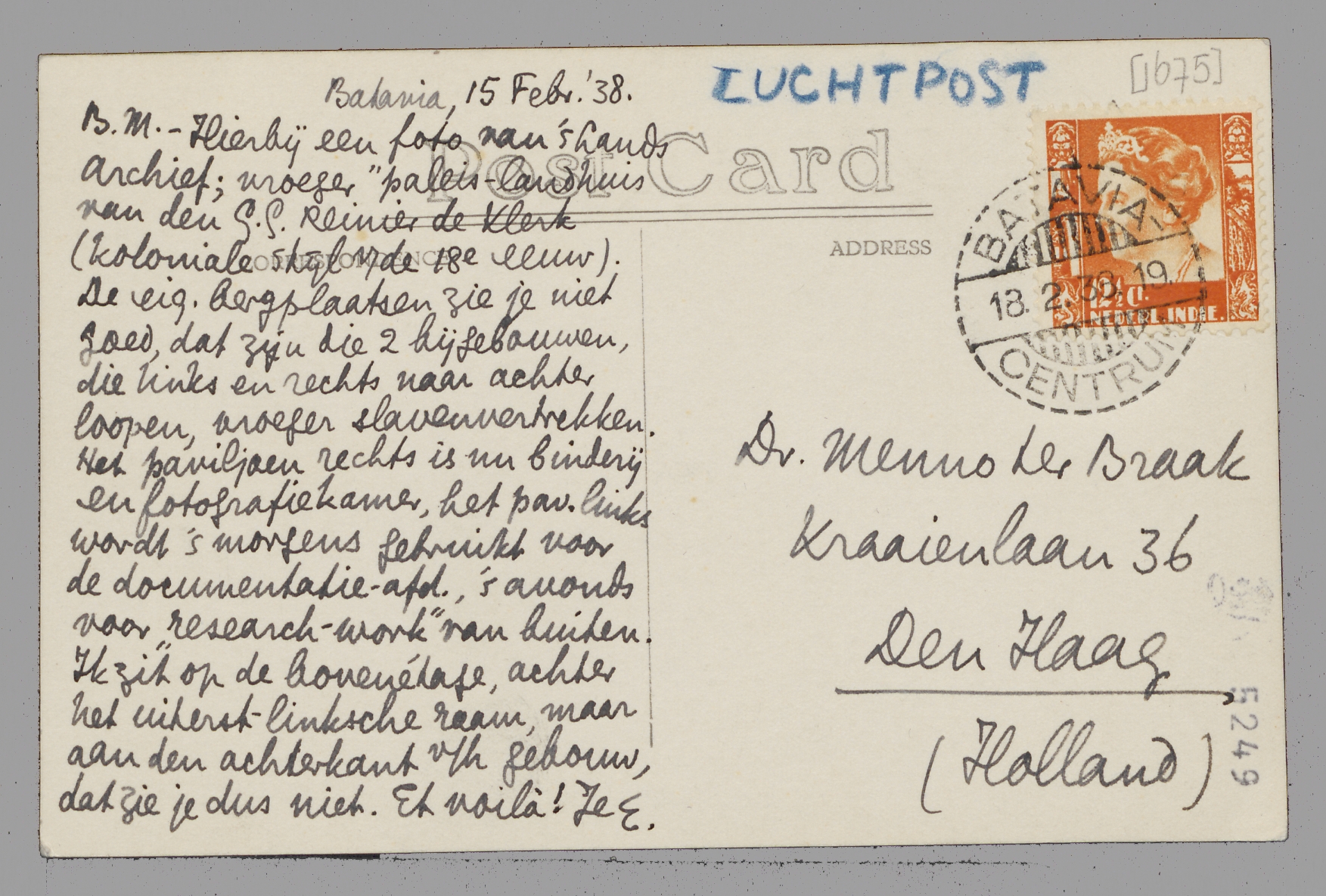 Hierbij een foto van 's Lands Archief; vroeger ‘paleislandhuis’ van den G.G. Reinier de Klerk (koloniale stijl v/de 18e eeuw). De eig. bergplaatsen zie je niet goed, dat zijn die 2 bijgebouwen, die links en rechts naar achter loopen, vroeger slavenvertrekken. Het paviljoen rechts is nu binderij en fotografiekamer, het pav. links wordt 's morgens gebruikt voor de documentatie-afd., 's avonds voor ‘research-work’ van buiten. Ik zit op de bovenétage, achter het uiterst-linksche raam, maar aan den achterkant v/h gebouw, dat zie je dus niet. Et voilà! Je