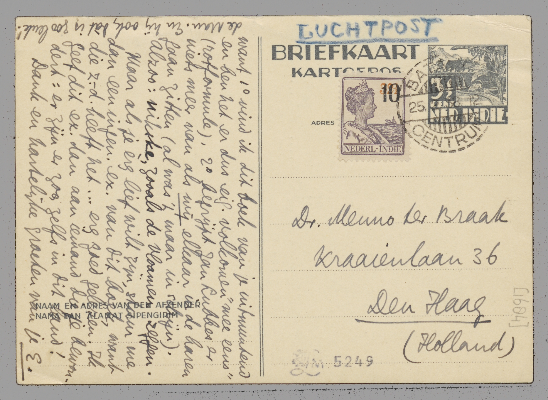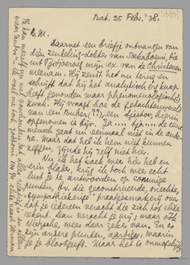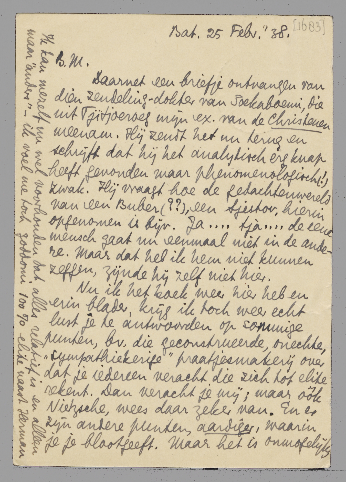 Daarnet een briefje ontvangen van dien zendelingdokter van Soekaboemi, die uit Tjitjoeroeg mijn ex. van de Christenen meenam. Hij zendt het nu terug en schrijft dat hij het analytisch erg knap heeft gevonden maar phenomenologisch (!) zwak. Hij vraagt hoe de gedachtenwereld van een Buber (??), een Sjestov, hierin opgenomen is bijv. Ja... tjà... de eene mensch gaat nu eenmaal niet in de andere. Maar dat heb ik hem niet kunnen zeggen, zijnde hij zelf niet hier.