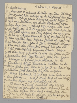 Daarnet 2 nieuwe briefk. van Jan. Ik schrijf jou, omdat hem schrijven in dit geval een omweg is. Als je zoo'n bezwaar hebt tegen 't cad. van Robbers, werk die bloknoot tegen hem dan om, - schrap zijn naam, doe wat je wilt. Mij is 't de moeite niet waard, omdat de holl. opinie me tòch ergert, en aan een R. die in 't hiernamaals lijdt omdat hij niet van repliek kan dienen geloof ik niet - of indien jà, dan zou 't geen verschil uitmaken met den levende, want die zou óók niet van repliek kunnen dienen. Maar de standing v. Gr. Ned. is iets, en jouw en J's gevoelen ook. Me dunkt: met een paar krassen is 't ding ontrobberst, en de strekking blijft bewaard. Robbers en De Man gaan hier hand-in-hand en Ben v. Eysselstein geeft handjes bij den uitgang.