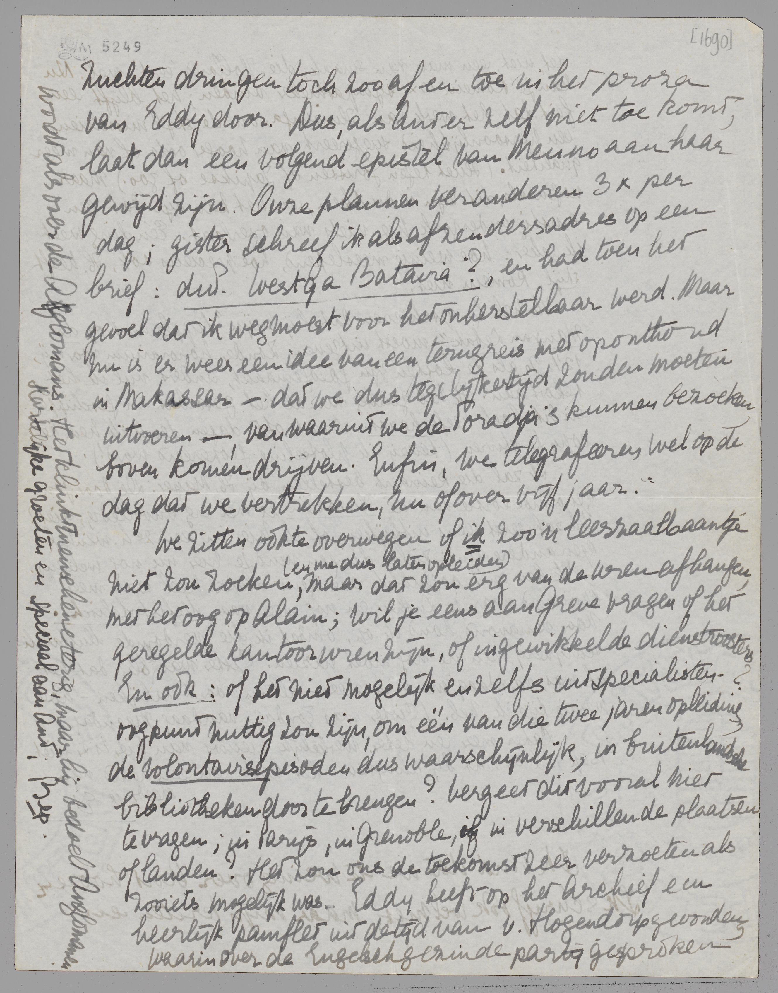 [E.d.P.-d.R.:] Ik vind dat we te weinig over Ant hooren. Ik schrijf ook wel niet, maar mijn kreten en zuchten dringen toch zoo af en toe in het proza van Eddy door. Dus, als Ant er zelf niet toe komt, laat dan een volgend epistel van Menno aan haar gewijd zijn. Onze plannen veranderen 3x per dag; gister schreef ik als afzendersadres op een brief: duP. West 9a Batavia?, en had toen het gevoel dat ik weg moest voor het onherstelbaar werd. Maar nu is er weer een idee van een terugreis met oponthoud in Makassar - dat we dus tegelijkertijd zouden moeten uitvoeren -, vanwaaruit we de Toradja's kunnen bezoeken, boven komen drijven. Enfin, we telegrafeeren wel op de dag dat we vertrekken, nu of over vijf jaar.