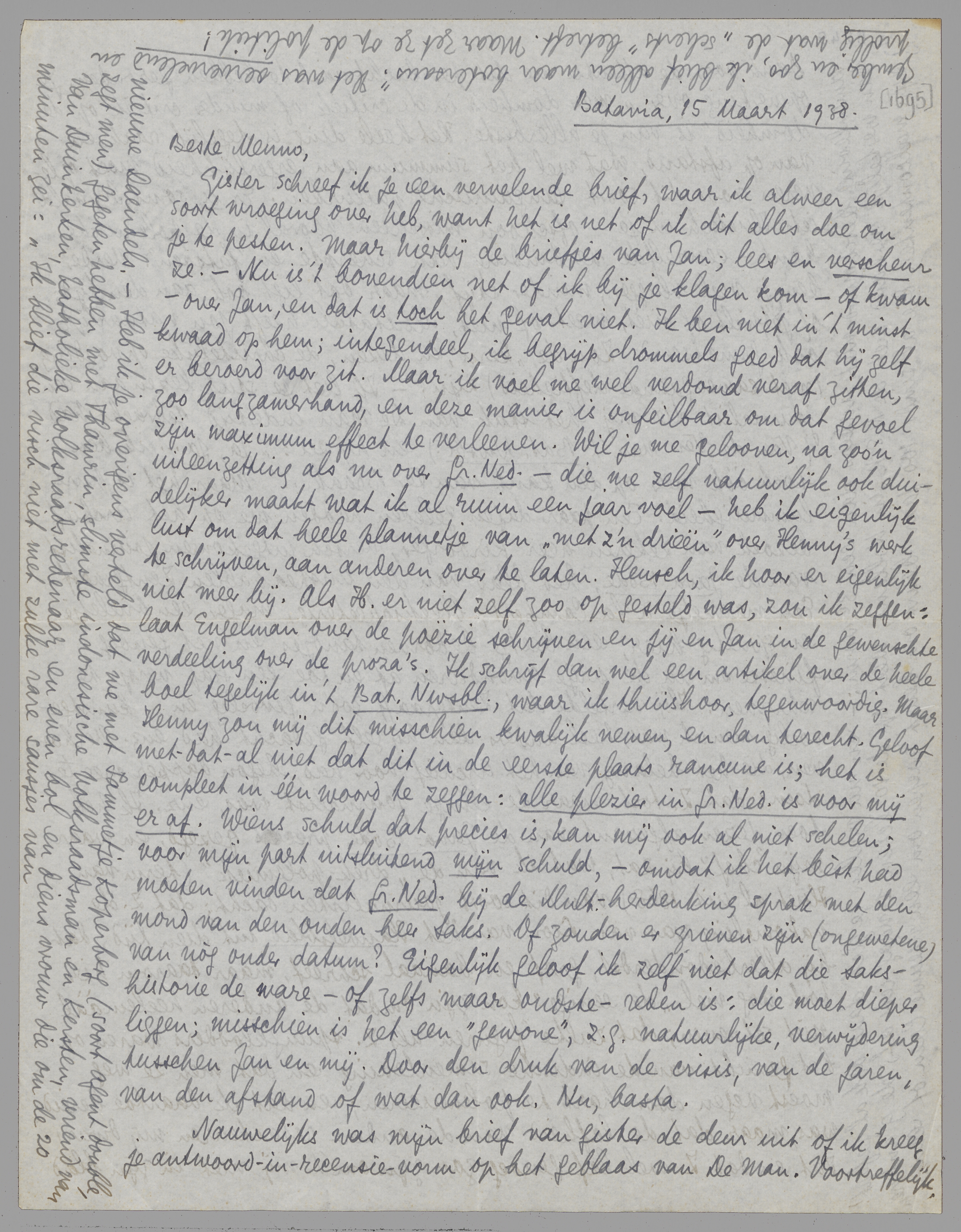 Gister schreef ik je een vervelende brief, waar ik alweer een soort wroeging over heb, want het is net of ik dit alles doe om je te pesten. Maar hierbij de briefjes van Jan; lees en verscheur ze. - Nu is 't bovendien net of ik bij je klagen kom - of kwam - over Jan, en dat is toch het geval niet. Ik ben niet in 't minst kwaad op hem; integendeel, ik begrijp drommels goed dat hij zelf er beroerd voor zit. Maar ik voel me wel verdomd veraf zitten, zoo langzamerhand, en deze manier is onfeilbaar om dat gevoel zijn maximum effect te verleenen. Wil je me gelooven, na zoo'n uiteenzetting als nu over Gr. Ned. - die me zelf natuurlijk ook duidelijker maakt wat ik al ruim een jaar voel - heb ik eigenlijk lust om dat heele plannetje van ‘met z'n drieën’ over Henny's werk te schrijven, aan anderen over te laten. Heusch, ik hoor er eigenlijk niet meer bij. Als H. er niet zelf zoo op gesteld was, zou ik zeggen: laat Engelman over de poëzie schrijven en jij en Jan in de gewenschte verdeeling over de proza's. Ik schrijf dan wel een artikel over de heele boel tegelijk in 't Bat. Nwsbl., waar ik thuishoor, tegenwoordig. Maar Henny zou mij dit misschien kwalijk nemen, en dan terecht. Geloof met-dat-al niet dat dit in de eerste plaats rancune is; het is compleet in één woord te zeggen: alle plezier in Gr. Ned. is voor mij er af. Wiens schuld dat precies is, kan mij ook al niet schelen; voor mijn part uitsluitend mijn schuld, - omdat ik het bèst had moeten vinden dat Gr. Ned. bij de Mult.-herdenking sprak met den mond van den ouden heer Saks. Of zouden er grieven zijn (ongewetene) van nòg ouder datum? Eigenlijk geloof ik zelf niet dat die Saks-historie de ware - of zelfs maar oudste reden is: die moet dieper liggen; misschien is het een ‘gewone’, z.g. natuurlijke, verwijdering tusschen Jan en mij. Door den druk van de crisis, van de jaren, van den afstand of wat dan ook. Nu, basta.