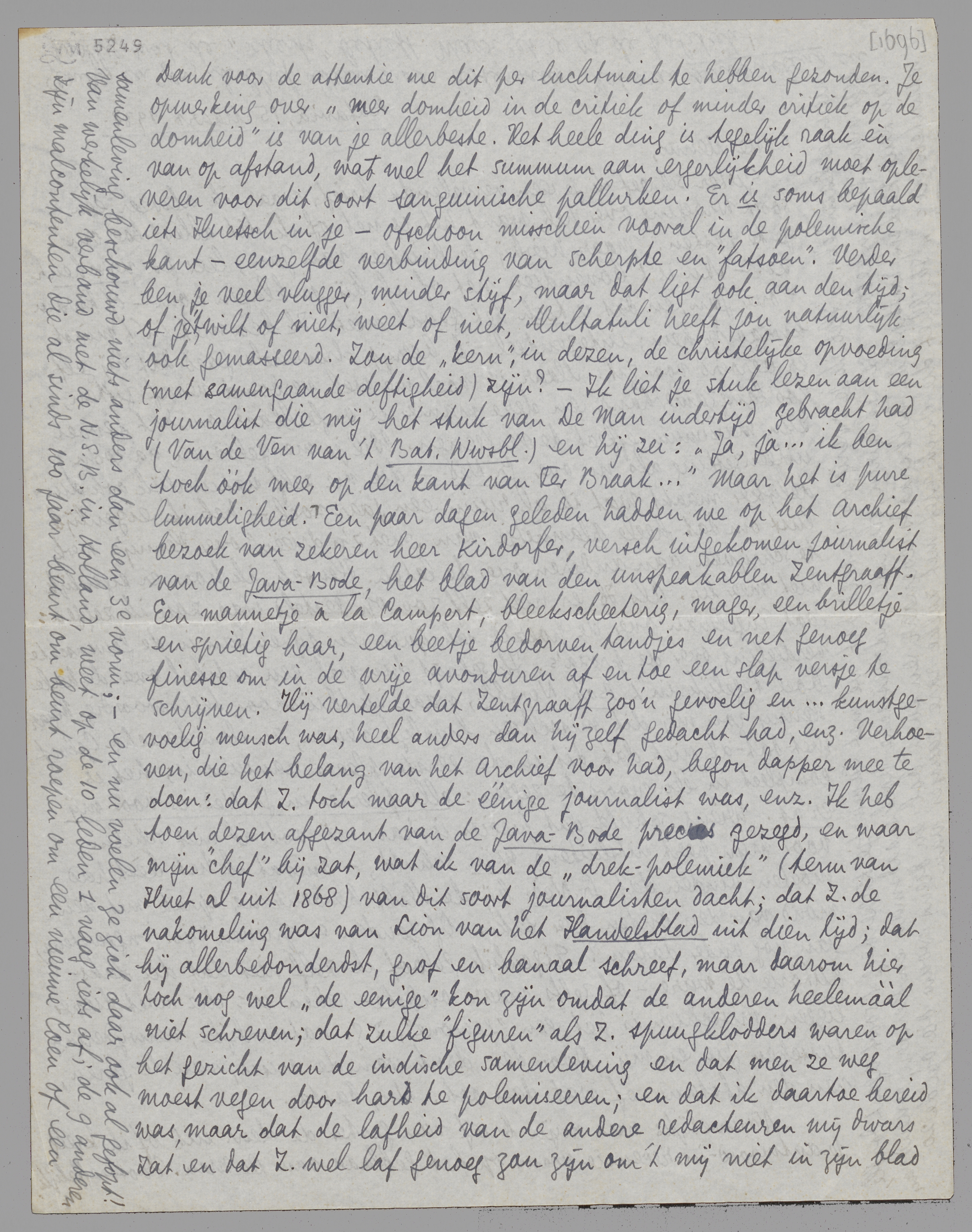 Dank voor de attentie me dit per luchtmail te hebben gezonden. Je opmerking over ‘meer domheid in de critiek of minder critiek op de domheid’ is van je allerbeste. Het heele ding is tegelijk raak èn van op afstand, wat wel het summum aan ergerlijkheid moet opleveren voor dit soort sanguinische pallurken. Er is soms bepaald iets Huetsch in je - ofschoon misschien vooral in de polemische kant - eenzelfde verbinding van scherpte en ‘fatsoen’. Verder ben je veel vlugger, minder stijf, maar dat ligt ook aan den tijd; of je 't wilt of niet, weet of niet, Multatuli heeft jou natuurlijk ook gemasseerd. Zou de ‘kern’, in dezen, de christelijke opvoeding (met samengaande deftigheid) zijn? - Ik liet je stuk lezen aan een journalist die mij het stuk van De Man indertijd gebracht had (Van de Ven van 't Bat. Nwsbl.) en hij zei: ‘Ja, ja... ik ben toch óók meer op den kant van Ter Braak...’ Maar het is pure lummeligheid. Een paar dagen geleden hadden we op het Archief bezoek van zekeren heer Kirdorfer, versch uitgekomen journalist van de Java-Bode, het blad van den unspeakablen Zentgraaff. Een mannetje à la Campert, bleekscheeterig, mager, een brilletje en sprietig haar, een beetje bedorven tandjes en net genoeg finesse om in de vrije avonduren af en toe een slap versje te schrijven. Hij vertelde dat Zentgraaff zoo'n gevoelig en... kunstgevoelig mensch was, heel anders dan hij zelf gedacht had, enz. Verhoeven, die het belang van het Archief voor had, begon dapper mee te doen: dat Z. toch maar de éénige journalist was, enz. Ik heb toen dezen afgezant van de Java-Bode precies gezegd, en waar mijn ‘chef’ bij zat, wat ik van de ‘drek-polemiek’ (term van Huet al uit 1868) van dit soort journalisten dacht; dat Z. de nakomeling was van Lion van het Handelsblad uit dien tijd; dat hij allerbedonderdst, grof en banaal schreef, maar daarom hier toch nog wel ‘de eenige’ kon zijn omdat de anderen heelemààl niet schreven; dat zulke ‘figuren’ als Z. spuugklodders waren op het gezicht van de indische samenleving en dat men ze weg moest vegen door hard te polemiseeren; en dat ik daartoe bereid was, maar dat de lafheid van de andere redacteuren mij dwars zat en dat Z. wel laf genoeg zou zijn om 't mij niet in zijn blad te laten doen, tenzij gedwongen door den rechter en dan in kleine letter in 't 6e blad tusschen de mutaties. De man heeft dit alles allervriendelijkst geslikt, en tot dusver heb ik nog geen ‘wraak’ gezien in de Java-Bode, noch tegen mij noch tegen 't Archief. Verhoeven is uiterst geschikt, maar hij mag me dan ook bepaald, dus hij gunt me zoo'n uitbarsting - hoewel die man kwam voor 't Archief. Ik ben daarna dan ook archiefambtenaar geworden en heb hem op mijn beurt snoezig rondgeleid, en briefjes laten zien waarin ons uit Den Haag - denk je in, òns, uit Holland! - Oranjehandteekeningen gevraagd werden door de Princevlag, een vereeniging die zulke briefjes beeindigt ‘met Oranjegroeten’. Verhoeven lacht daarom èn is er trotsch op! Ik ben blij dat die Z. nu wschl. toch wel weet hoe ik over hem denk. Maar men staat hier machteloos tegen hem omdat inderdaad iedere andere krant bang voor hem is. Ritman heeft scheetsgewijs 's mans Atjeh-boek besproken, omdat hij bang was dat ik 't zou willen doen. Toen ik hem erover opbelde, had hij 't al net gedaan, en we hebben elkaar over en weer, en om verschillende redenen, door de telefoon op hoongelach vergast. Nu moet je weten dat ook deze Ritman mij eigenlijk heel graag mag, zooals ik uit allerlei vriendschapsattentietjes kan merken. Ik zou hier vrienden kùnnen hebben, als het indische leven maar iets minder rottig was. Maar, voor zoover het de blanken betreft, zijn ze allemaal in het gareel gaan loopen van de ‘toestanden’ hier; en heusch, het is me soms net of er voor niemand uitkomst bestaat die hier 10 jaar achtereen aan het ‘publieke leven’ deel zou nemen, of je hier alleen maar de keus hebt tusschen twee mogelijkheden: tusschen 40 en 50 verloopen te zijn of verloopbaand.