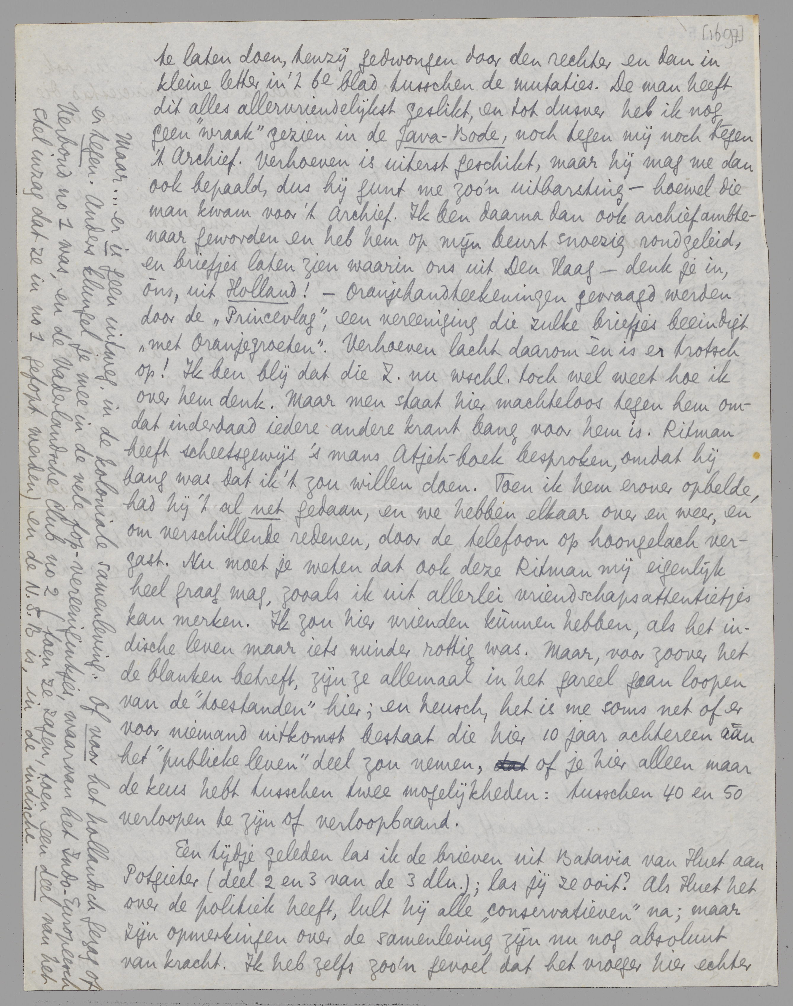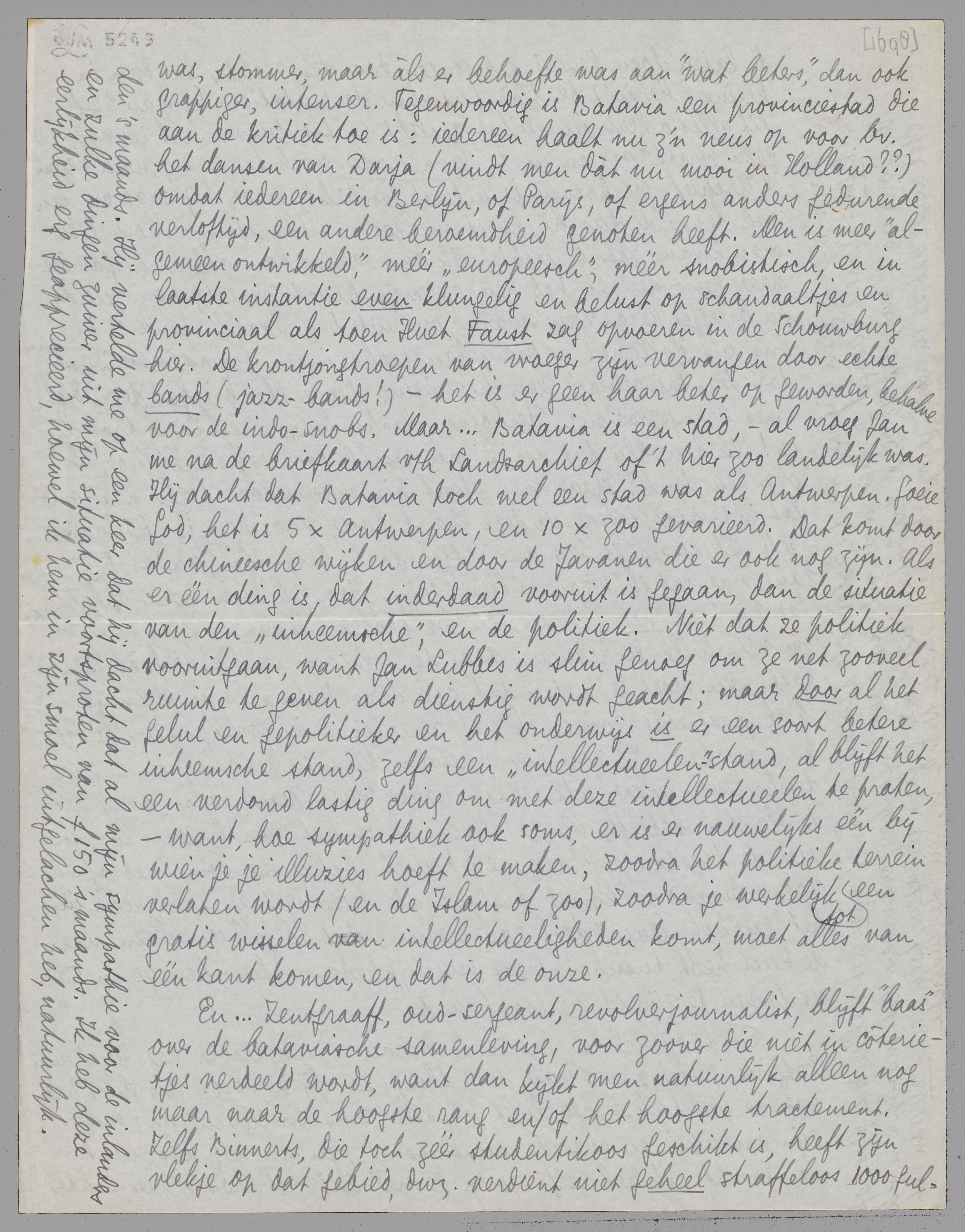 Een tijdje geleden las ik de brieven uit Batavia van Huet aan Potgieter (deel 2 en 3 van de 3 dln.); las jij ze ooit? Als Huet het over de politiek heeft, lult hij alle ‘conservatieven’ na; maar zijn opmerkingen over de samenleving zijn nu nog absoluut van kracht. Ik heb zelfs zoo'n gevoel dat het vroeger hier echter was, stommer, maar àls er behoefte was aan ‘wat beters’, dan ook grappiger, intenser. Tegenwoordig is Batavia een provinciestad die aan de kritiek toe is: iedereen haalt nu z'n neus op voor bv. het dansen van Darja (vindt men dàt nu mooi in Holland??) omdat iedereen in Berlijn, of Parijs, of ergens anders gedurende verloftijd, een andere beroemdheid genoten heeft. Men is meer ‘algemeen ontwikkeld’, méér ‘europeesch’, méér snobistisch, en in laatste instantie even klungelig en belust op schandaaltjes en provinciaal als toen Huet Faust zag opvoeren in de Schouwburg hier. De krontjongtroepen van vroeger zijn vervangen door echte bands (jazz-bands!) - het is er geen haar beter op geworden, behalve voor de indo-snobs. Maar... Batavia is een stad, - al vroeg Jan me na de briefkaart v/h Landsarchief of 't hier zoo landelijk was. Hij dacht dat Batavia toch wel een stad was als Antwerpen. Goeie God, het is 5× Antwerpen, en 10× zoo gevarieerd. Dat komt door de chineesche wijken en door de Javanen die er ook nog zijn. Als er één ding is, dat inderdaad vooruit is gegaan, dan de situatie van den ‘inheemsche’, en de politiek. Niet dat ze politiek vooruitgaan, want Jan Lubbes is slim genoeg om ze net zooveel ruimte te geven als dienstig wordt geacht; maar door al het gelul en gepolitieker en het onderwijs is er een soort betere inheemsche stand, zelfs een ‘intellectueelen’-stand, al blijft het een verdomd lastig ding om met deze intellectueelen te praten, - want, hoe sympathiek ook soms, er is er nauwelijks één bij wien je je illuzies hoeft te maken, zoodra het politieke terrein verlaten wordt (en de Islam of zoo), zoodra je werkelijk tot een gratis wisselen van intellectueeligheden komt, moet alles van één kant komen, en dat is de onze.