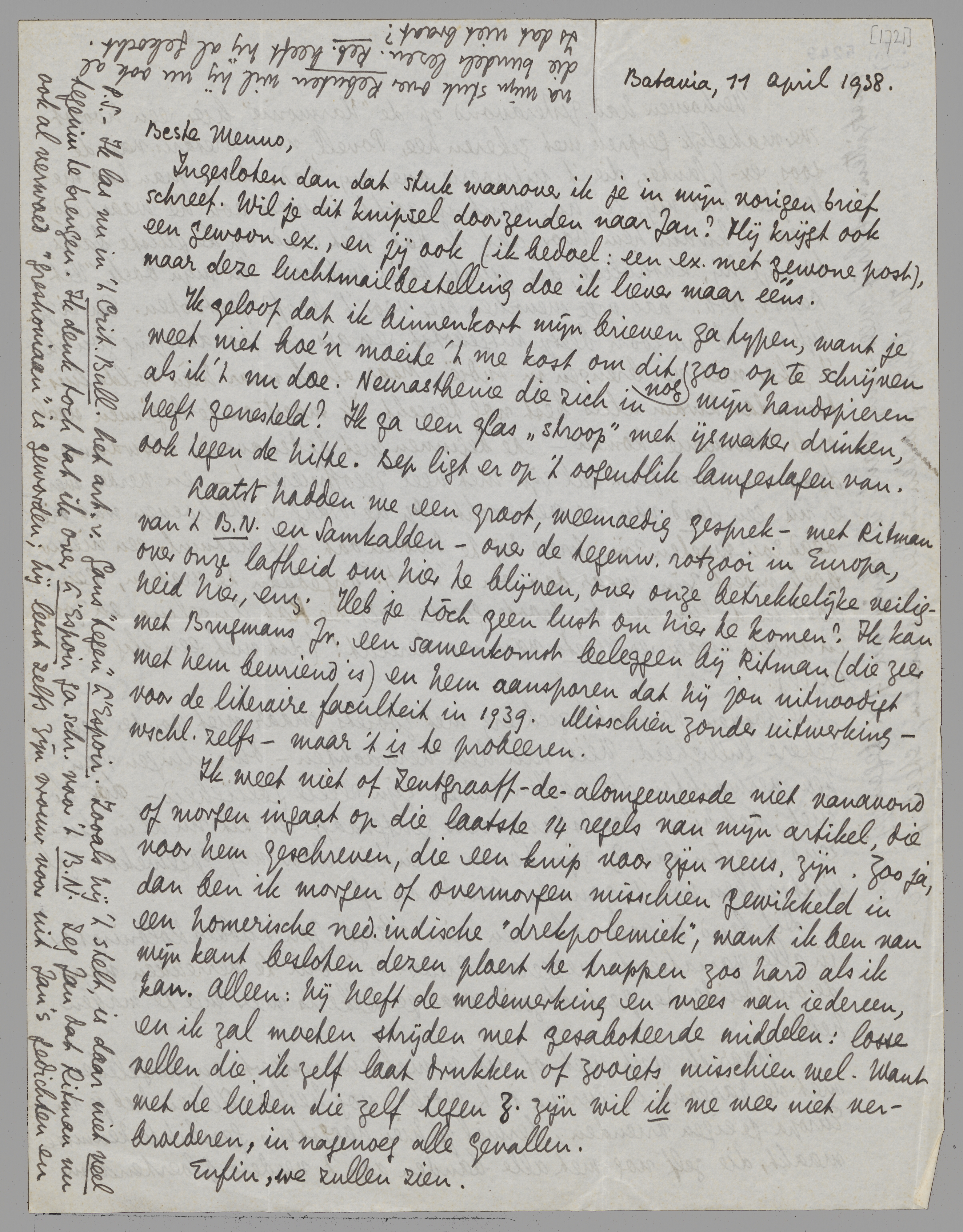 Laatst hadden we een groot, weemoedig gesprek - met Ritman van 't B.N. en Samkalden - over de tegenw. rotzooi in Europa, over onze lafheid om hier te blijven, over onze betrekkelijke veiligheid hier, enz. Heb je tòch geen lust om hier te komen? Ik kan met Brugmans Jr. een samenkomst beleggen bij Ritman (die zeer met hem bevriend is) en hem aansporen dat hij jou uitnoodigt voor de literaire faculteit in 1939. Misschien zonder uitwerking - wschl. zelfs - maar 't is te probeeren.