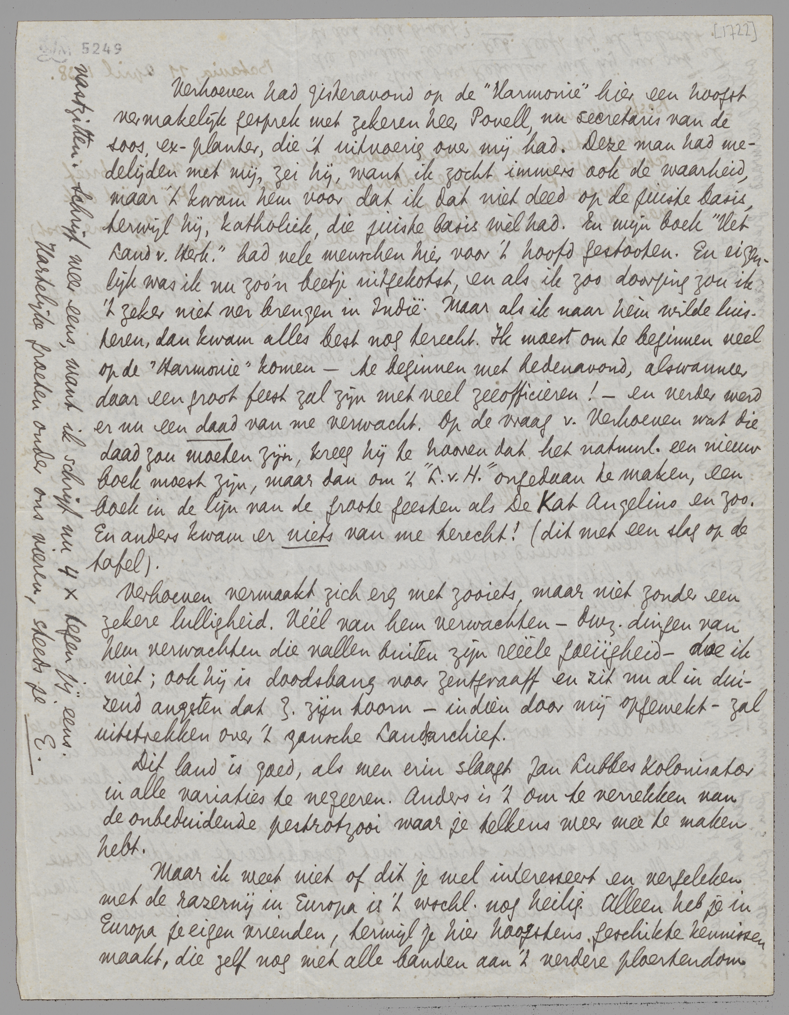 Verhoeven had gisteravond op de Harmonie hier een hoogst vermakelijk gesprek met zekeren heer Povell, nu secretaris van de soos, ex-planter, die 't uitvoerig over mij had. Deze man had medelijden met mij, zei hij, want ik zocht immers ook de waarheid, maar 't kwam hem voor dat ik dat niet deed op de juiste basis, terwijl hij, katholiek, die juiste basis wèl had. En mijn boek Het Land v.Herk. had vele menschen hier voor 't hoofd gestooten. En eigenlijk was ik nu zoo'n beetje uitgekotst, en als ik zoo doorging zou ik 't zeker niet ver brengen in Indië. Maar als ik naar hèm wilde luisteren, dan kwam alles best nog terecht. Ik moest om te beginnen veel op de Harmonie komen - te beginnen met hedenavond, alswanneer daar een groot feest zal zijn met veel zeeofficieren! - en verder werd er nu een daad van me verwacht. Op de vraag v. Verhoeven wat die daad zou moeten zijn, kreeg hij te hooren dat het natuurl. een nieuw boek moest zijn, maar dan om 't L.v.H. ongedaan te maken, een boek in de lijn van de groote geesten als De Kat Angelino en zoo. En anders kwam er niets van me terecht! (dit met een slag op de tafel).