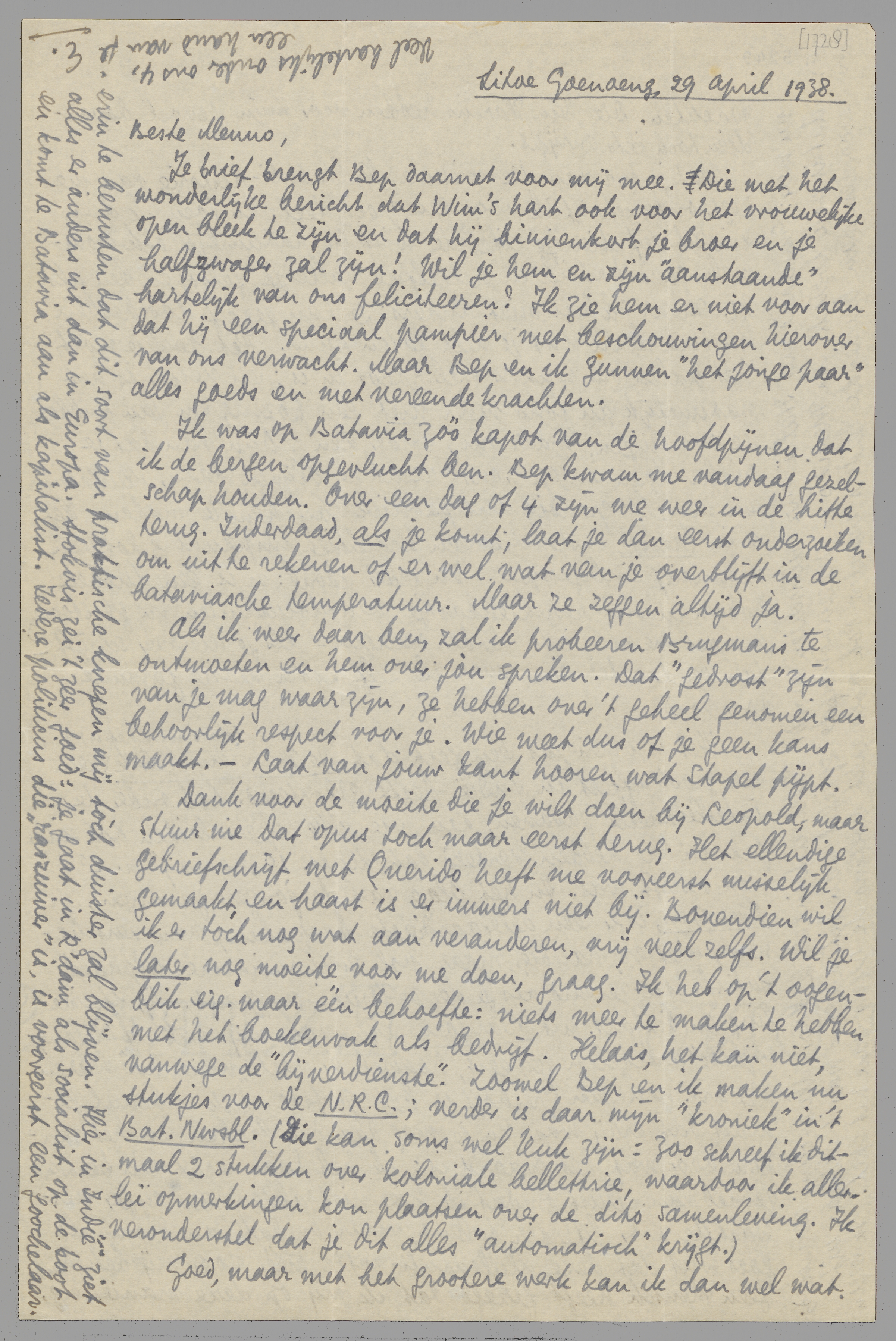 Je brief brengt Bep daarnet voor mij mee. Die met het wonderlijke bericht dat Wim's hart ook voor het vrouwelijke open bleek te zijn en dat hij binnenkort je broer en je halfzwager zal zijn! Wil je hem en zijn ‘aanstaande’ hartelijk van ons feliciteeren? Ik zie hem er niet voor aan dat hij een speciaal pampier met beschouwingen hierover van ons verwacht. Maar Bep en ik gunnen ‘het jonge paar’ alles goeds en met vereende krachten.