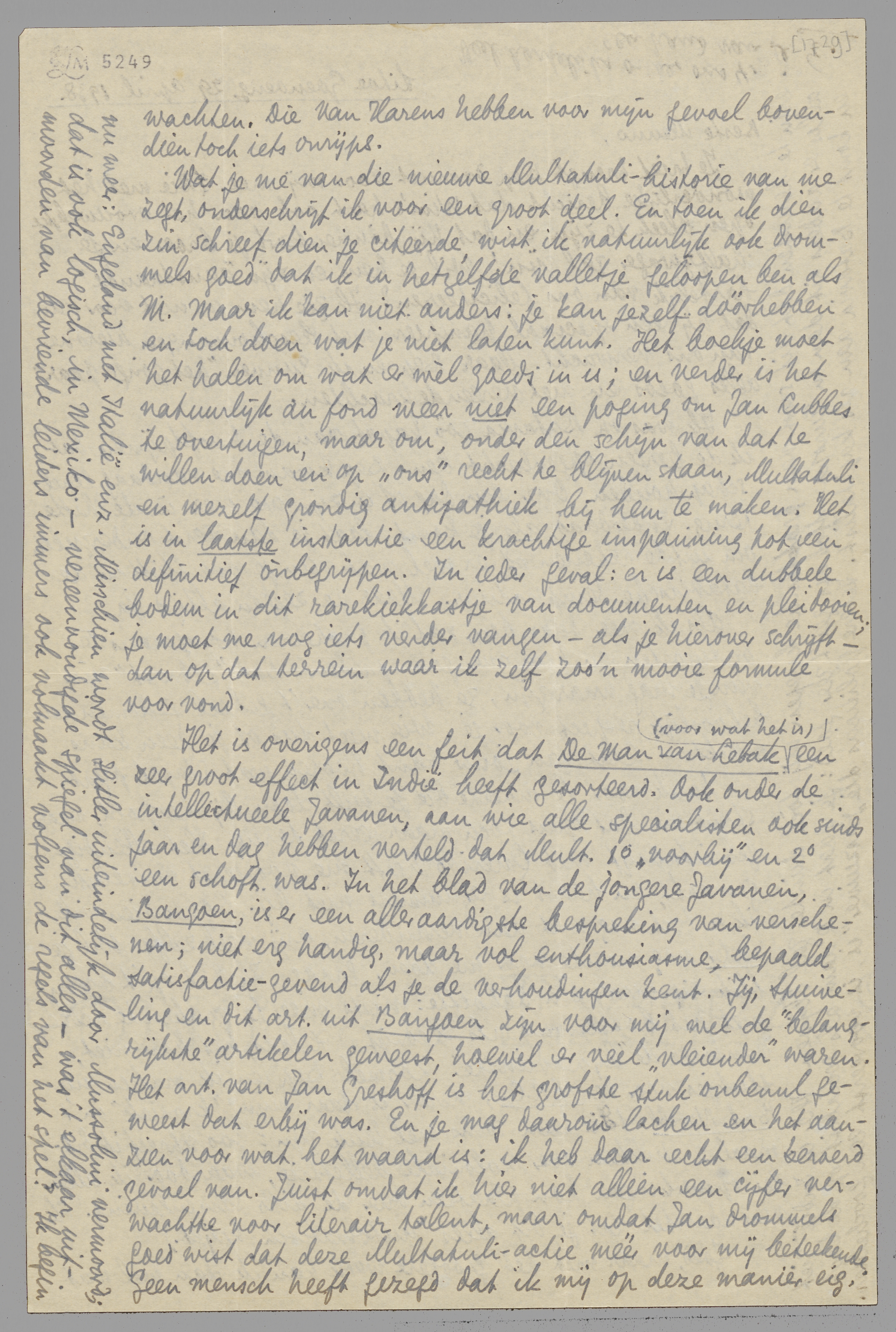 Het is overigens een feit dat De Man van Lebak (voor wat het is) een zeer groot effect in Indië heeft gesorteerd. Ook onder de intellectueele Javanen, aan wie alle specialisten ook sinds jaar en dag hebben verteld dat Mult. 1o ‘voorbij’ en 2o een schoft was. In het blad van de jongere Javanen, Bangoen, is er een alleraardigste bespreking van verschenen; niet erg handig, maar vol enthousiasme, bepaald satisfactie-gevend als je de verhoudingen kent. Jij, Stuiveling en dit art. uit Bangoen zijn voor mij wel de ‘belangrijkste’ artikelen geweest, hoewel er veel ‘vleiender’ waren. Het art. van Jan Greshoff is het grofste stuk onbenul geweest dat erbij was. En je mag daarom lachen en het aanzien voor wat het waard is: ik heb daar echt een beroerd gevoel van. Juist omdat ik hier niet alleen een cijfer verwachtte voor literair talent, maar omdat Jan drommels goed wist dat deze Multatuli-actie méér voor mij beteekende. Geen mensch heeft gezegd dat ik mij op deze manier eig. belachelijk maakte; het is om van te schrikken, maar niemand heeft dat (toch zoo voor de hand liggende) Lubbes-argument gebruikt. Behalve Jan.