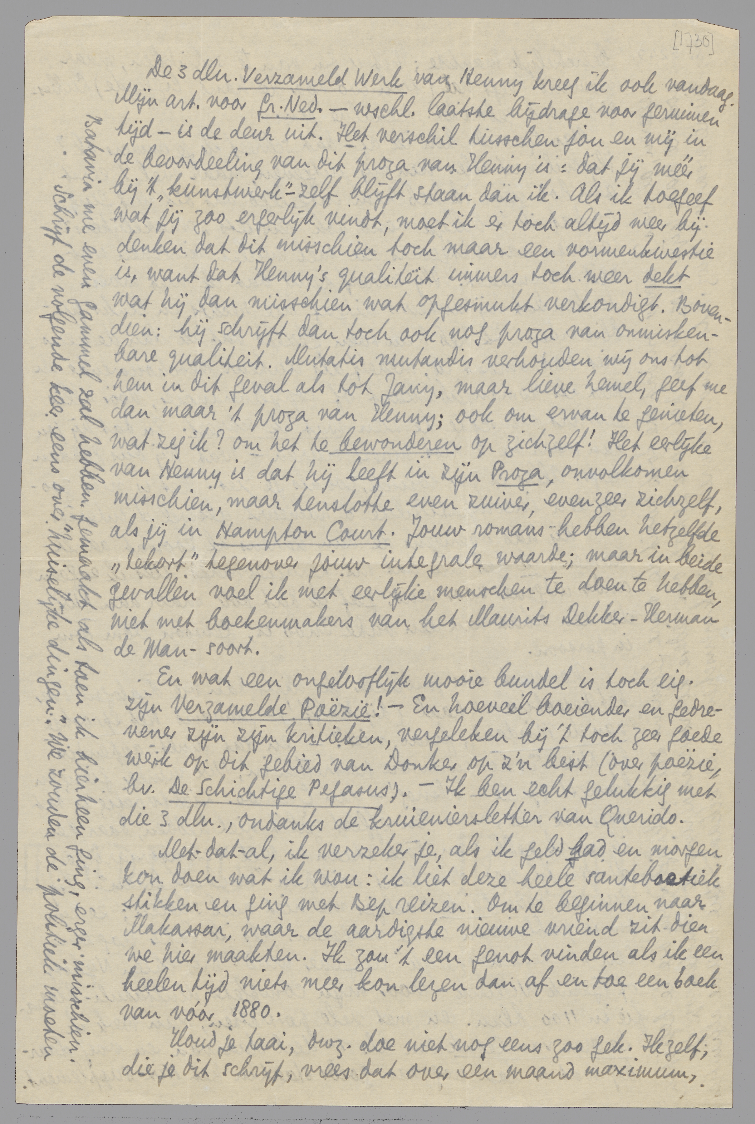 De 3 dln. Verzameld Werk van Henny kreeg ik ook vandaag. Mijn art. voor Gr. Ned. - wschl. laatste bijdrage voor geruimen tijd - is de deur uit. Het verschil tusschen jou en mij in de beoordeeling van dit proza van Henny is: dat jij méér bij 't ‘kunstwerk’ - zelf blijft staan dan ik. Als ik toegeef wat jij zoo ergerlijk vindt, moet ik er toch altijd weer bij denken dat dit misschien toch maar een vormenkwestie is, want dat Henny's qualiteit immers toch weer dekt wat hij dan misschien wat opgesmukt verkondigt. Bovendien: hij schrijft dan toch ook nog proza van onmiskenbare qualiteit. Mutatis mutandis verhouden wij ons tot hem in dit geval als tot Jany, maar lieve hemel, geef me dan maar 't proza van Henny; ook om ervan te genieten, wat zeg ik? om het te bewonderen op zichzelf! Het eerlijke van Henny is dat hij leeft in zijn Proza, onvolkomen misschien, maar tenslotte even zuiver, even zeer zichzelf, als jij in Hampton Court. Jouw romans hebben hetzelfde ‘tekort’ tegenover jouw integrale waarde; maar in beide gevallen voel ik met eerlijke menschen te doen te hebben, niet met boekenmakers van het Maurits Dekker-Herman de Man-soort.