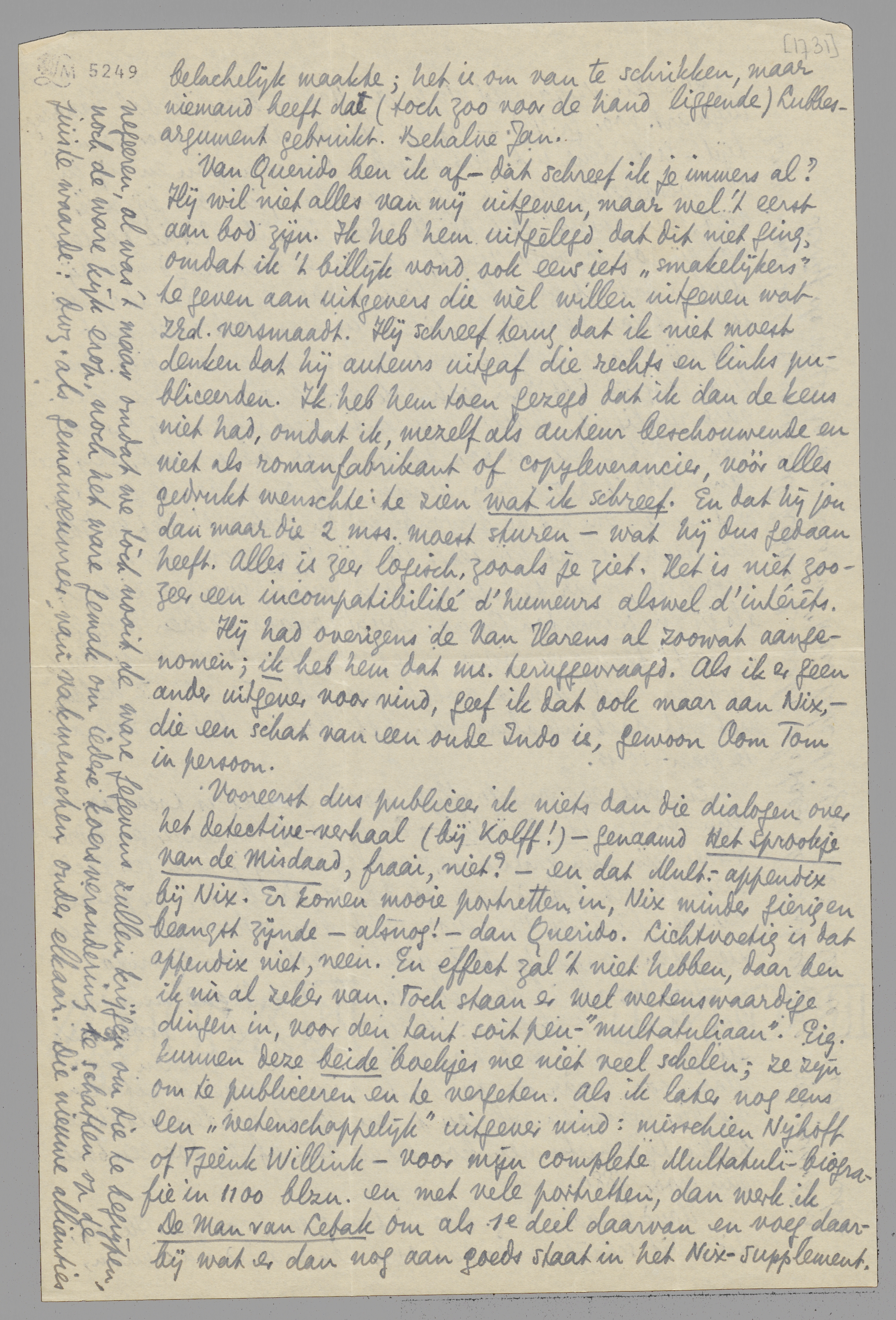 Dank voor de moeite die je wilt doen bij Leopold, maar stuur me dat opus toch maar eerst terug. Het ellendige gebriefschrijf met Querido heeft me vooreerst misselijk gemaakt, en haast is er immers niet bij. Bovendien wil ik er toch nog wat aan veranderen, vrij veel zelfs. Wil je later nog moeite voor me doen, graag. Ik heb op 't oogenblik eig. maar één behoefte: niets meer te maken te hebben met het boekenvak als bedrijf. Helaas, het kan niet, vanwege de ‘bijverdienste’. Zoowel Bep en ik maken nu stukjes voor de N.R.C.; verder is daar mijn ‘kroniek’ in 't Bat. Nwsbl. (Die kan soms wel leuk zijn: zoo schreef ik ditmaal 2 stukken over koloniale bellettrie, waardoor ik allerlei opmerkingen kon plaatsen over de dito samenleving. Ik veronderstel dat je dit alles ‘automatisch’ krijgt.)