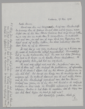 Je zegt dat je nog geen antwoord had op 2 brieven van je; maar ik antwoordde altijd onmiddellijk. Vermoedelijk heb je nu die antwoorden wèl. Eén was uit Sitoe Goenoeng, een oord in de bergen en de koelte, boven Soekaboemi. Ik schrijf spoedig beter, heb het nu erg druk.